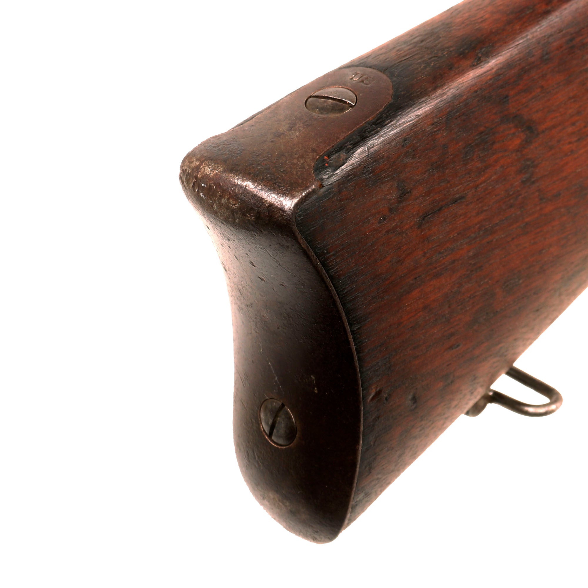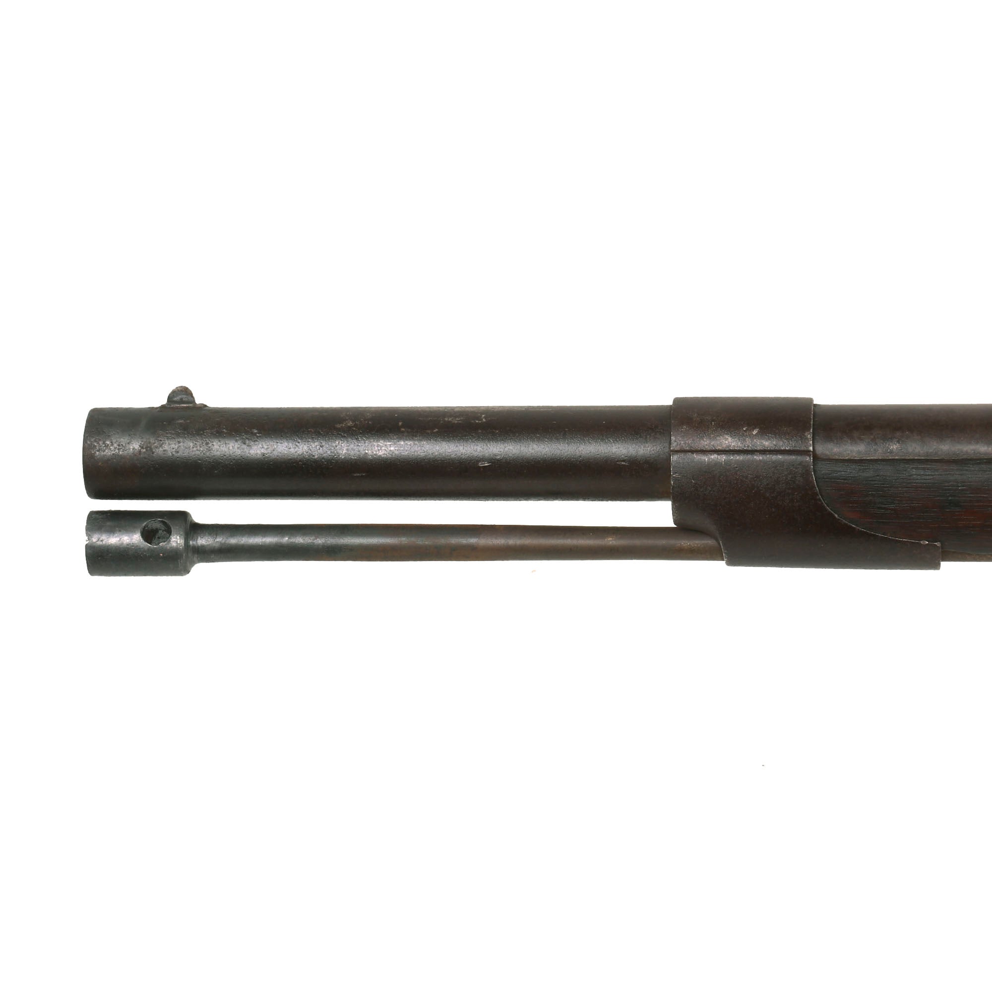 The barrel band and nose cap are both firmly secured with their original retaining springs. Sling swivels are original to the gun, and still move back and forth, though the butt swivel is a bit stiff. Under the barrel is a correct characteristic ramrod for this rifle, with the large barrel-shaped end. The original 1000 Yard rear ladder sight is still fitted in place, with all parts intact and fully functional. The lock functions correctly, holding at full cock and releasing only at full cock. The cap percussion nipple cone on this example is a recent replacement. We checked the bore, and it is in great service-used shape, with still-distinct lands & grooves. There is a bit of fouling and dirt present, but for a Civil War black powder rifle, the bore of this example is in good condition.