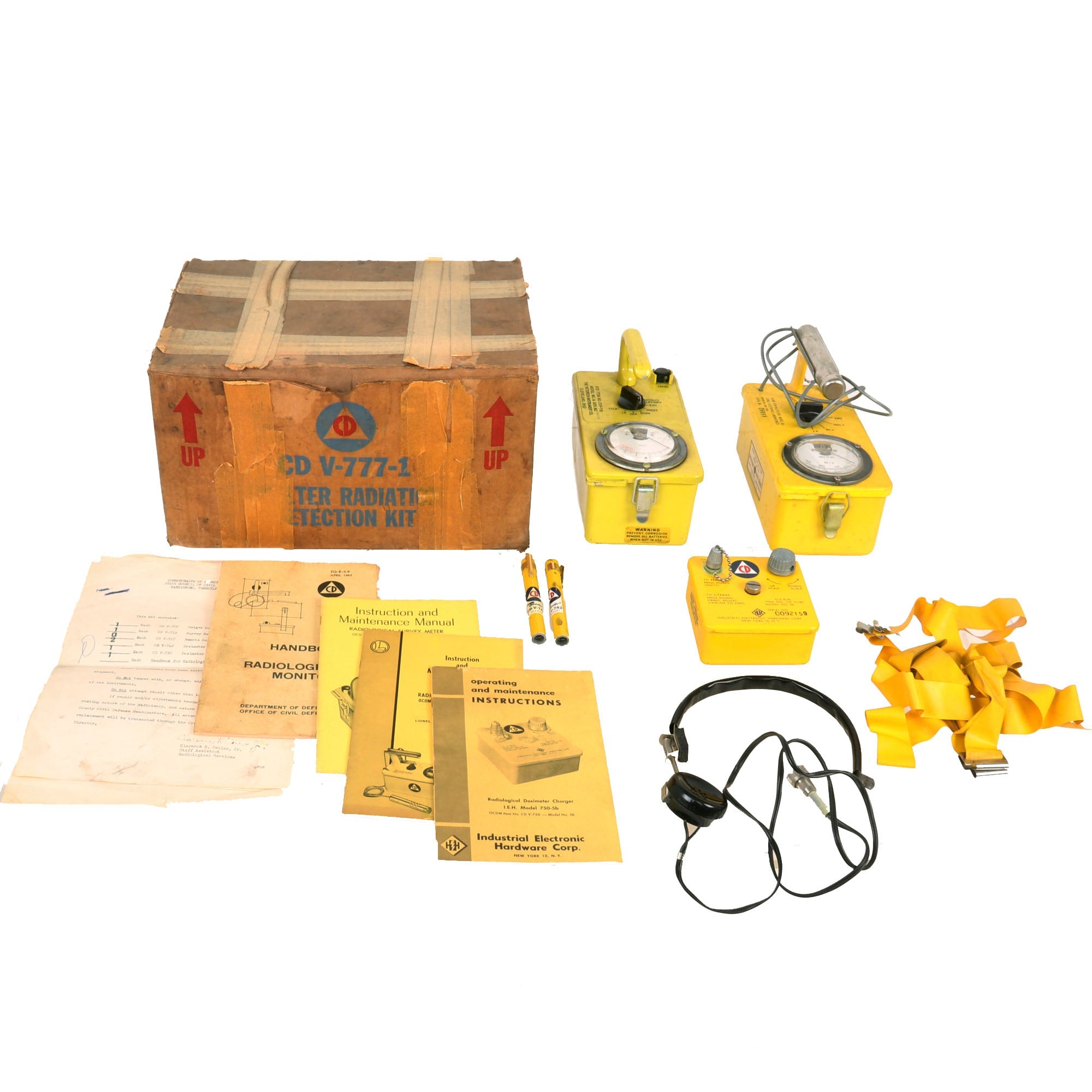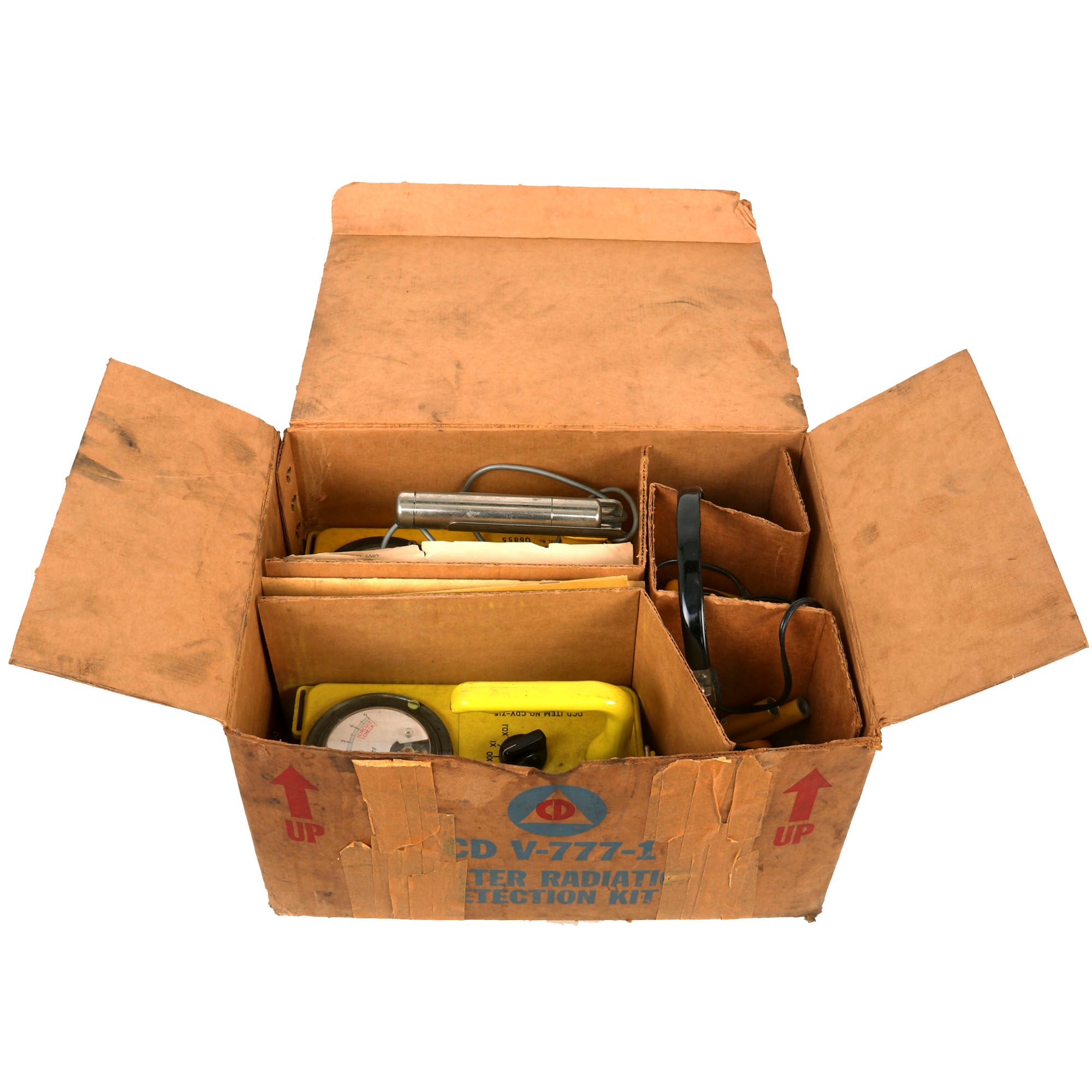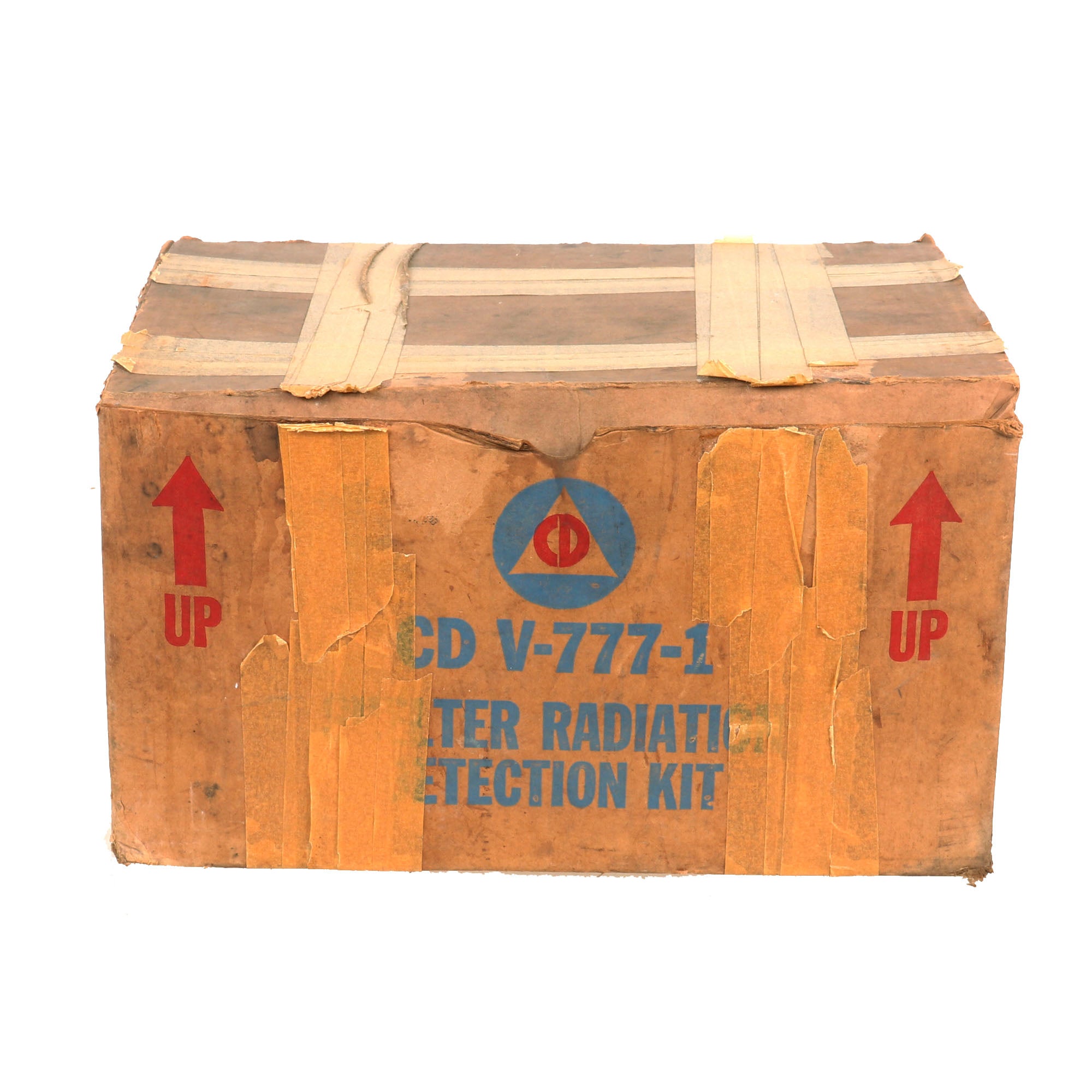 Original Items: Only One Set Available. According to the 1962 and 1963 annual reports of the Office of Civil Defense (OCD), the CD V-777-1 set, first produced in 1962, was intended for use in public fallout shelters. By 1978, when Radiological Defense Preparedness (CPG 2-6.1) was published, that job had been given to the CD V-777-2 set, and the CD V-777-1 was now an "alternate set for emergency service organization use." The older boxes (with the word "kit" on them) were produced when the CD V-777-1 served its original role as the primary set employed in fallout shelters. The box above right (with the word "set" on it) was produced later when the CD V-777-1 became the alternate set for use by emergency service personnel.