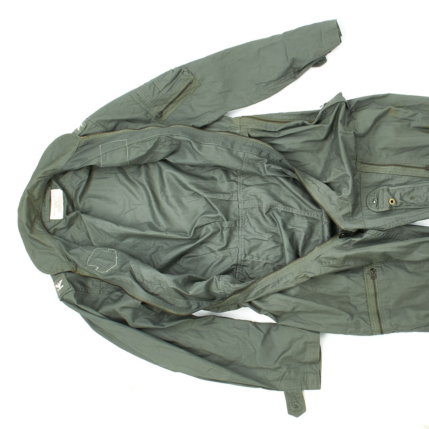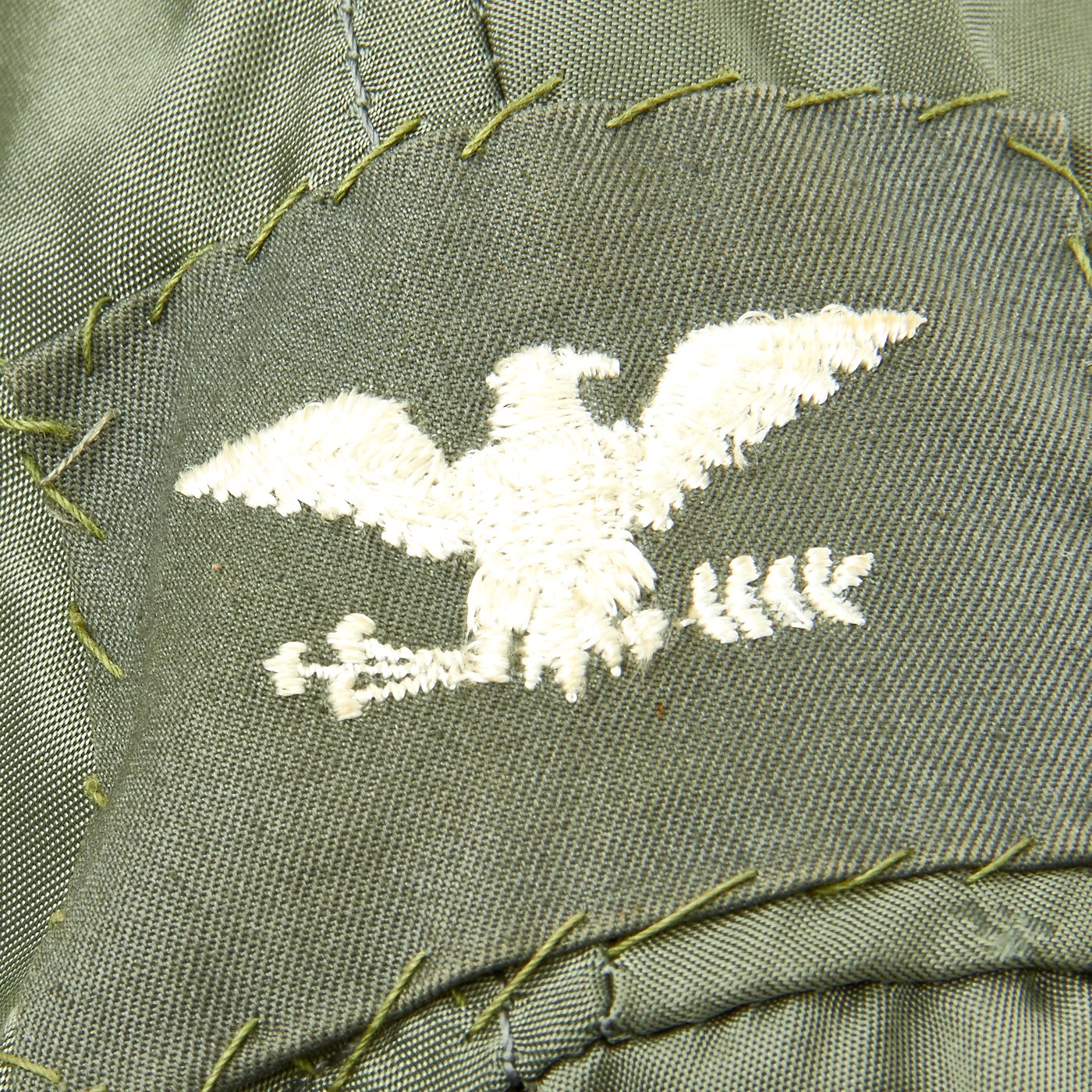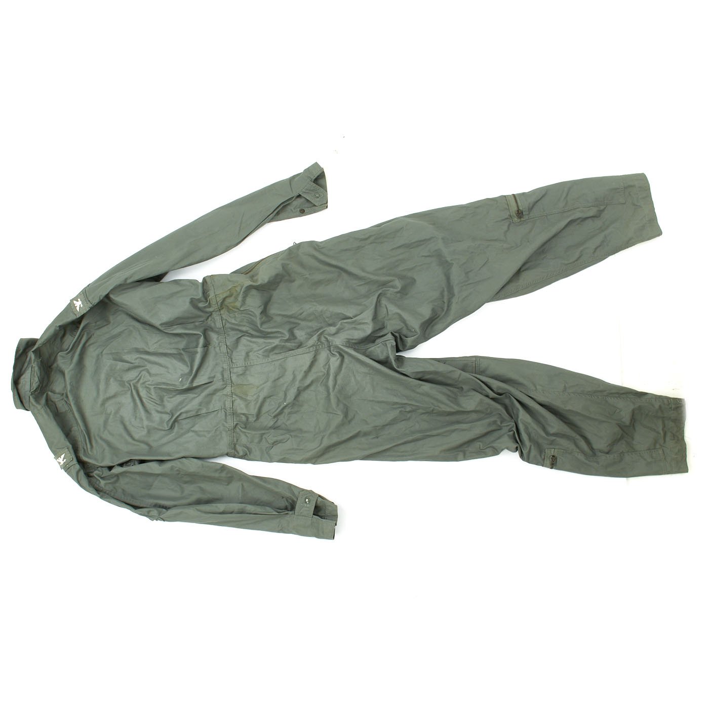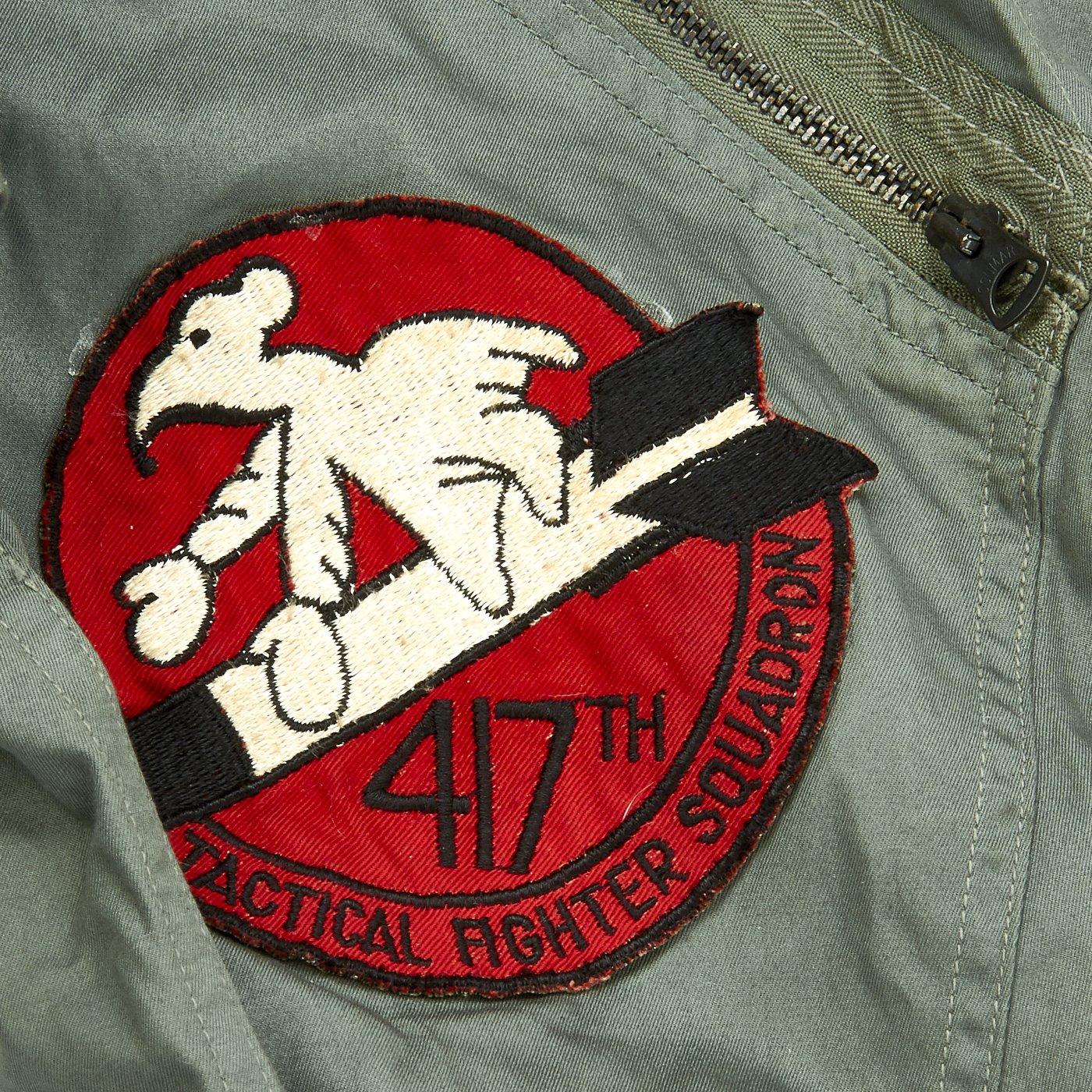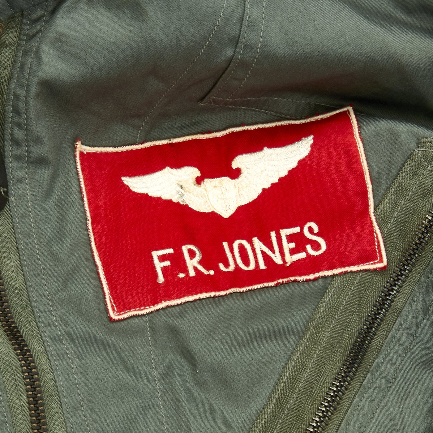 Also included is a flight suit in approximate size 42". Inside tag reads, Coveralls, Flying, Man's, Very Light K-2B LARGE LONG. Suit is in excellent condition and features a 417th Tactical Fighter Squadron insignia patch, Colonel's insignia, Air Training Command and name tag F.R. Jones.