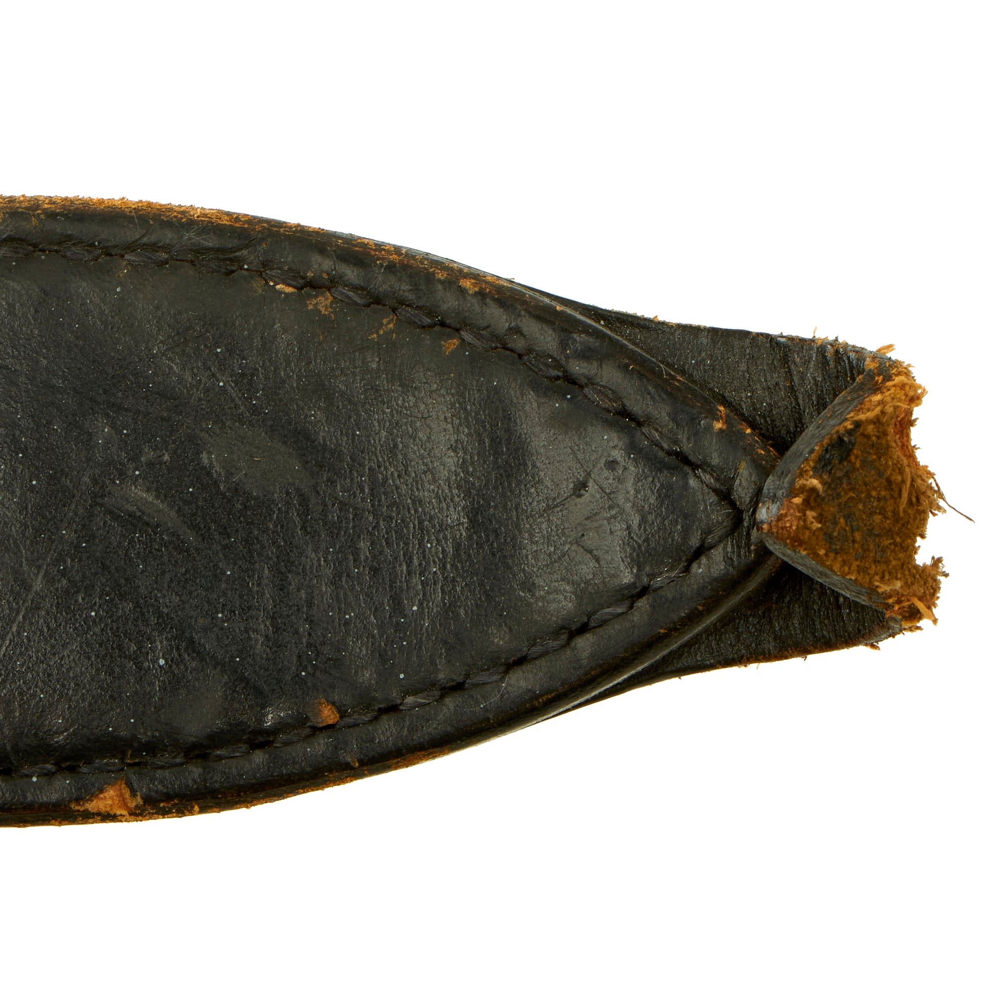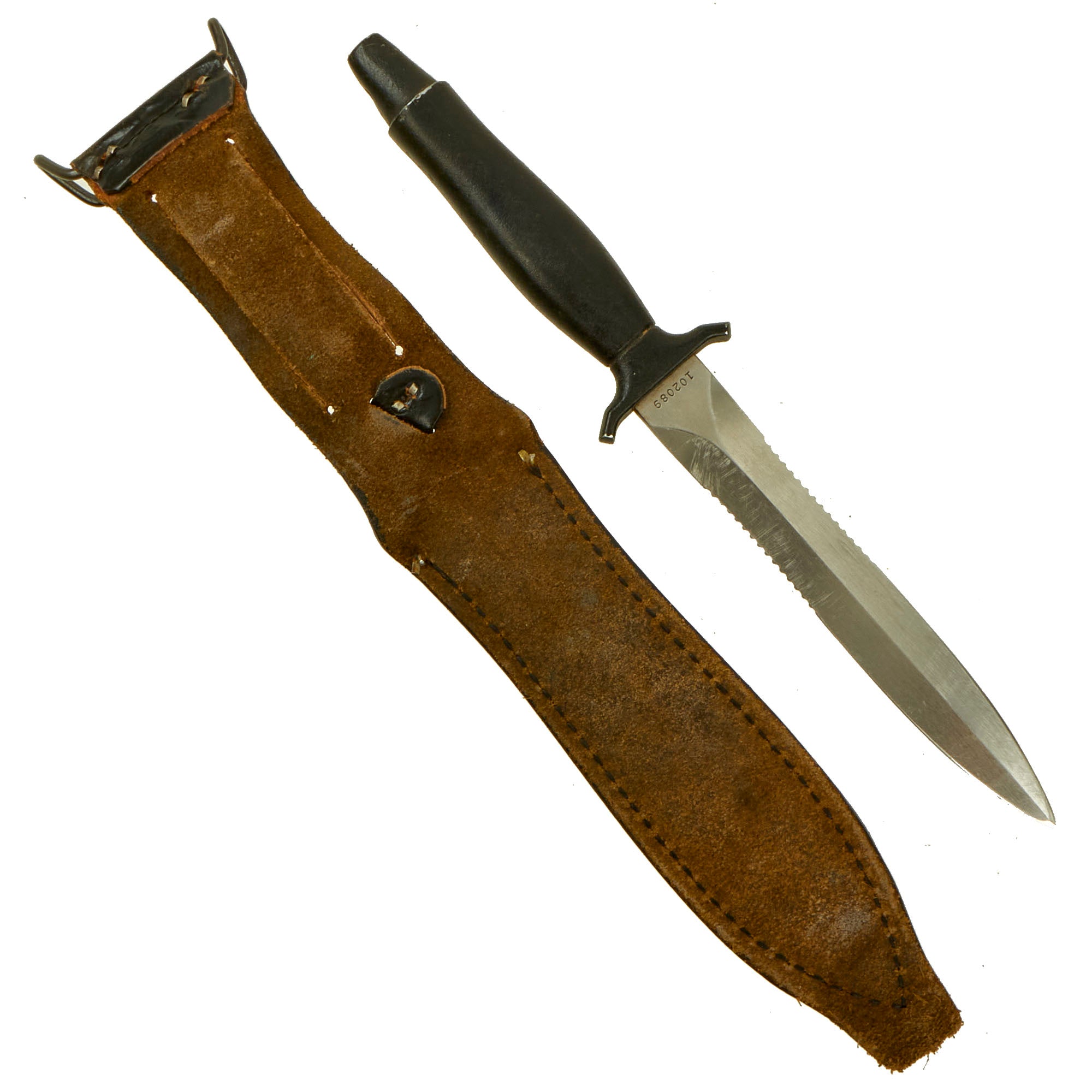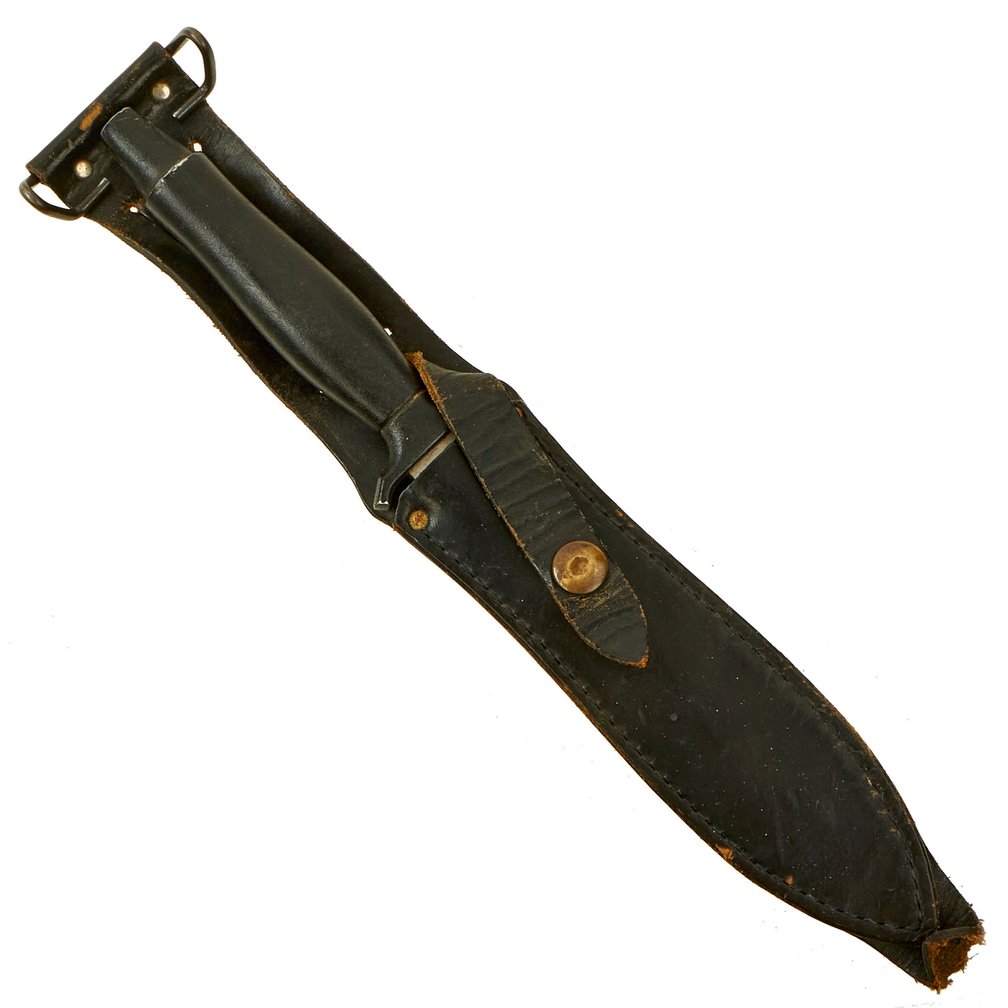 The wear on both the knife and sheath are consistent with service wear and use, but are without damage. There is some paint loss on the cast aluminum cross guard and pommel, but no corrosion is present. The blade is without any significant damage, though it does show some sharpening on the edge, which looks to have been done in the field. The included belt scabbard has a lovely matured leather color, and is fully functional, showing only light war. The only issue is that the leg tie down is missing, but could easily be replaced.
