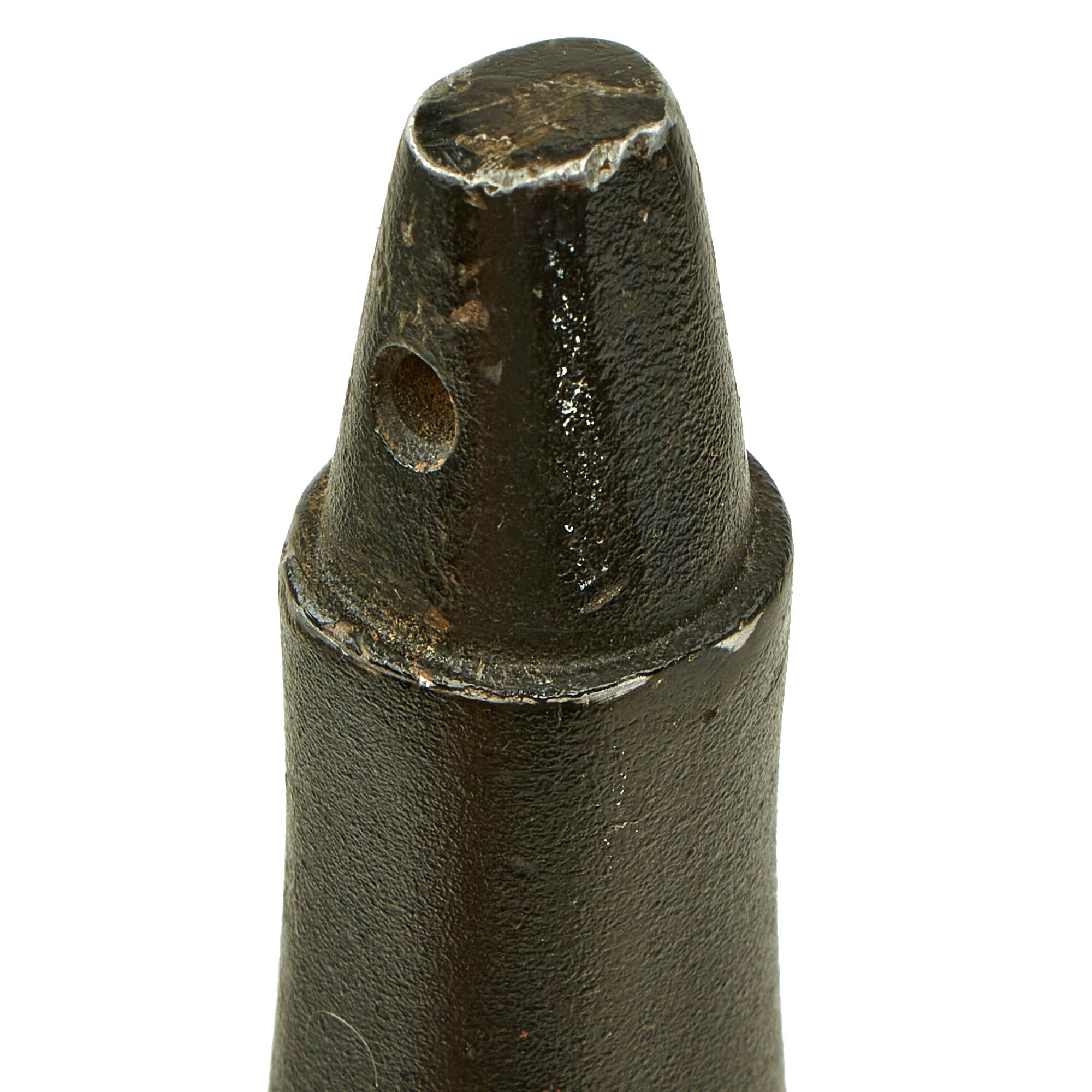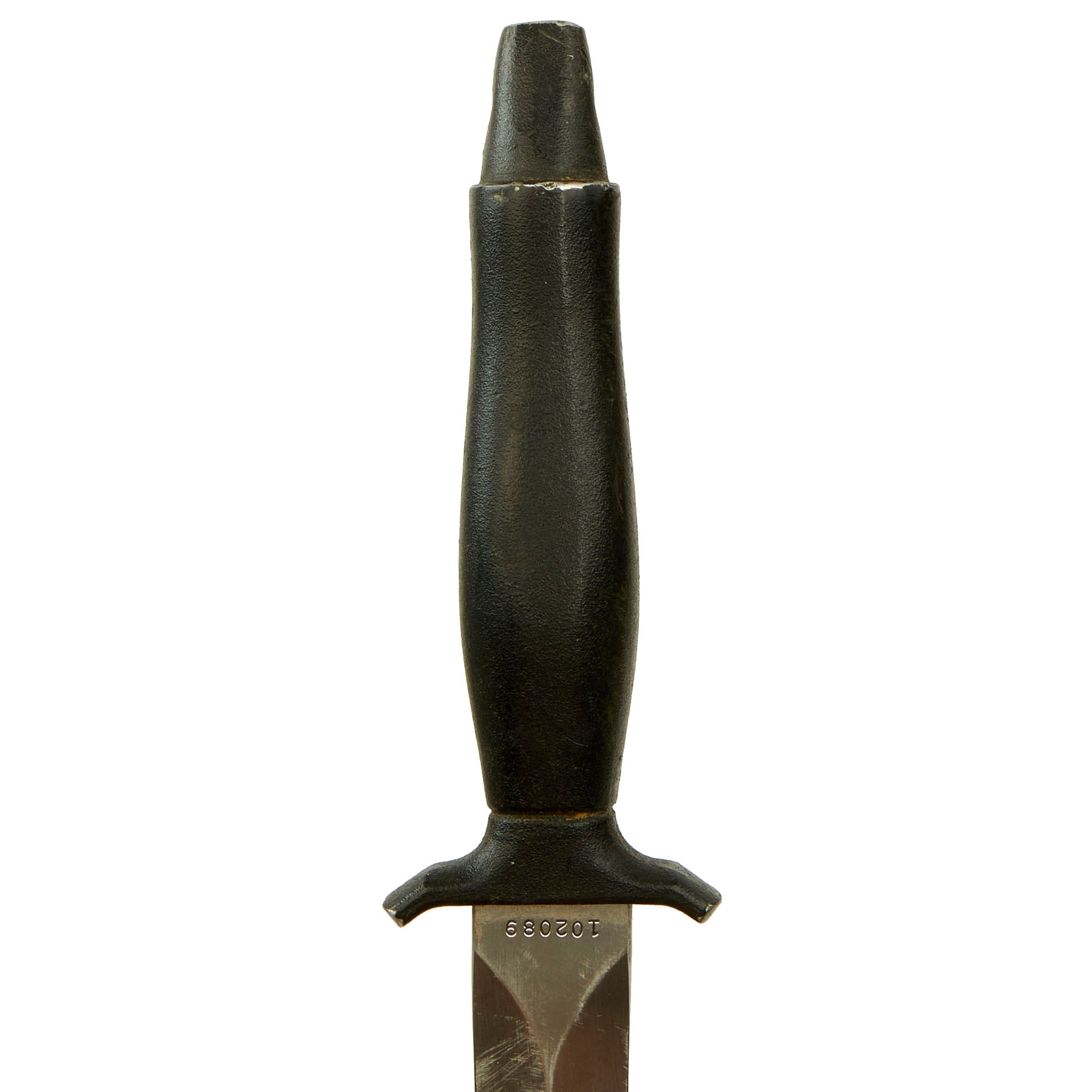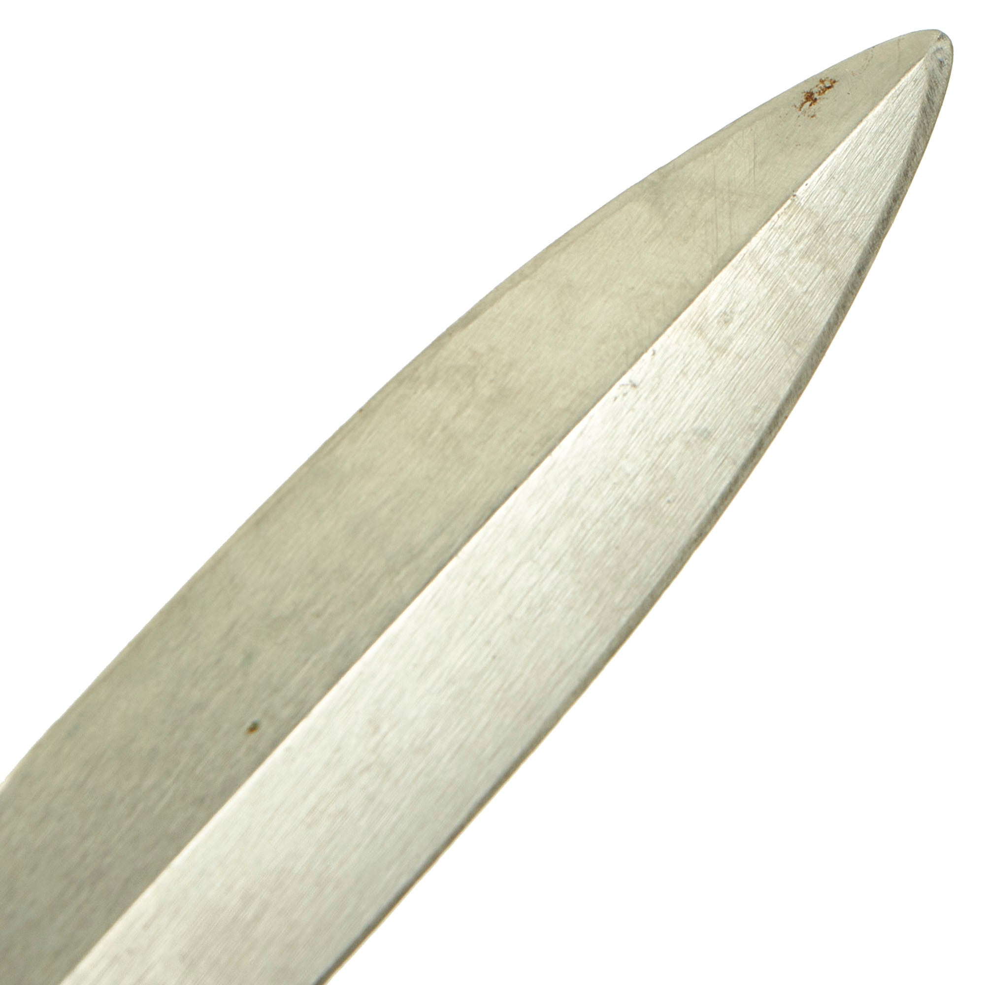 The wear on both the knife and sheath are consistent with service wear and use, but are without damage. There is some paint loss on the cast aluminum cross guard and pommel, but no corrosion is present. The blade is without any significant damage, though it does show some sharpening on the edge, which looks to have been done in the field. The included belt scabbard has a lovely matured leather color, and is fully functional, showing only light war. The only issue is that the leg tie down is missing, but could easily be replaced.