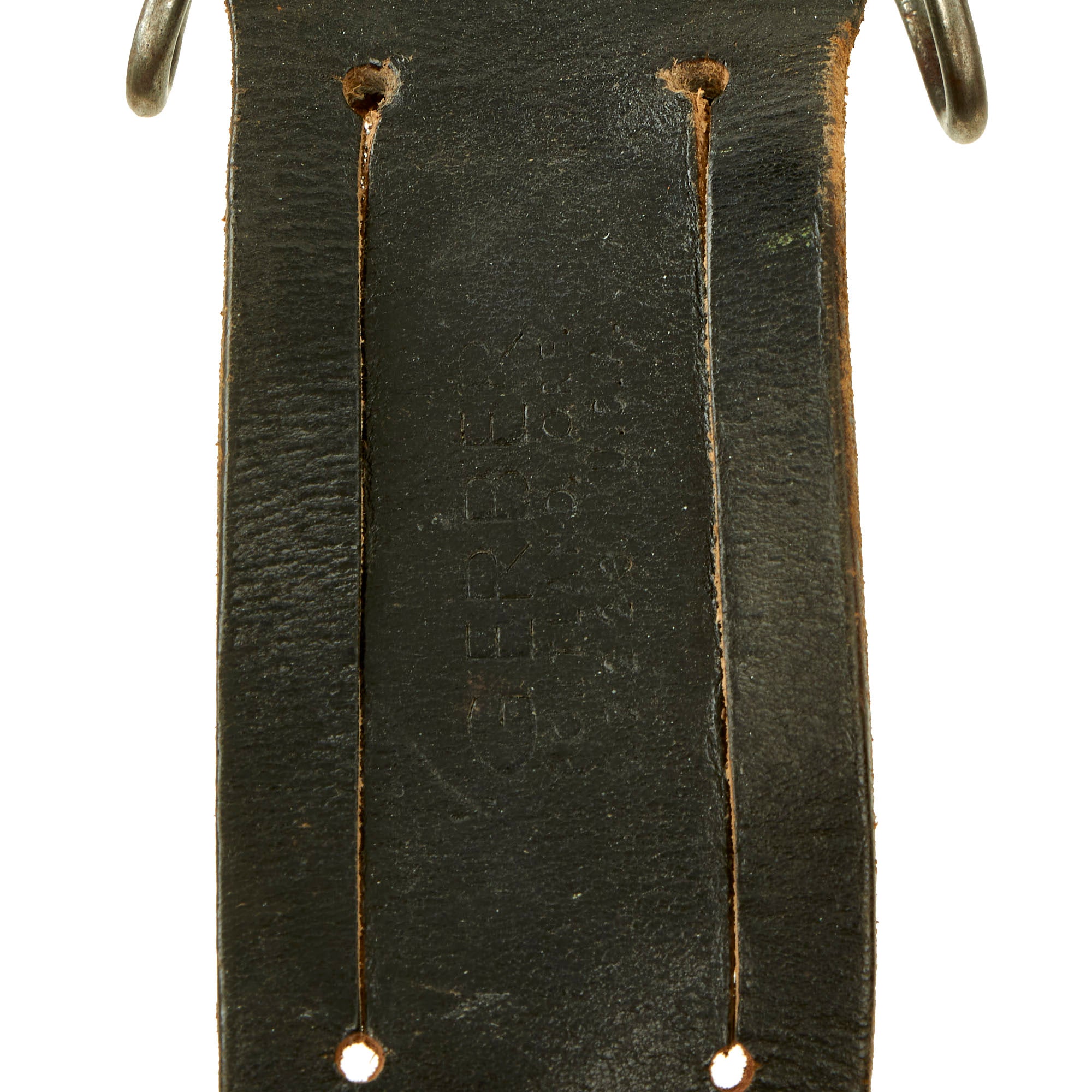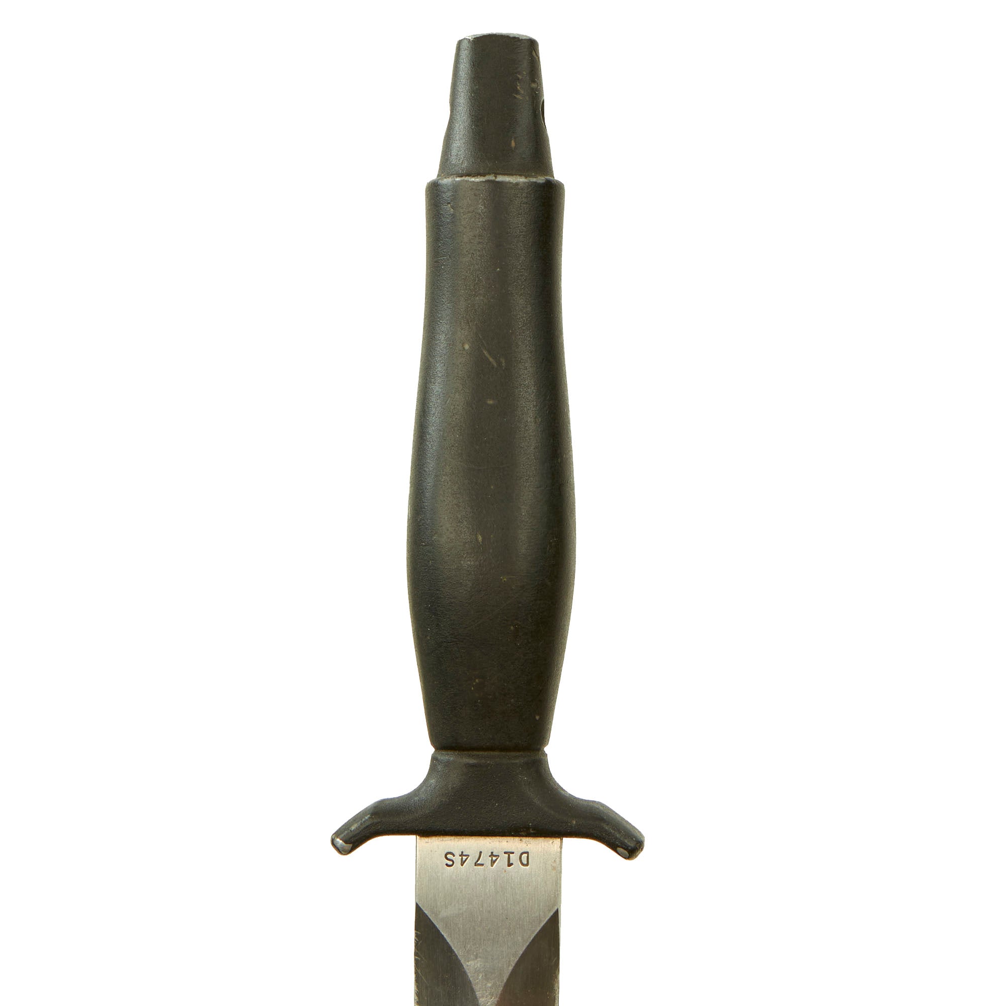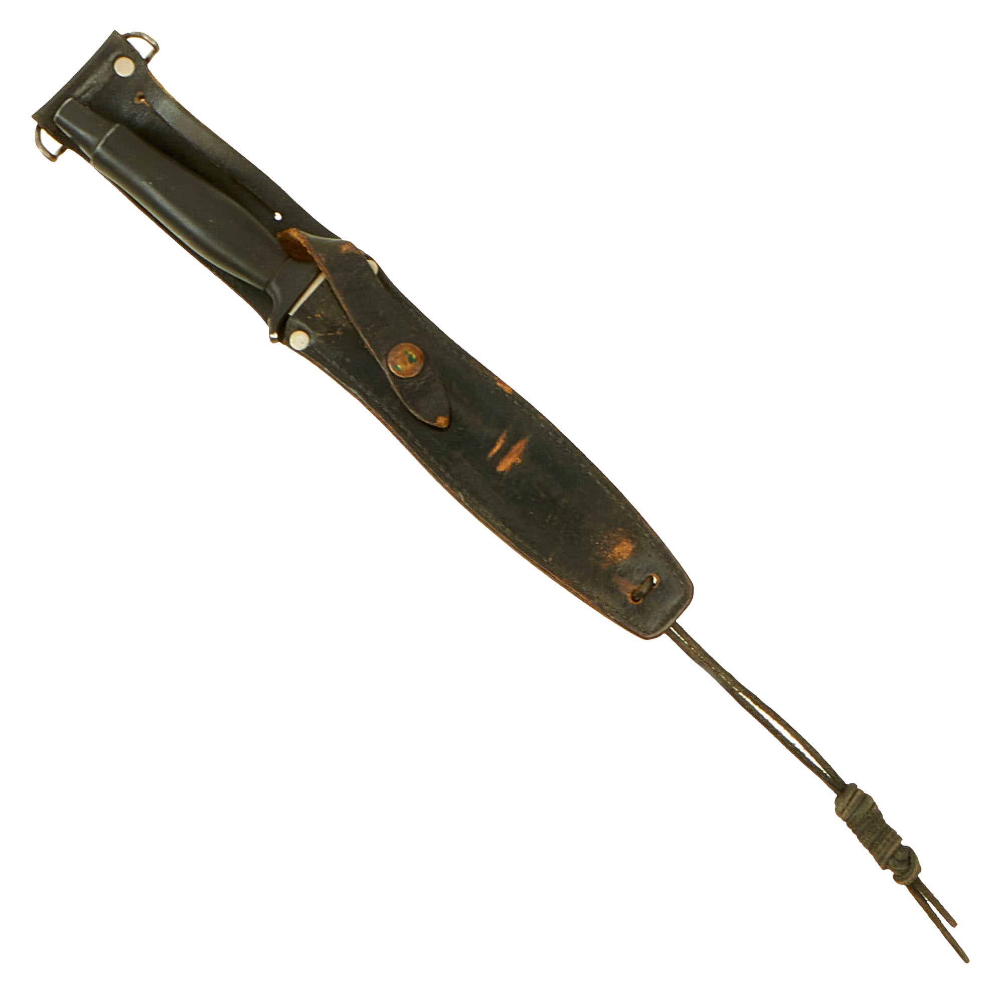 The wear on both the knife and sheath are consistent with service wear and use, but are without damage. There is some paint loss on the cast aluminum cross guard and pommel, but no corrosion is present. The blade is without any significant damage, though it does show some sharpening on the edge, which looks to have been done in the field. The included belt scabbard has a lovely matured leather color, and is fully functional, showing only light war. The only issue is that the leg tie down is missing, but could easily be replaced.