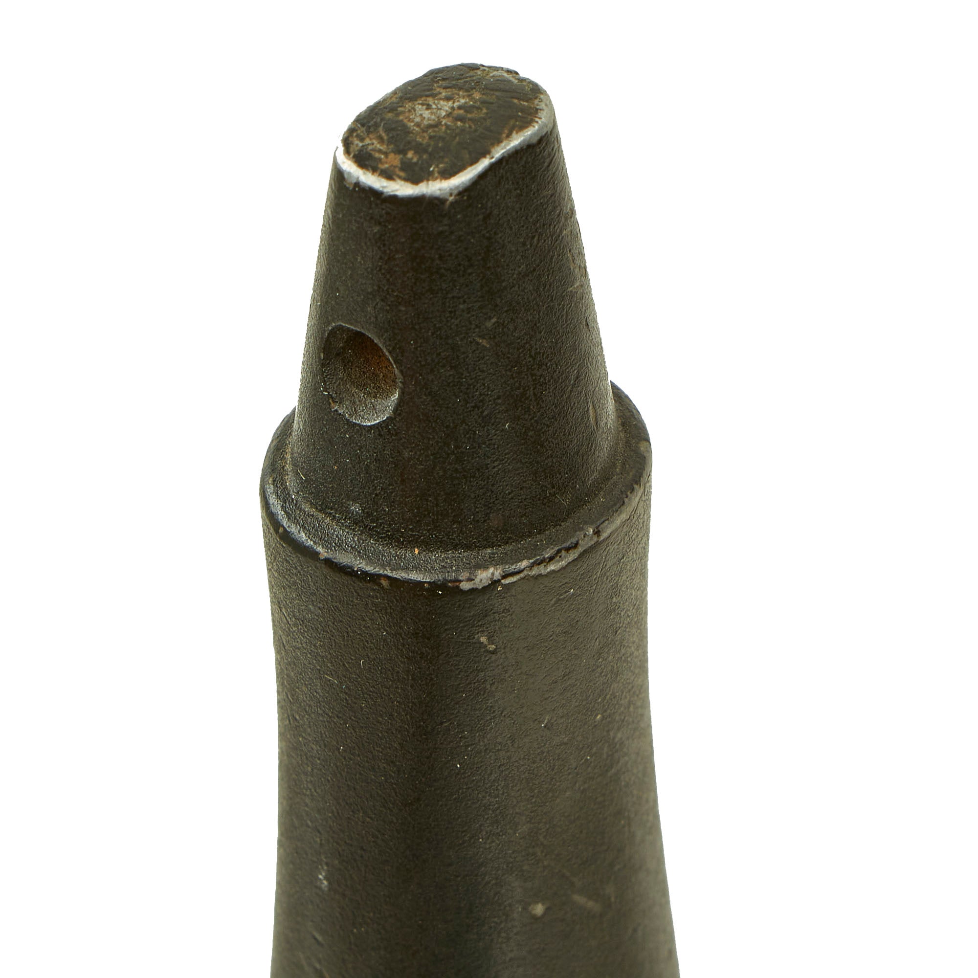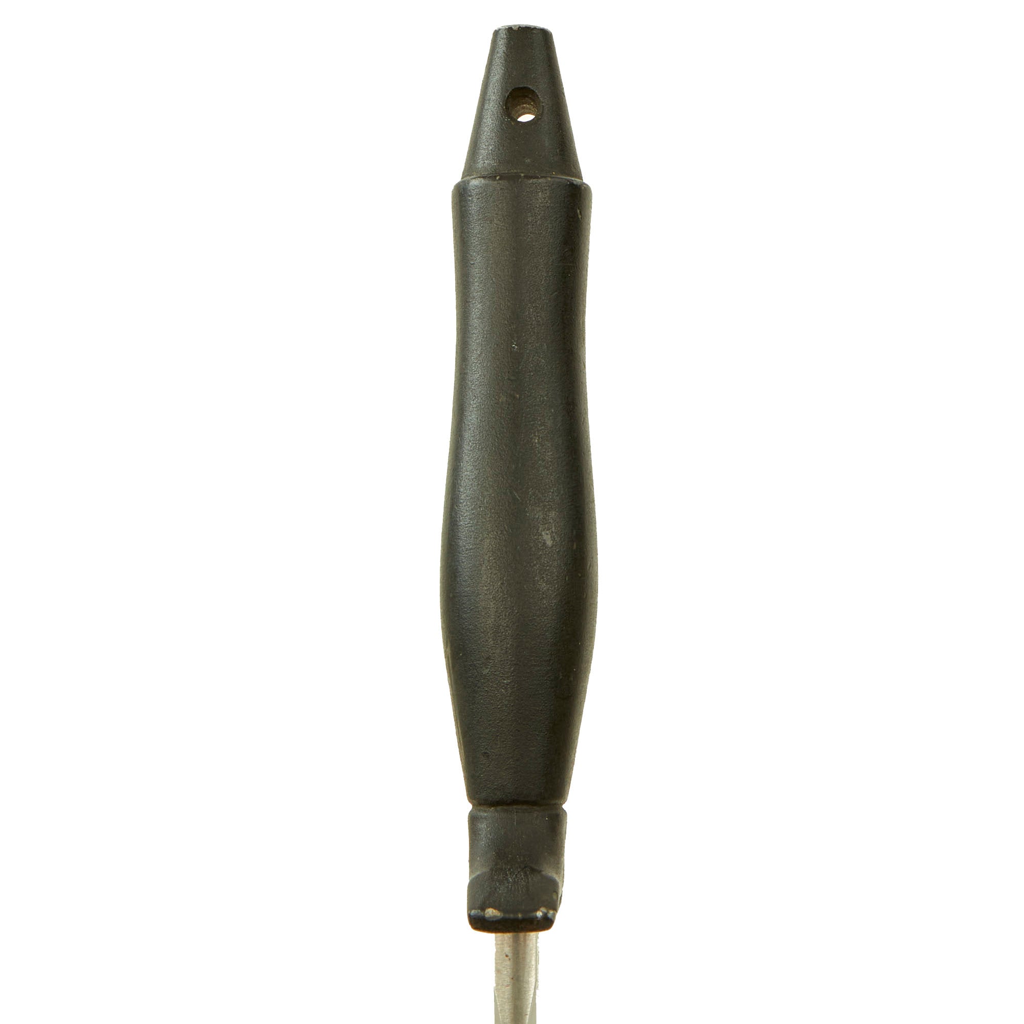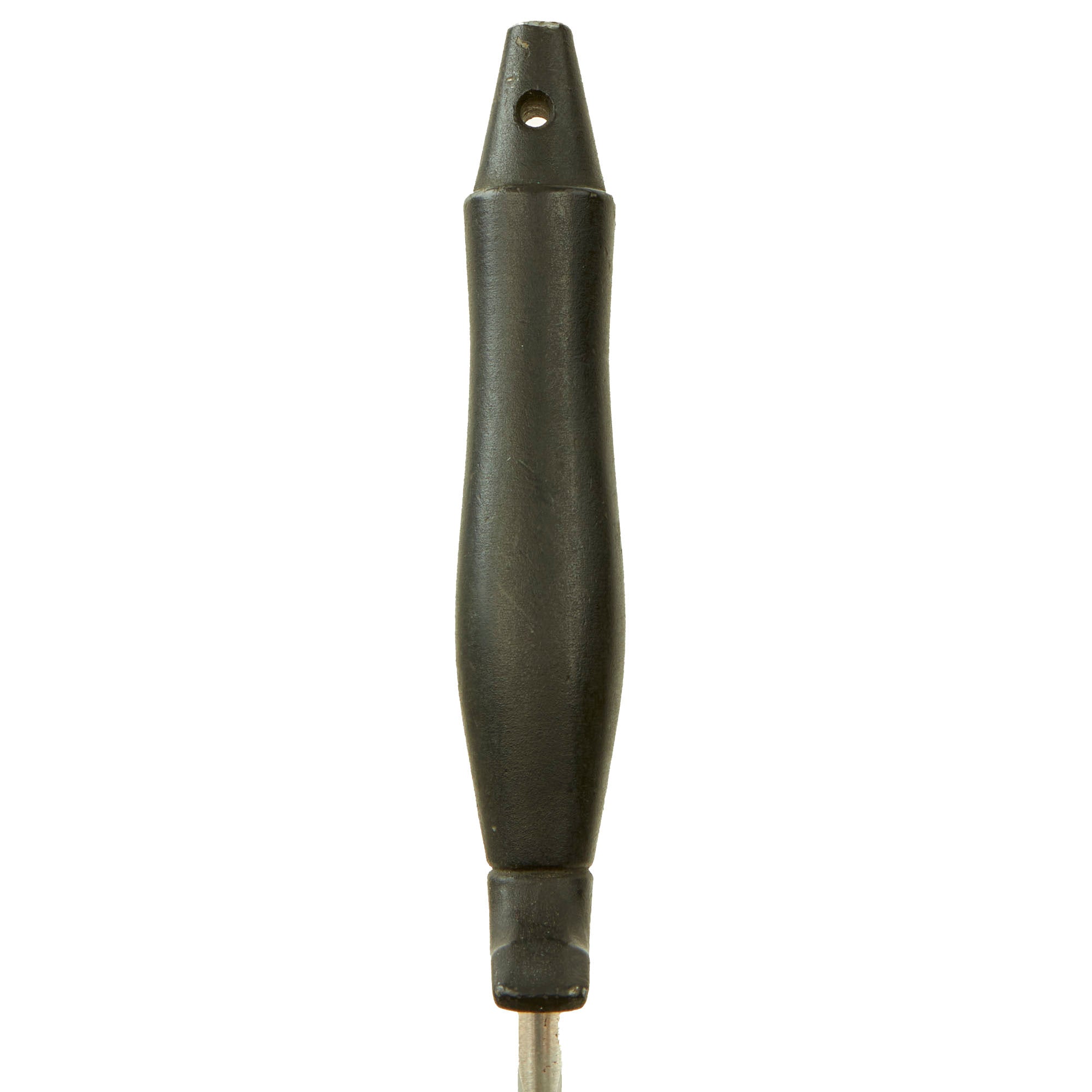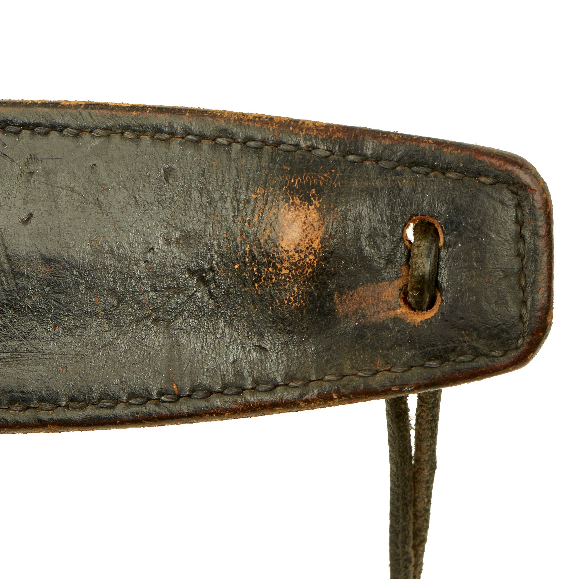 The wear on both the knife and sheath are consistent with service wear and use, but are without damage. There is some paint loss on the cast aluminum cross guard and pommel, but no corrosion is present. The blade is without any significant damage, though it does show some sharpening on the edge, which looks to have been done in the field. The included belt scabbard has a lovely matured leather color, and is fully functional, showing only light war. The only issue is that the leg tie down is missing, but could easily be replaced.
