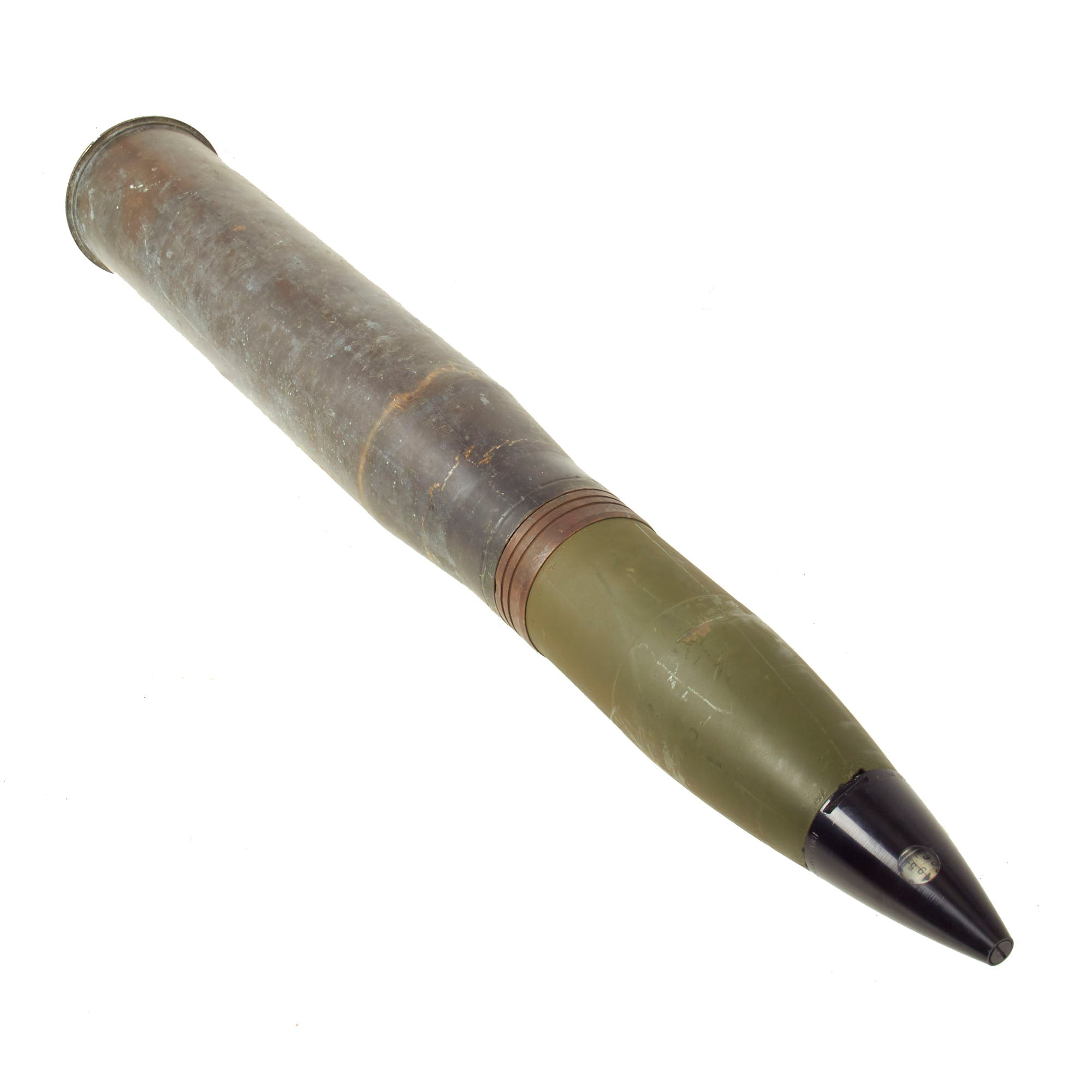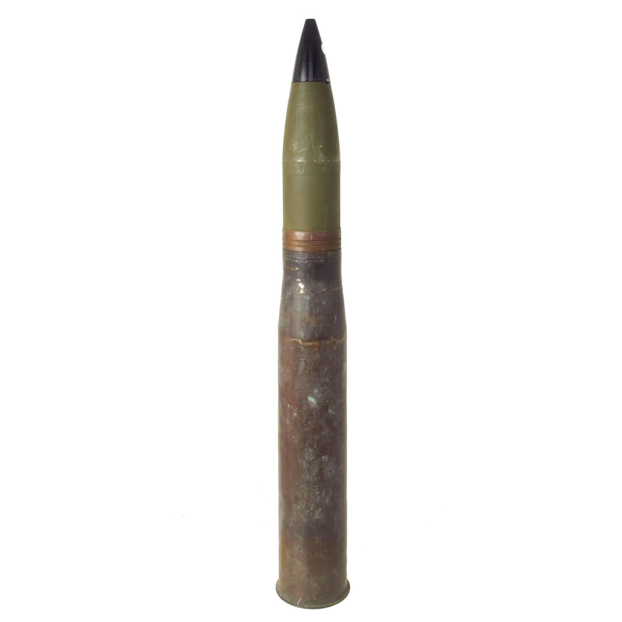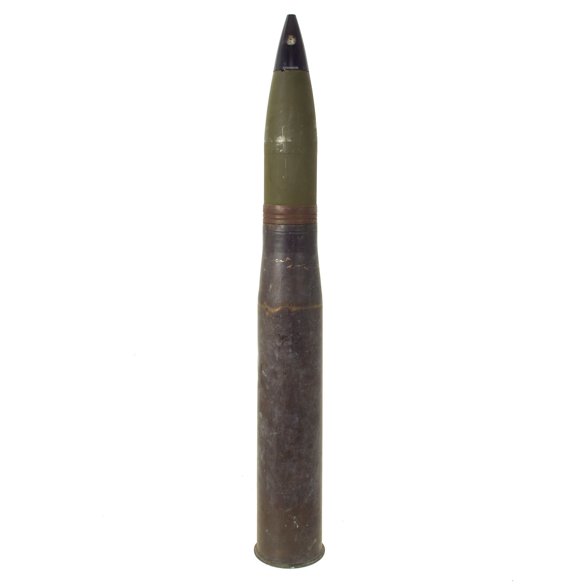 This cartridge is for use in training in marksmanship. The cartridge is similar to and a ballistic match for the HE cartridge M71, except that the projectile is inert and assembled with a dummy fuse. The total length of the cartridge is approximately 37” tall and is extremely top heavy, so be mindful when displaying! All original markings and stampings are present and still easily read though the round itself was repainted.