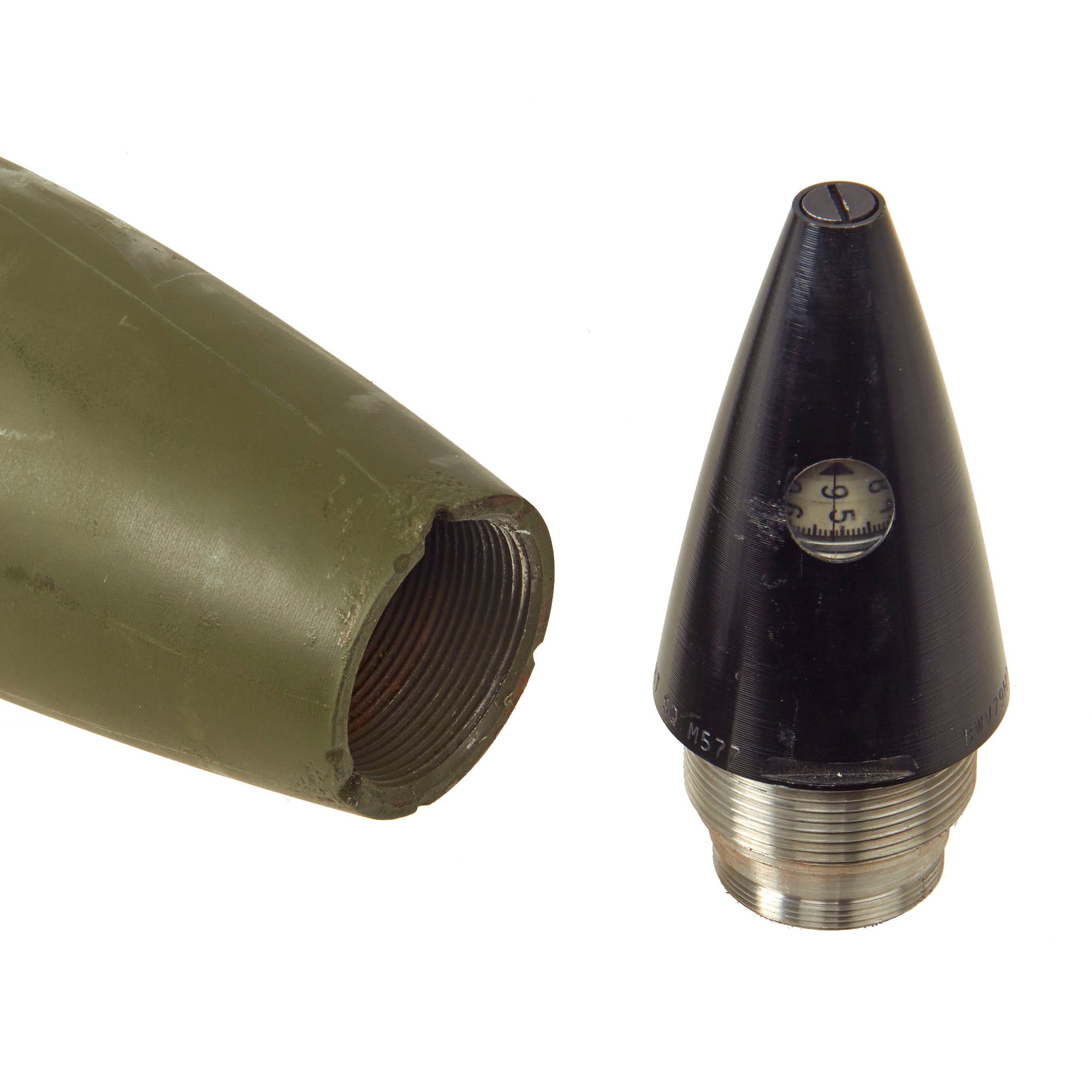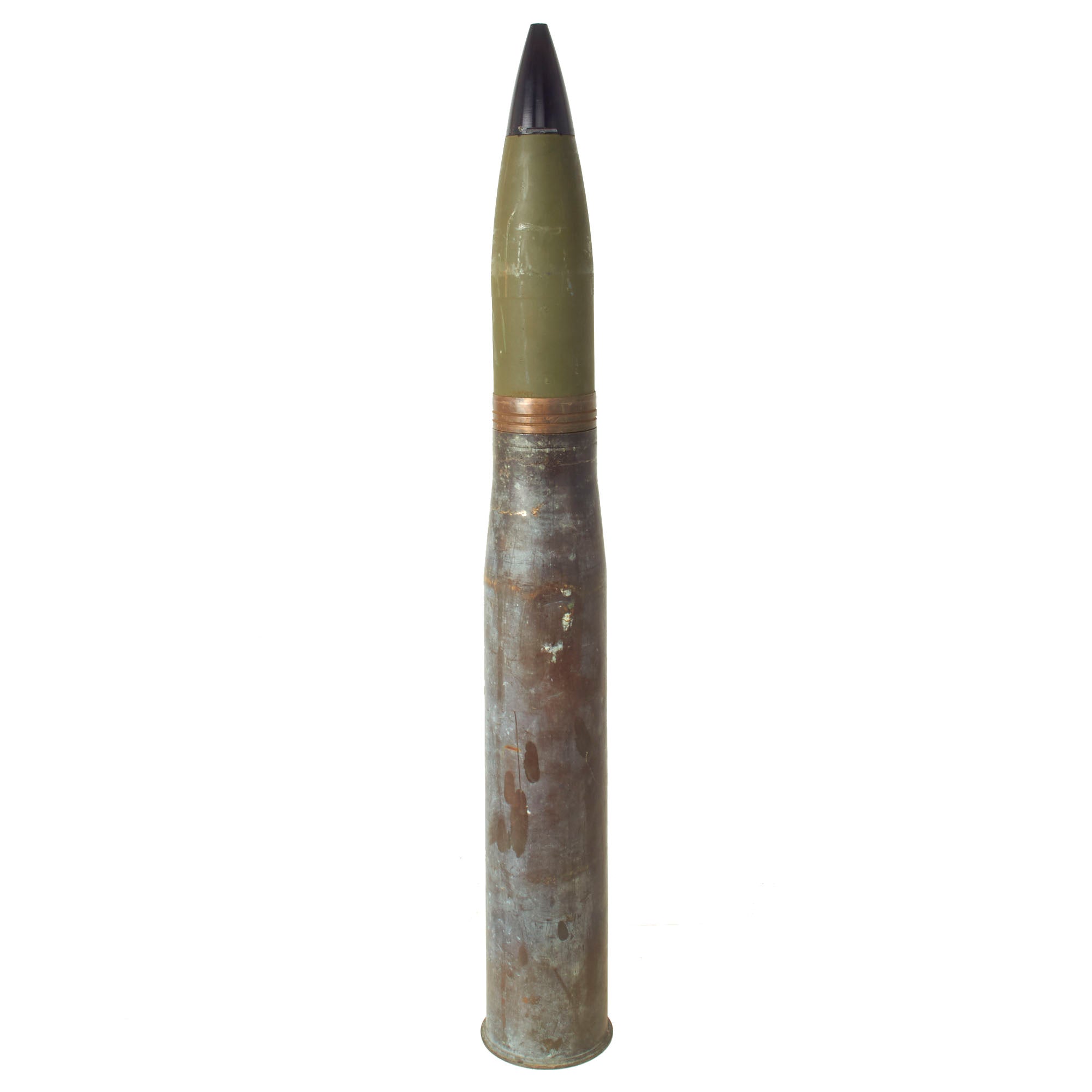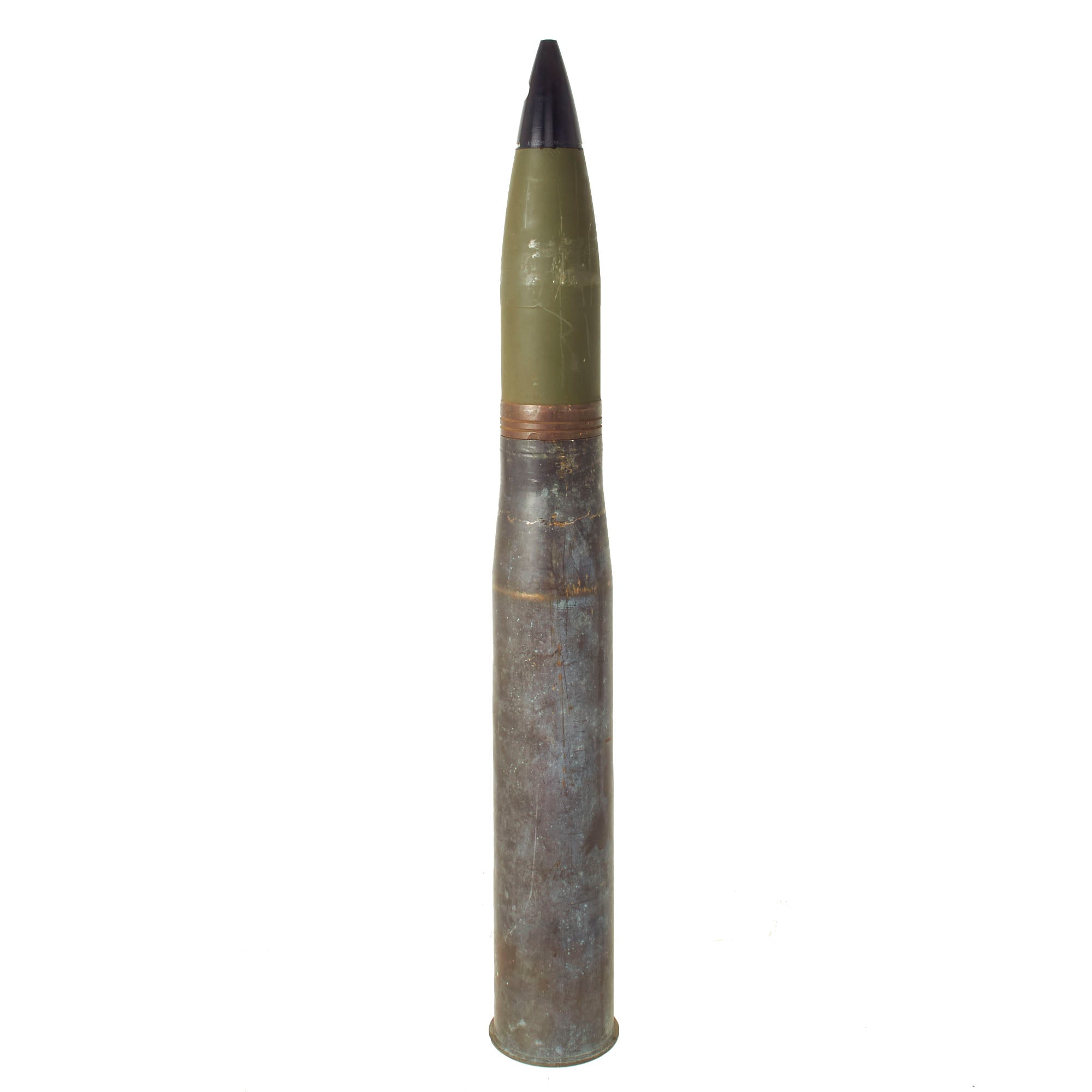 This cartridge is for use in training in marksmanship. The cartridge is similar to and a ballistic match for the HE cartridge M71, except that the projectile is inert and assembled with a dummy fuse. The total length of the cartridge is approximately 37” tall and is extremely top heavy, so be mindful when displaying! All original markings and stampings are present and still easily read though the round itself was repainted.