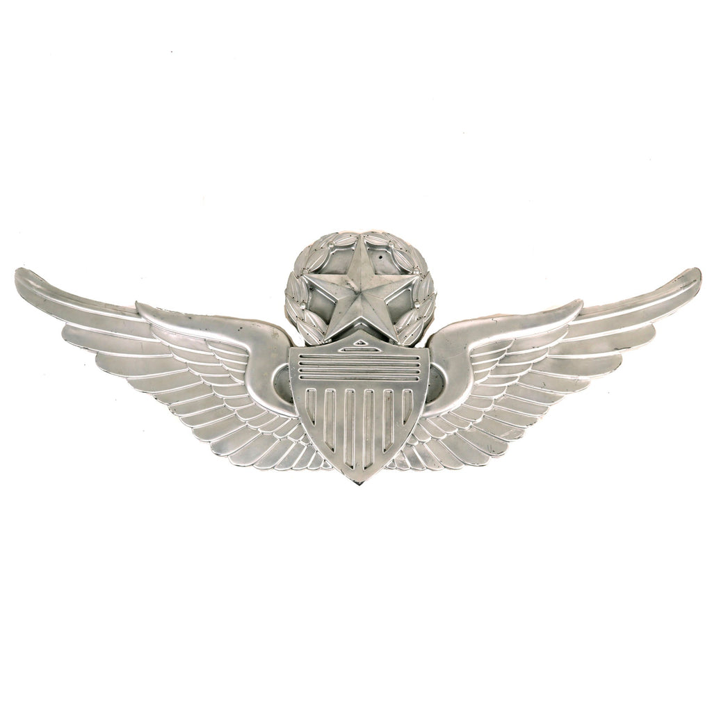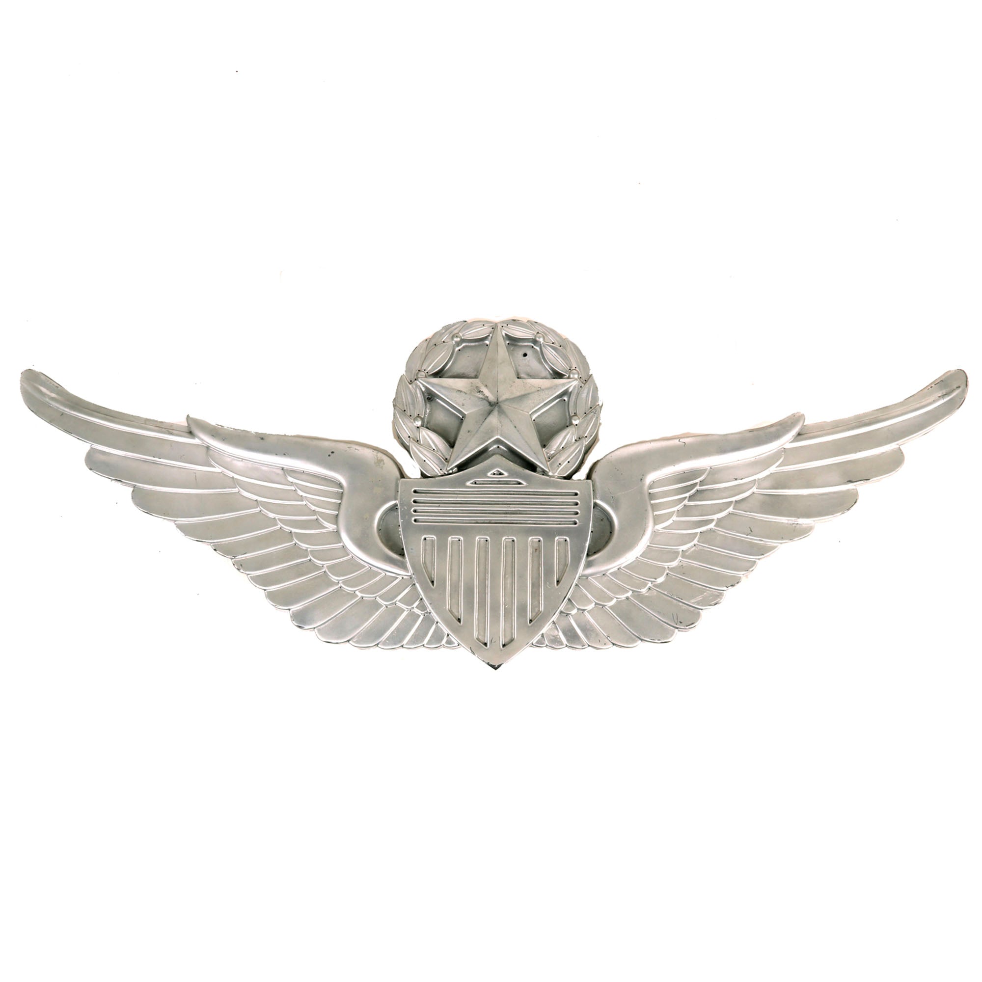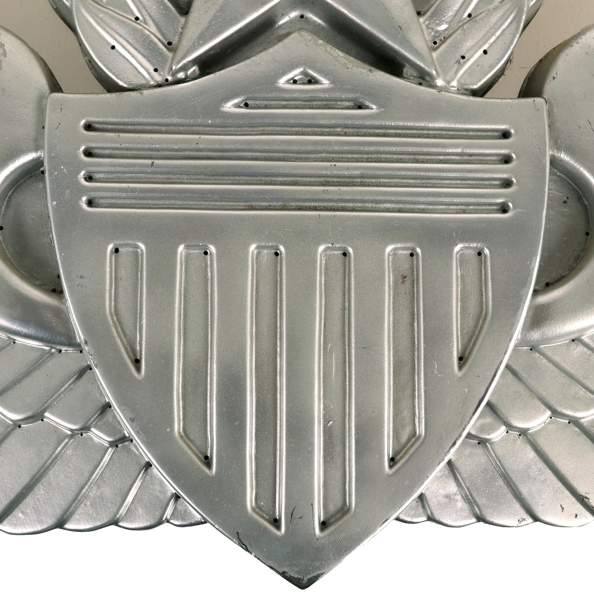 Original Item: Only One Available. This set of aviator wings is truly magnificent in size, made from high-quality aluminum exterior with a wood core. It appears to be a unique display piece that was most likely intended to be showcased in an Officer's Club exclusively allocated to Army Aviators. The wing is hollow cast, with a solid wood backing which adds to its durability and grandeur. Upon close inspection, one can notice multiple pinholes that are present all over the face and back of this display piece. The reason for their existence remains a mystery. Despite some minor blemishes and cosmetic issues, this is an extraordinary set of wings that is perfect for display. Its sheer size and attention to detail make it a one-of-a-kind addition to any collection.