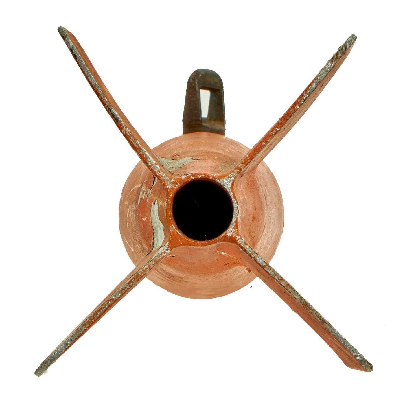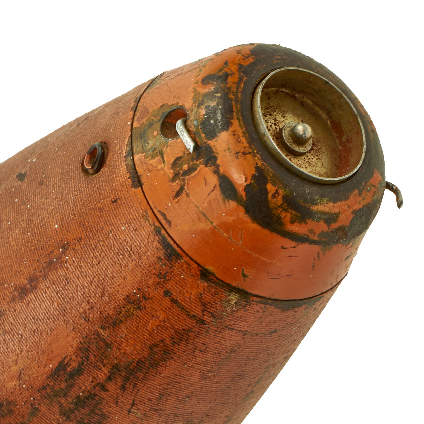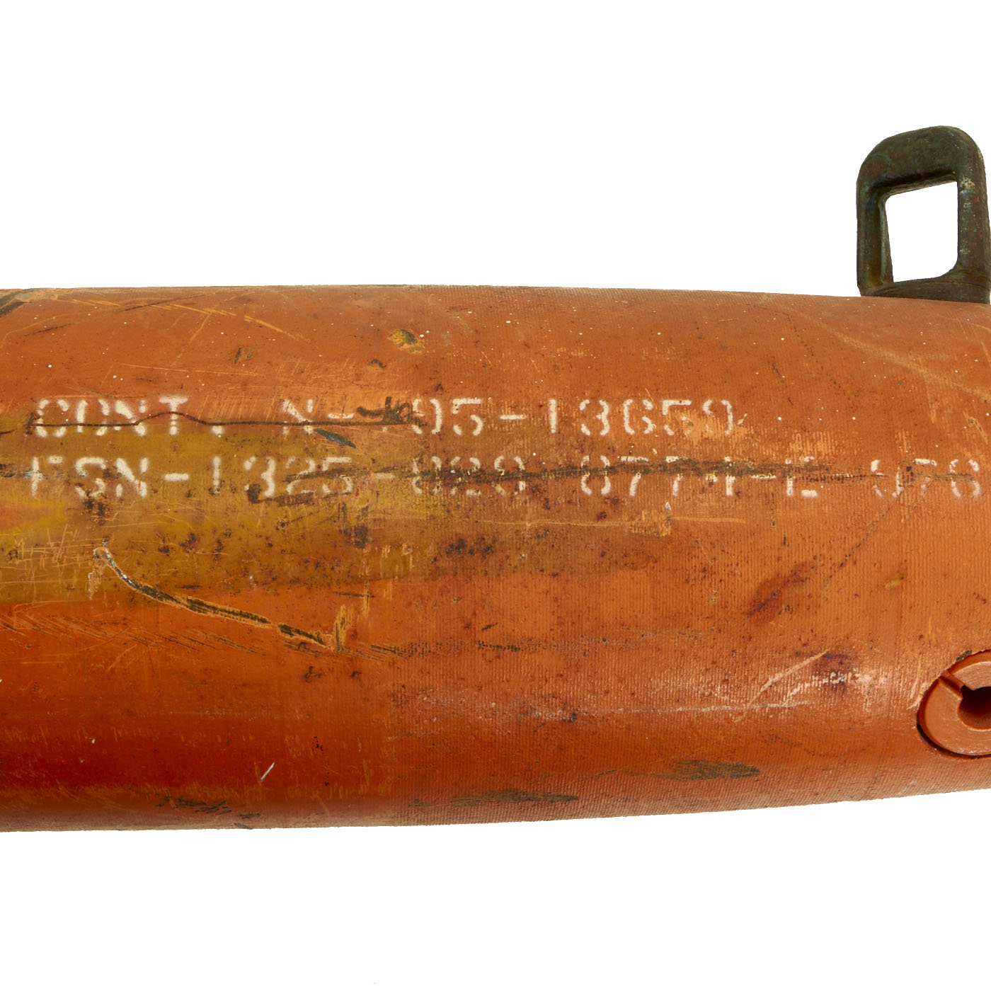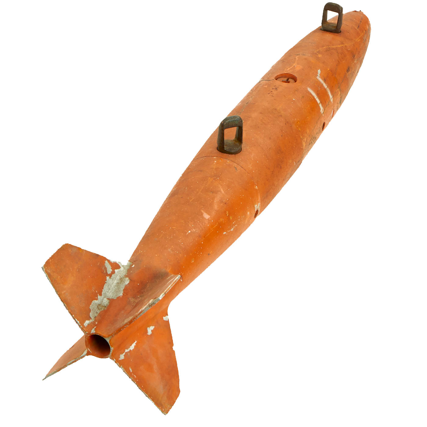 The bomb weighs just under 56 pounds at 54.45 Pounds with a length of 31 ½”. Much of the original orange paint is present with stenciling somewhat present in white paint. This practice bomb shows signs of use with possible repaint after a certain number of “drops”. There is no significant damage present and both mounting lugs are still present.