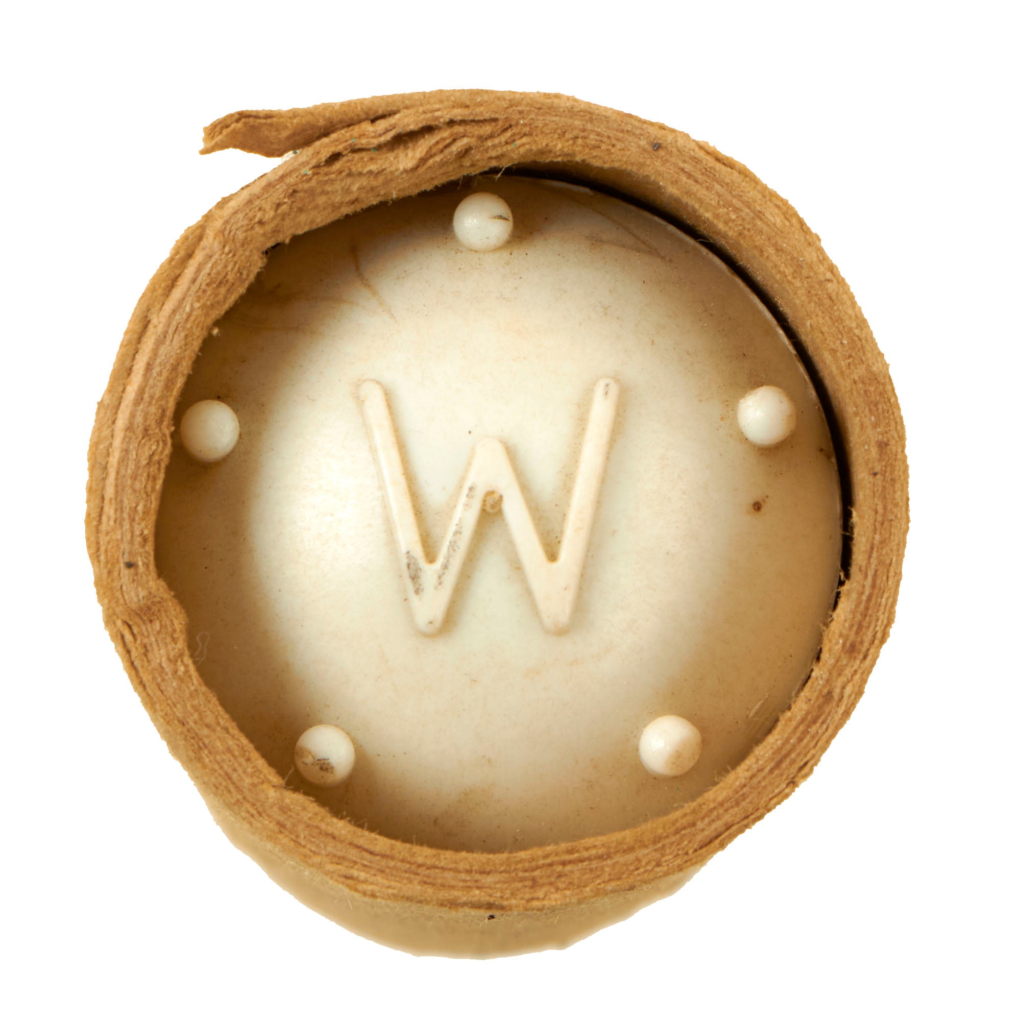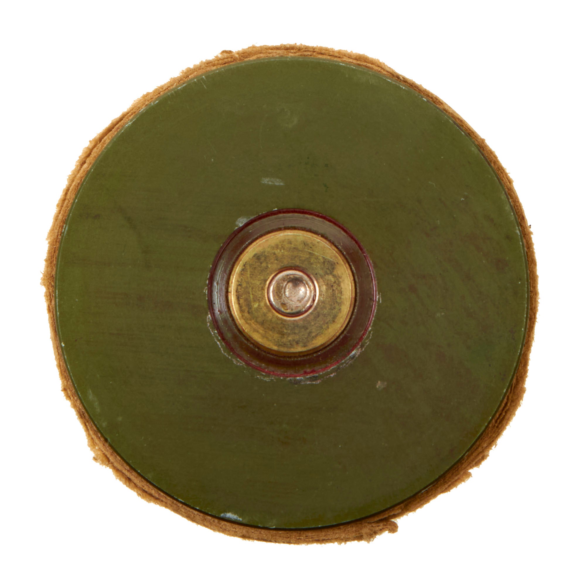 This is a lovely example of an M583A1 parachute star flare in its original cardboard tube. The flare can be removed from the tube but it requires some strength. It measures 5⅜” in length with a 1 13/16” diameter. The top shows the W on the plastic cover. The side of the round is marked: