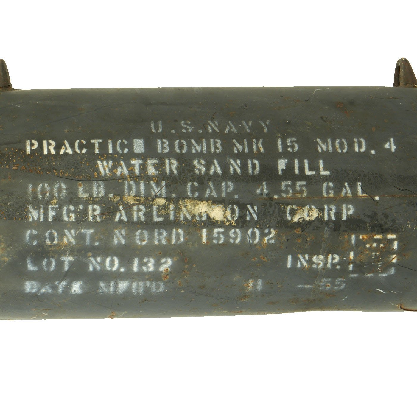 This is a Cold War/Vietnam War-era inert Mk 15 Mod 4 Practice Bomb as used by the US Navy for aerial bombing training. It is inert, and would be filled with sand or water. A flash tube, which would extend throughout its transverse axis, would house a pyrotechnic signal and firing pin assembly to detonate upon impact to mark its landing relative to the target.