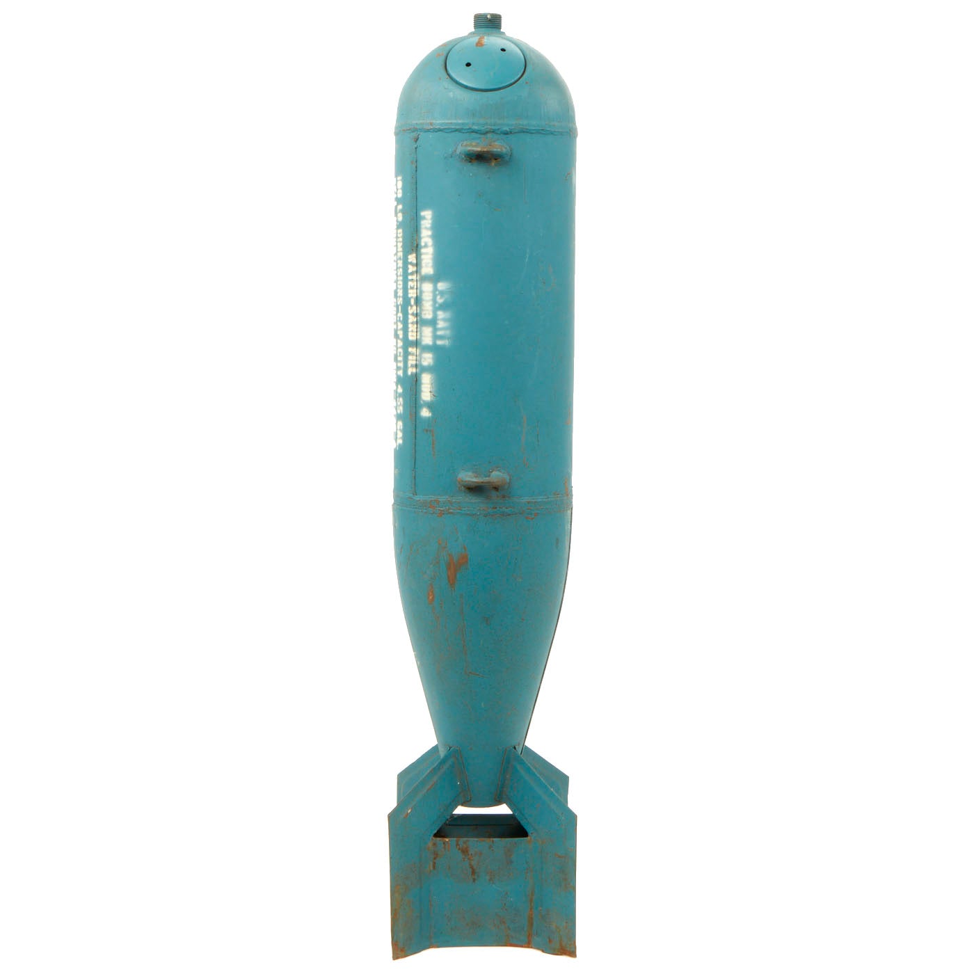 This is a Cold War/Vietnam War-era inert Mk 15 Mod 4 Practice Bomb as used by the US Navy for aerial bombing training. It is inert, and would be filled with sand or water. A flash tube, which would extend throughout its transverse axis, would house a pyrotechnic signal and firing pin assembly to detonate upon impact to mark its landing relative to the target.