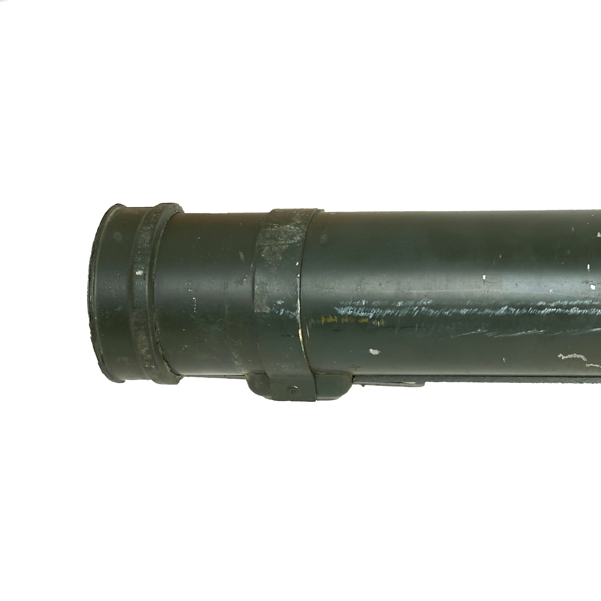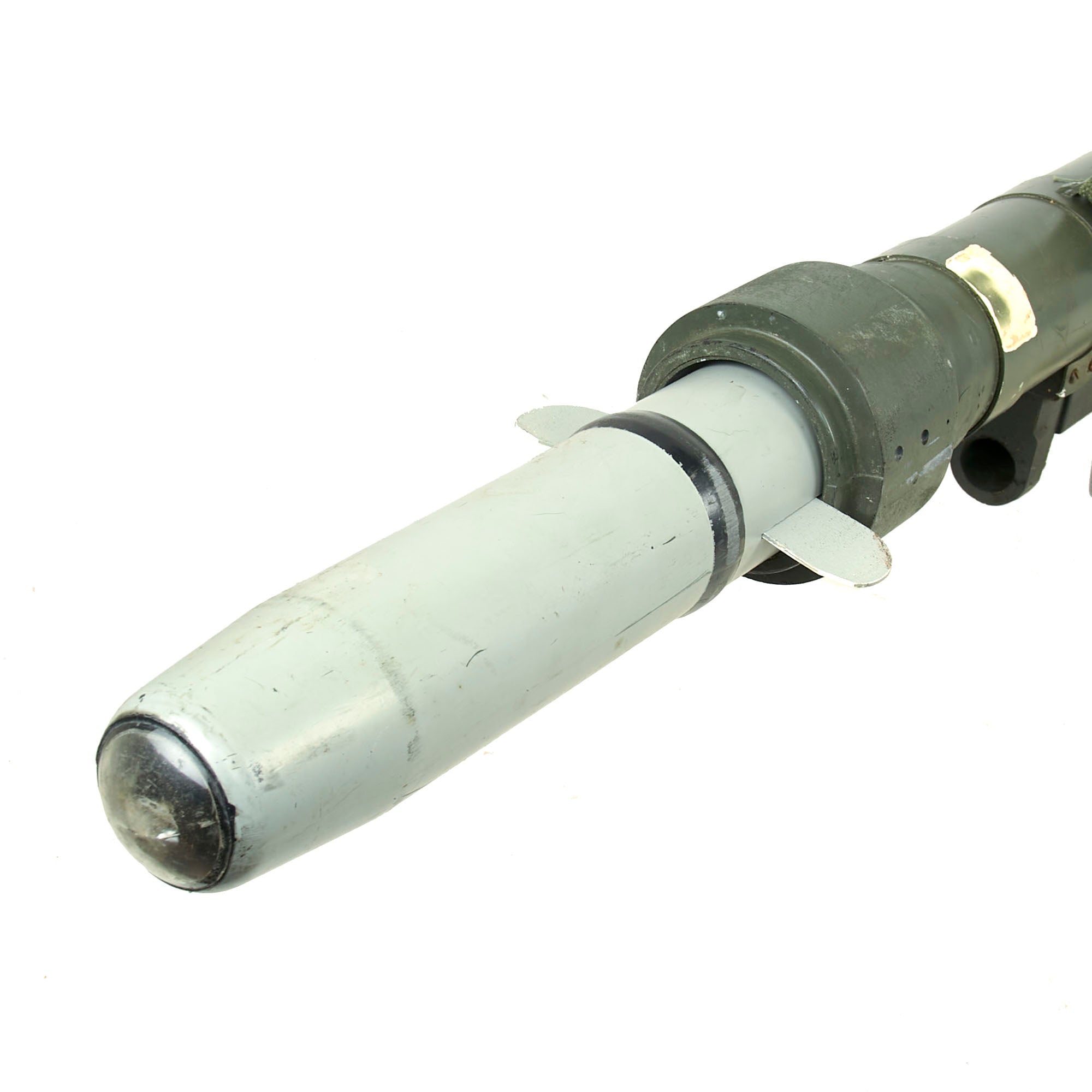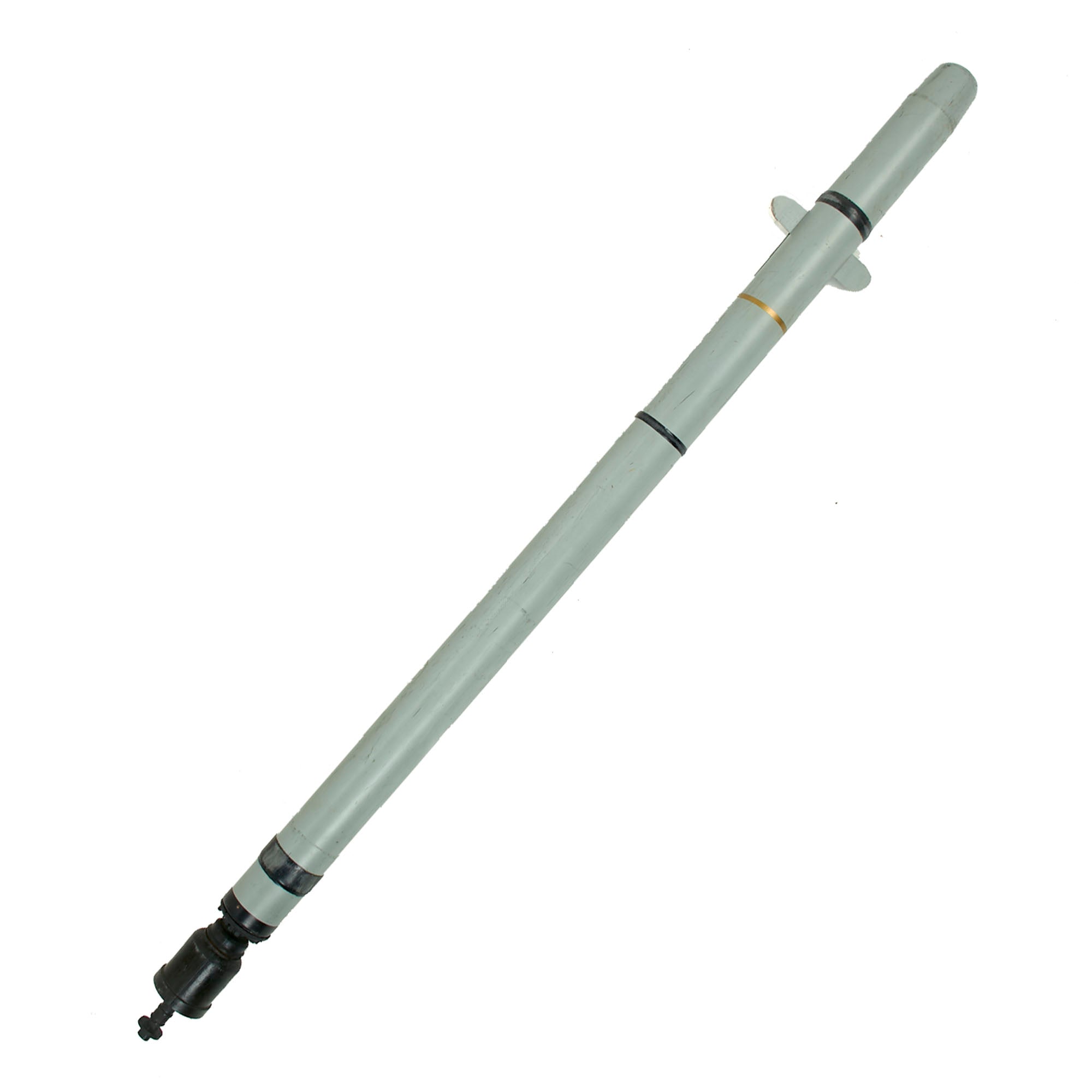 The launcher has a variety of markings including G-16a, Kn 1-2c, and C-9g. The launcher measures 57½” long and comes with an original period sling. The dummy missile has a correct rounded glass tip but is not built with a tail fin assembly, but has a piece that plugs into the bottom. The missile measures roughly 51” without the piece on the bottom.