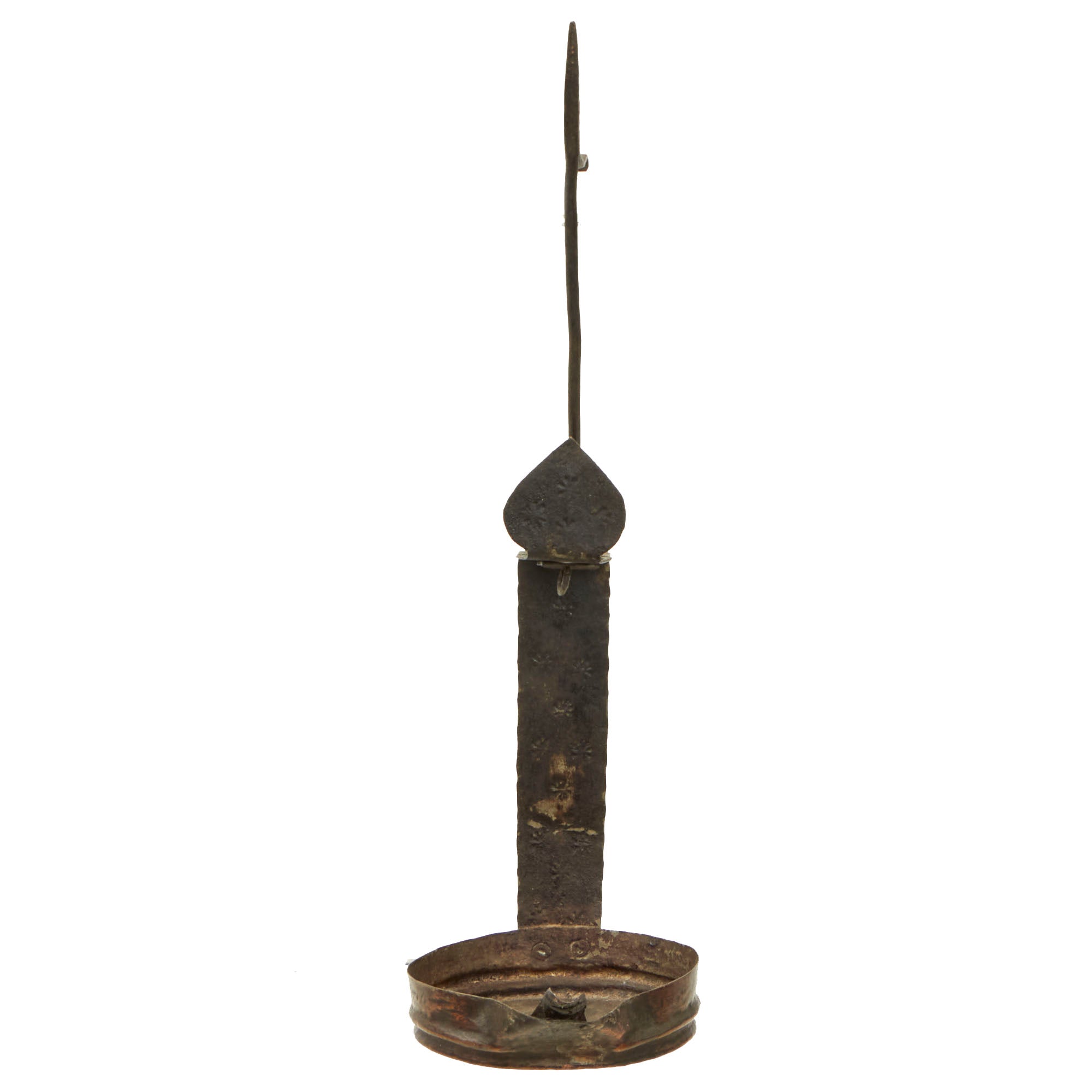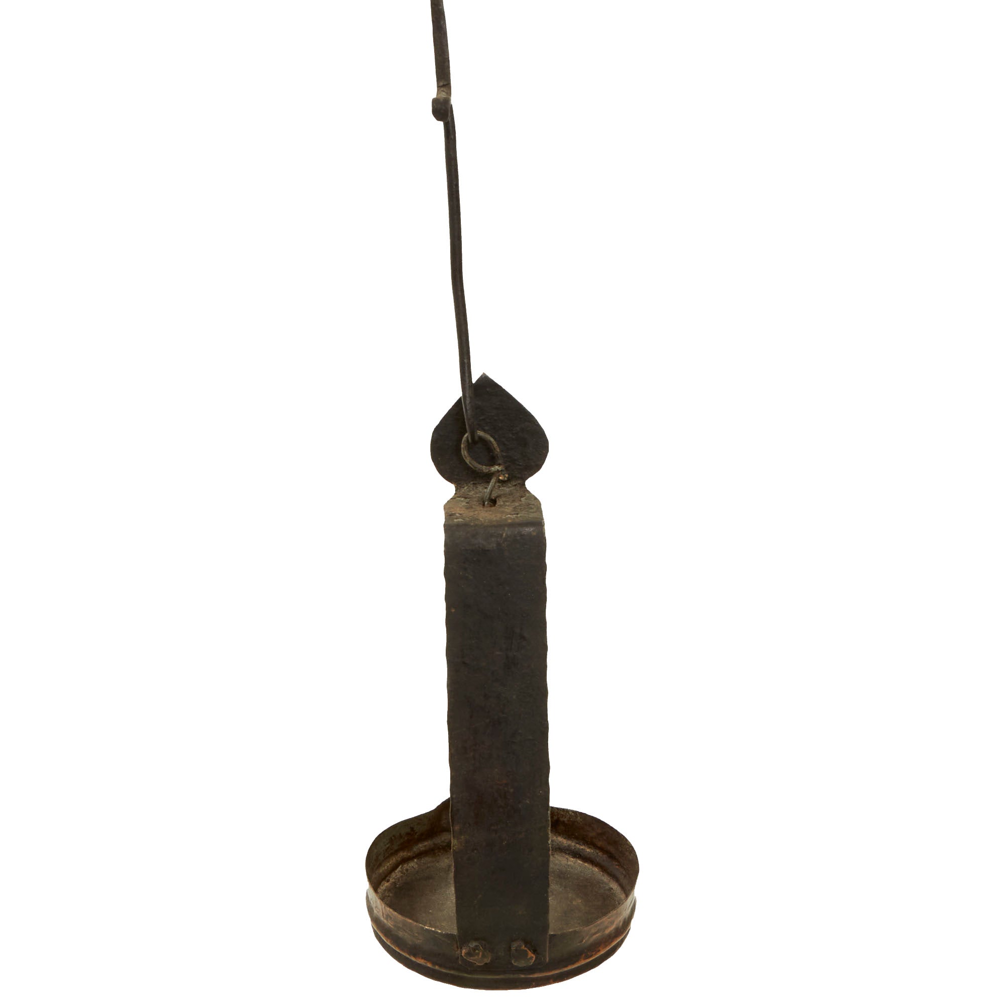 It measures roughly 7¼” tall without its hanger extended with a base diameter of 3½”. The small slide is still intact but it appears to be missing the lid if there ever was one. The nails holding the shaft to the base are very crudely made as shown. This is a fantastic piece of Colonial history, ready for further research and display. This could still be hung by its hanger but we don’t recommend it!