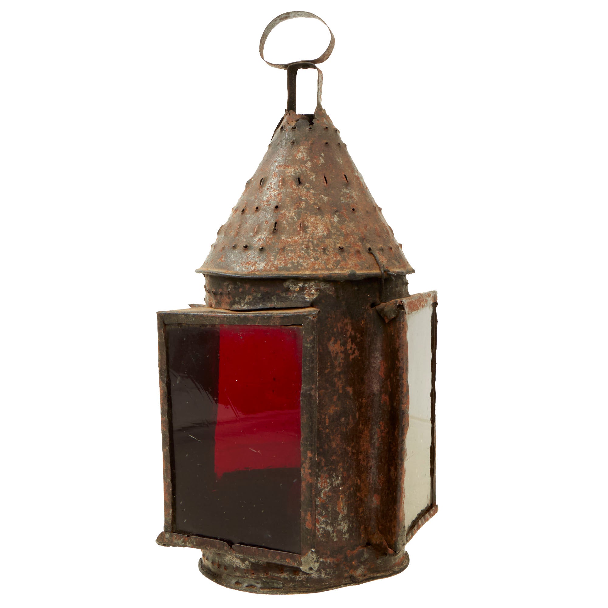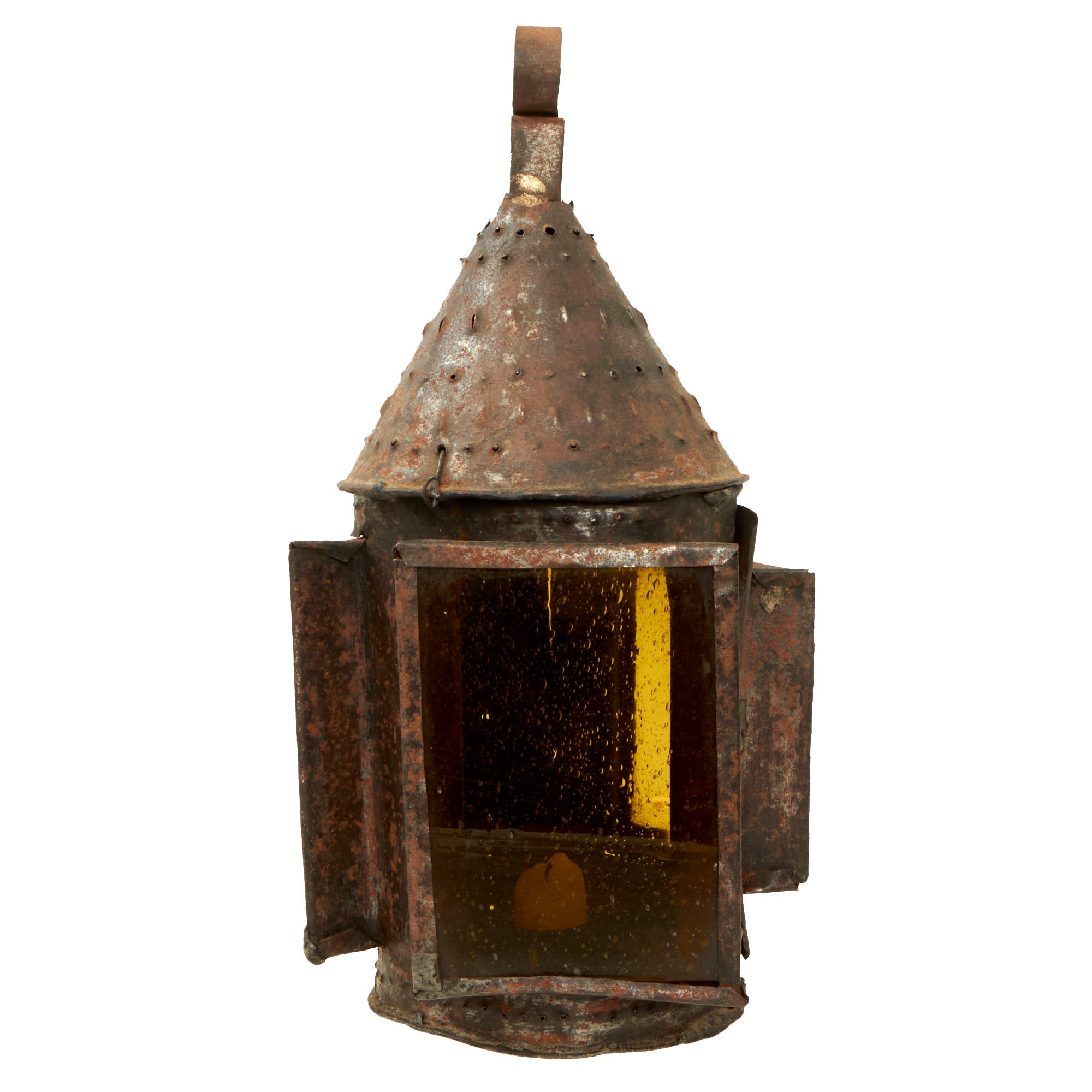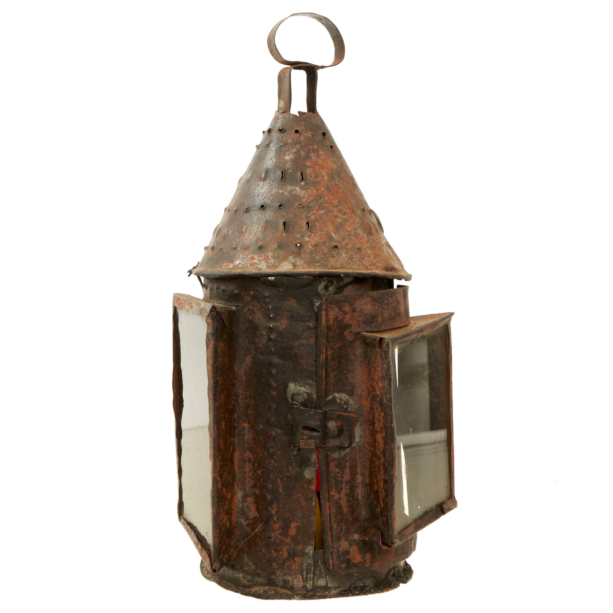 Original Item. One-of-a-Kind. This is one of the most tremendous naval items we have ever offered, a Colonial period ship’s navigational lantern with three different-colored panes of glass, red, yellow, and clear, for use on different parts of the ship. The construction is very crude and evident of the period, completely handmade with the original candle inside, and a heavy layer of wax residue at the bottom from centuries prior.