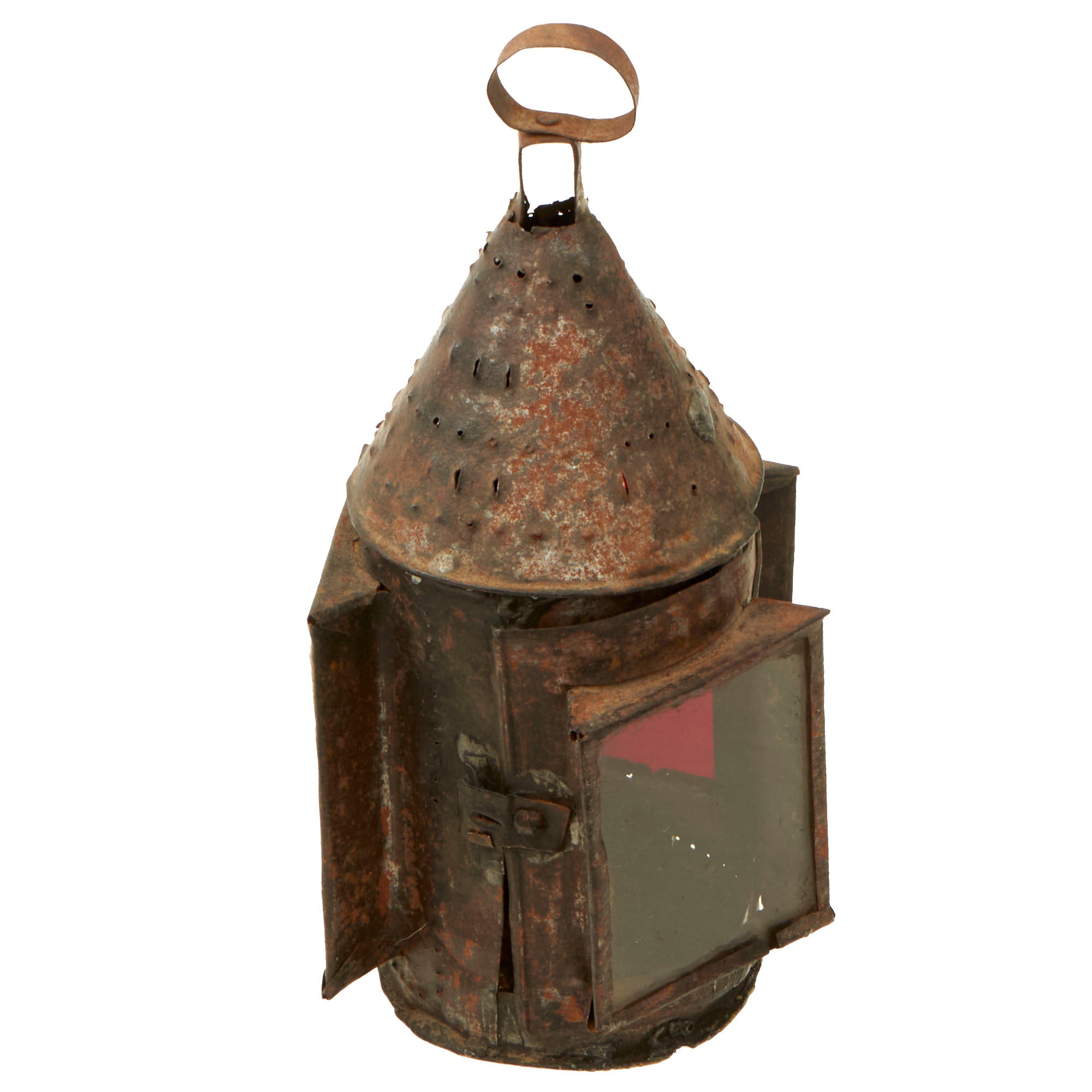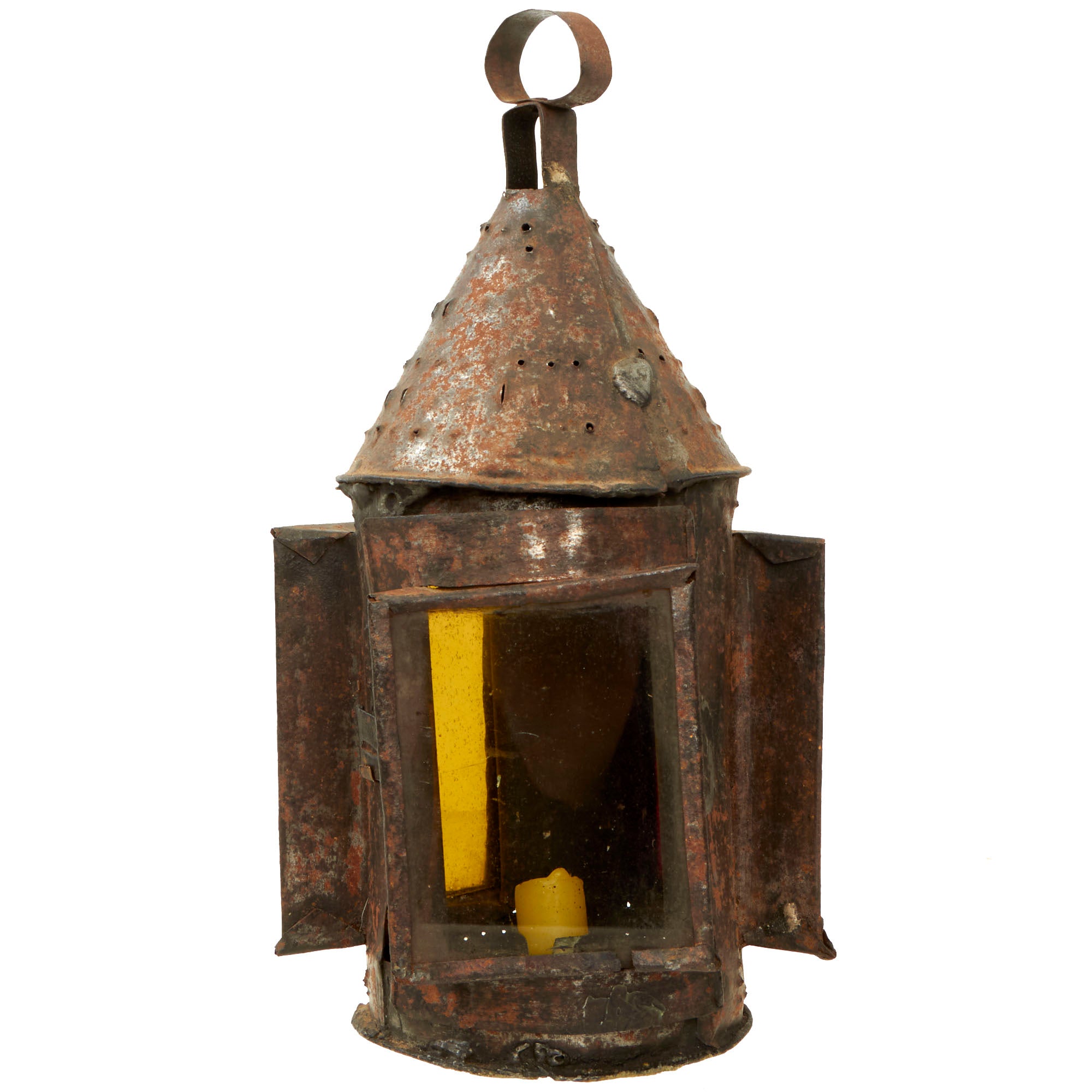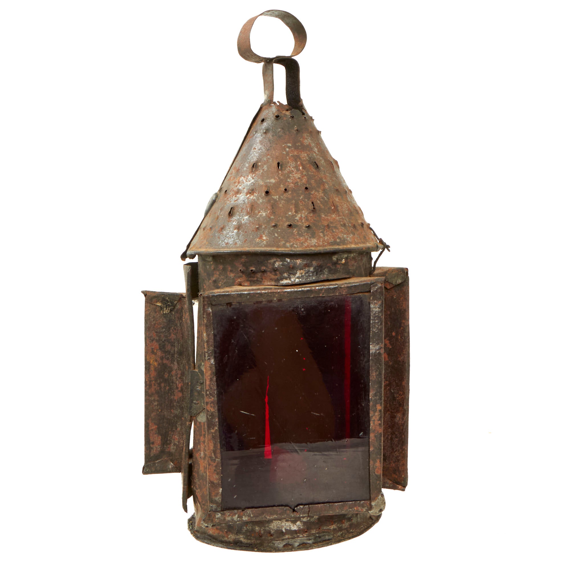 Original Item. One-of-a-Kind. This is one of the most tremendous naval items we have ever offered, a Colonial period ship’s navigational lantern with three different-colored panes of glass, red, yellow, and clear, for use on different parts of the ship. The construction is very crude and evident of the period, completely handmade with the original candle inside, and a heavy layer of wax residue at the bottom from centuries prior.