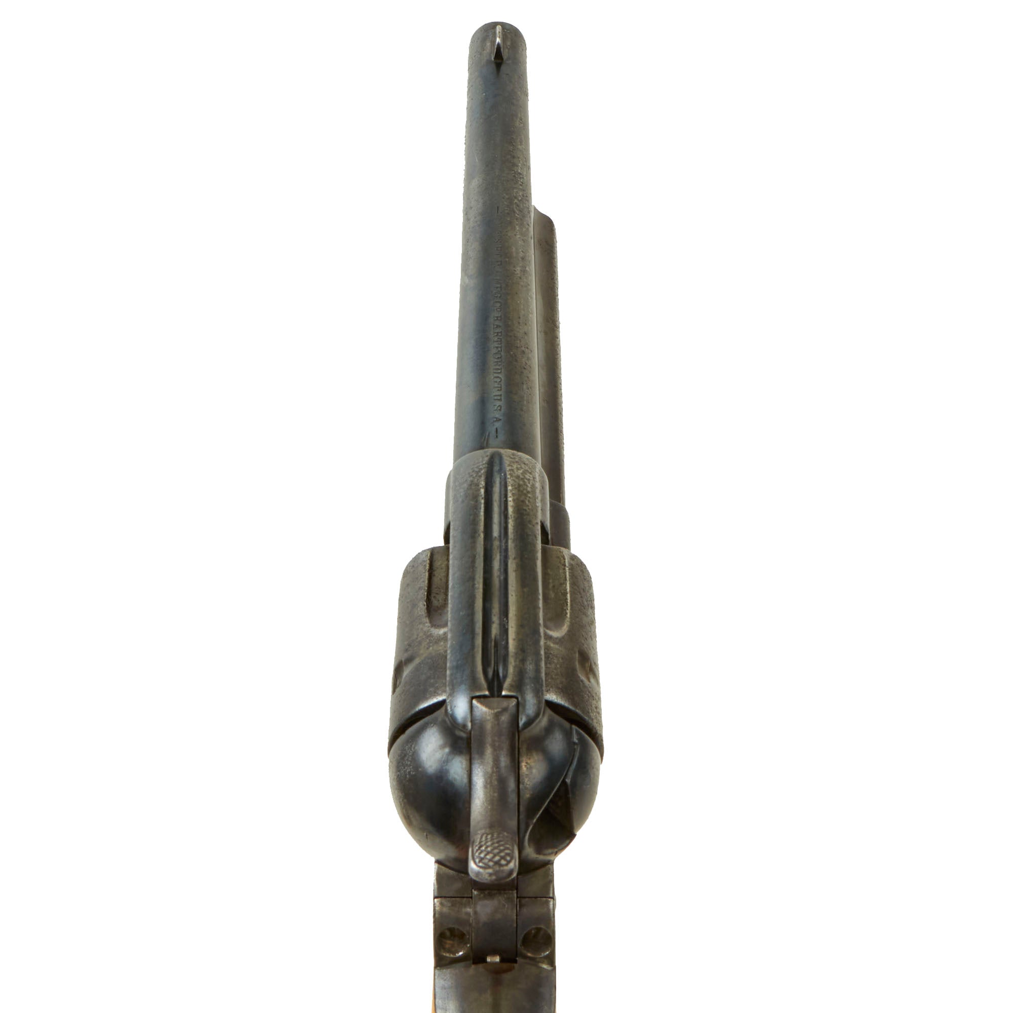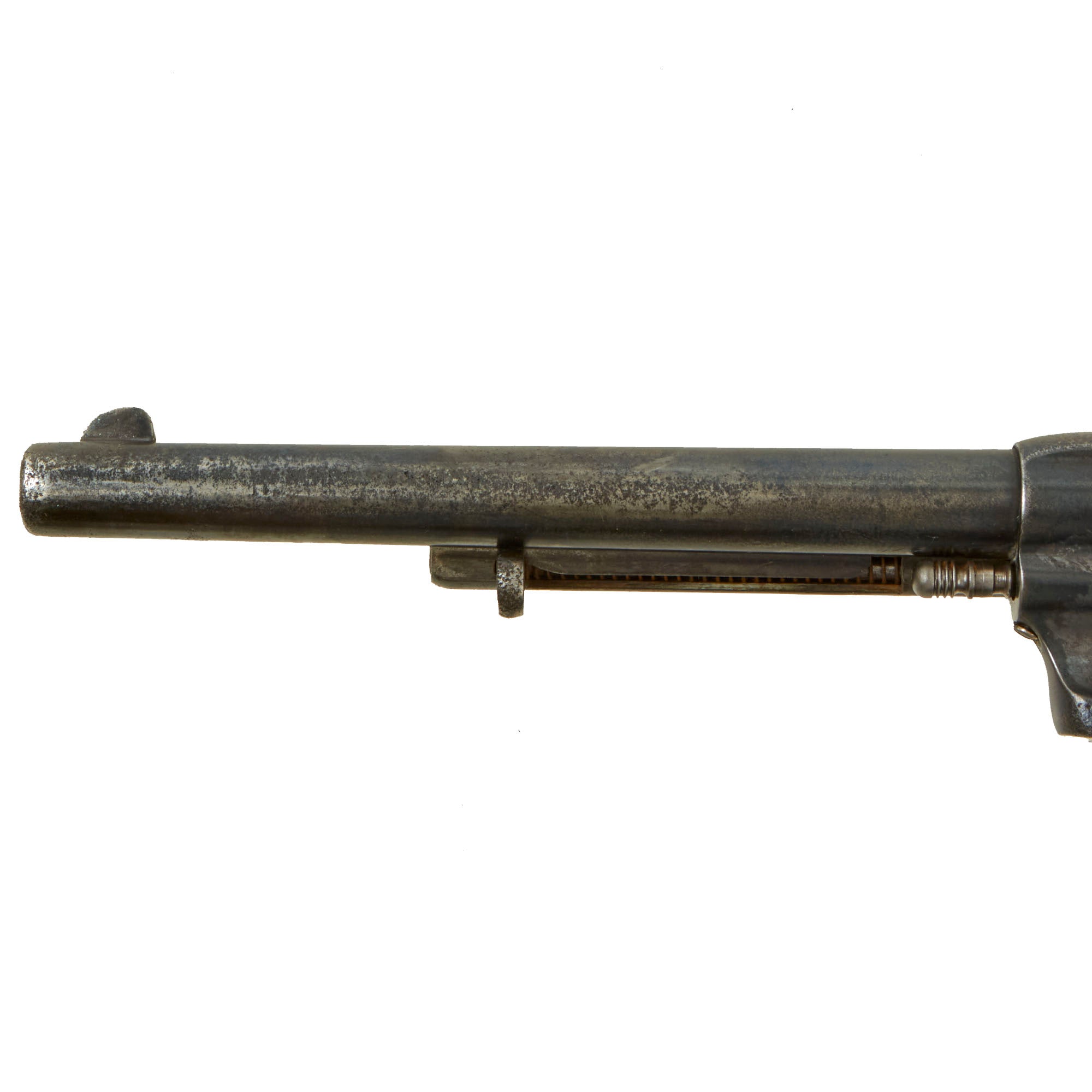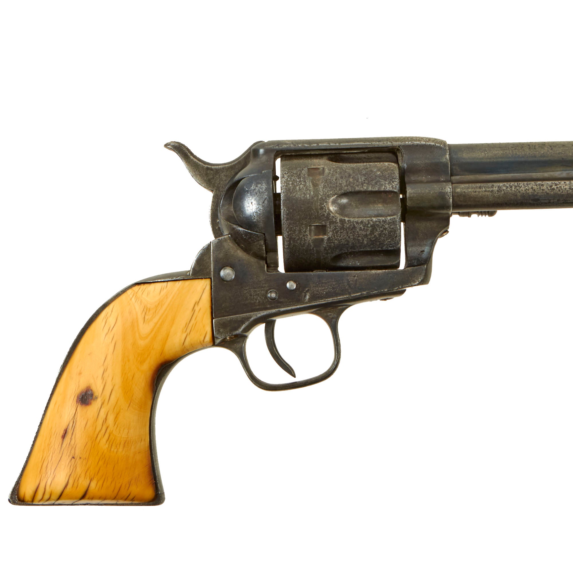 Original Item: Only One Available. This is every School boy's dream! A real Cowboy six gun! This great frontier-worn Colt SAA (Single Action Army) Revolver has a full length original long 7 1/2" barrel and lovely worn and yellowed ivory grips. Original blued from the factory, it now shows a worn blued patina overall, with traces of past peppering in areas. This definitely looks to be an example that saw long use on the frontier, giving it an impossible to duplicate look!