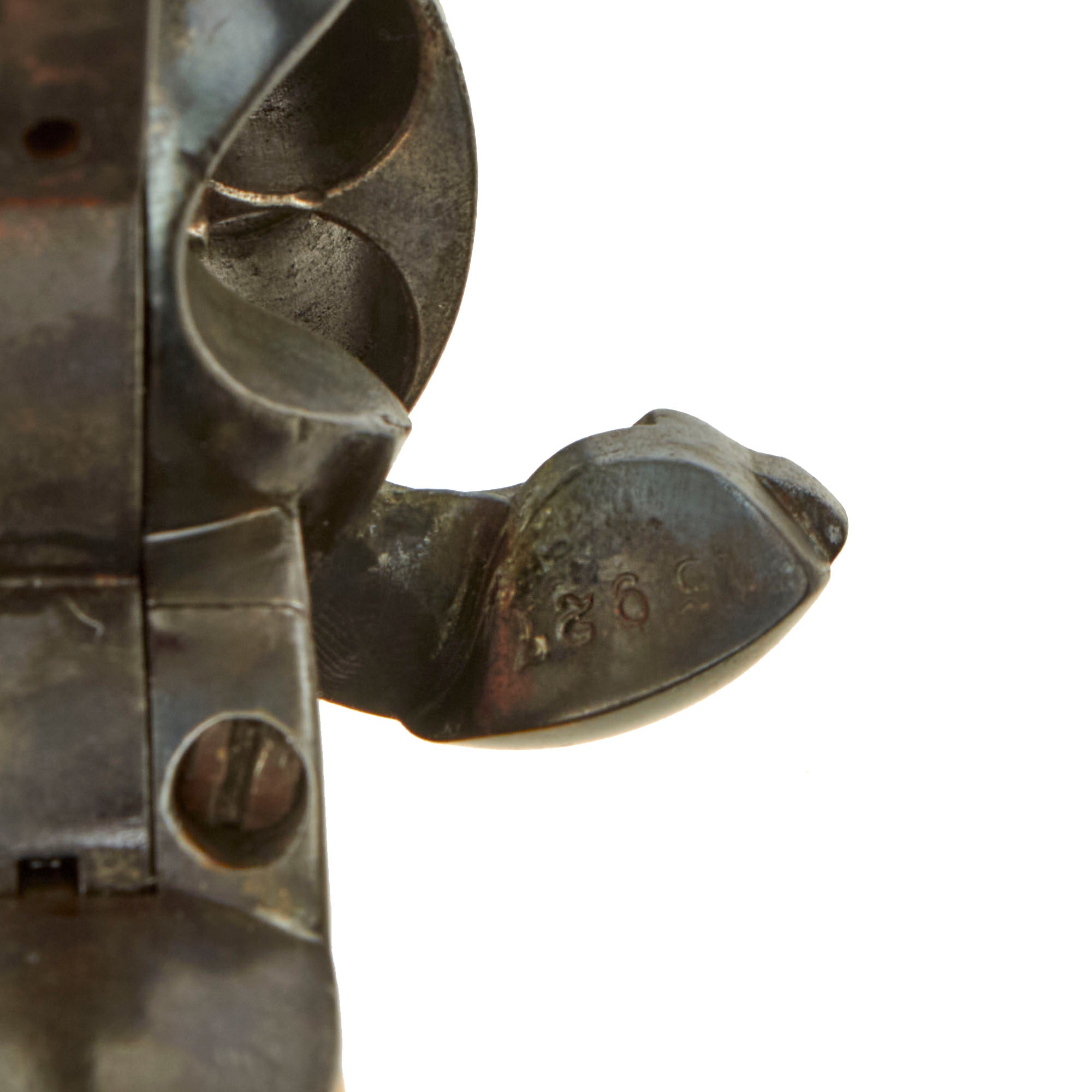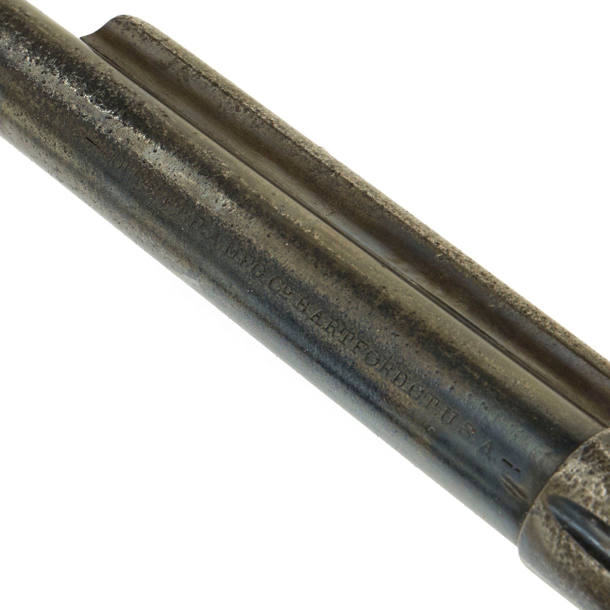 Mechanically, the action is relatively smooth, with a good cylinder lock up, and strong mainspring. The action has all four clicks, and cycles correctly, with just a bit of wobble in the lockup. We did not notice any of the finicky behavior we often see. As with all revolvers of this age we recommend being very gentle with cycling it, so we do not recommend "fanning" or "fan firing". The bore is in very good condition, showing a mostly bright finish with clear lands and grooves. There definitely has been wear to the lands and some past fouling, now removed, but overall it's really a great example, especially considering it is from the age of black powder. The ejector door swings open easily, and the ejector itself works great, with the original spring still present.