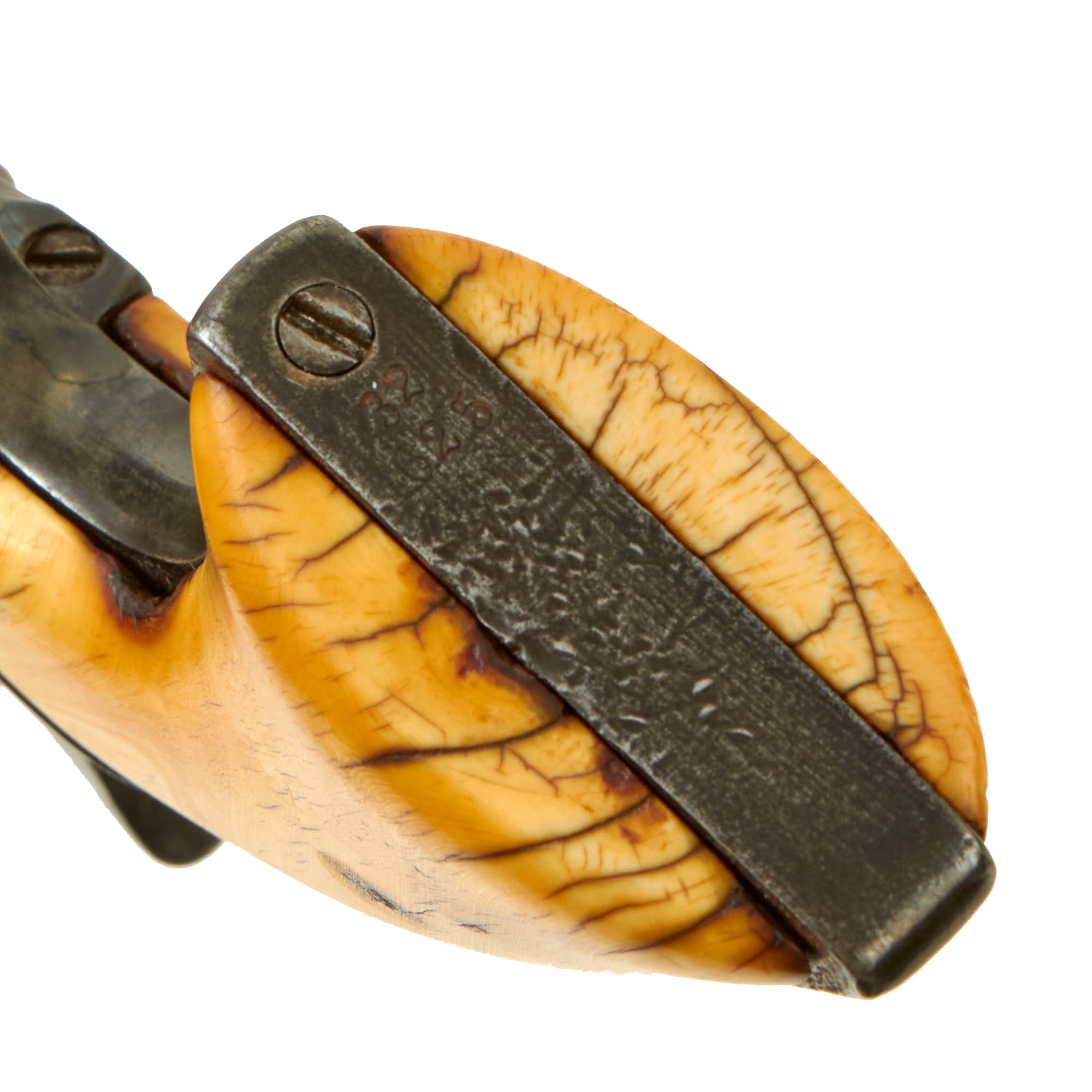 The revolver has the great worn look that only use in service can give, showing evidence of peppering on the exterior, as well as some past oxidation on the left side of the barrel and on part of the cylinder, probably due to long storage in a holster. This has now been cleaned away, giving a lovely "been there" look. The ivory grip has matured beautifully, with the grain fully visible, and there is age checking an cracking at the bottom, just like we love to see.