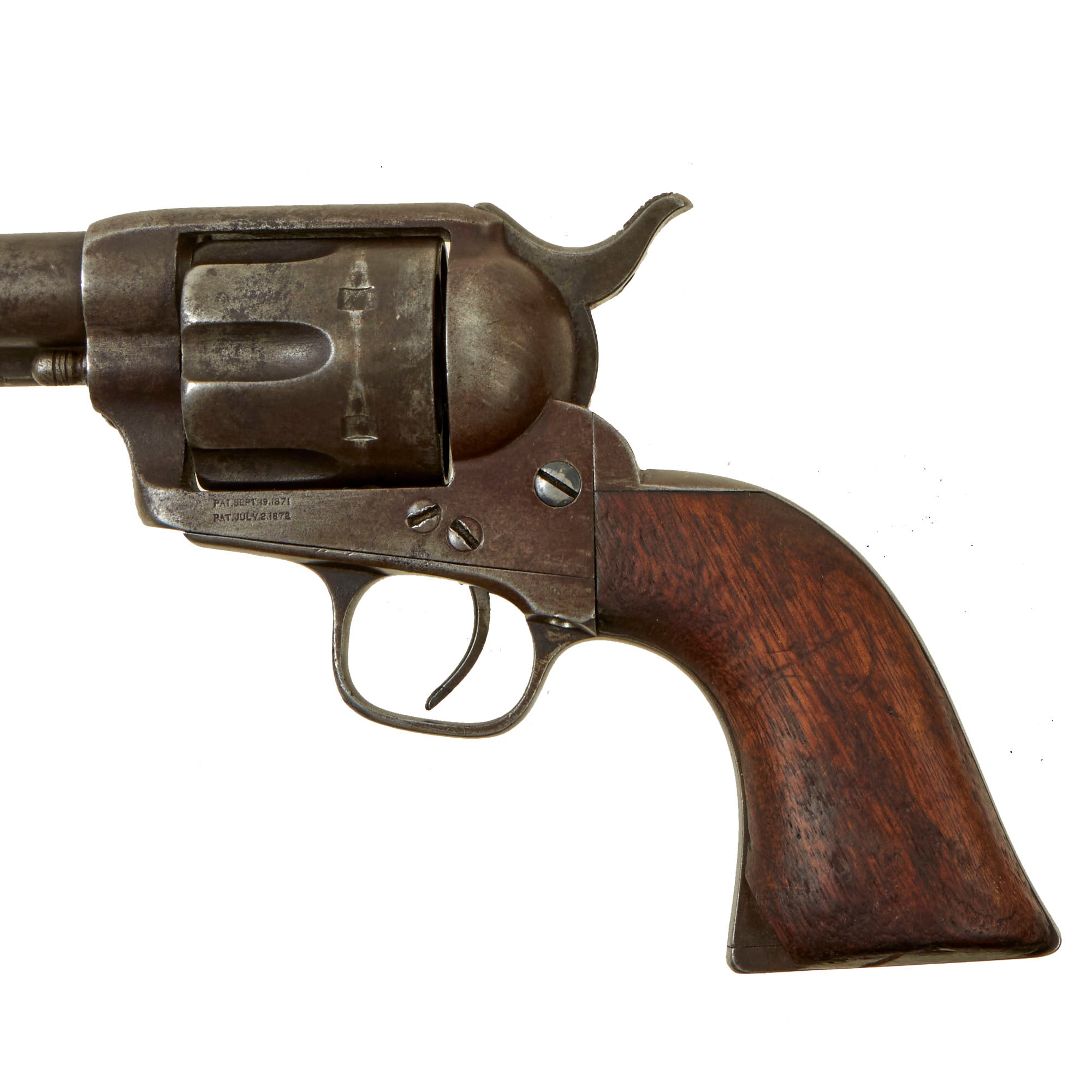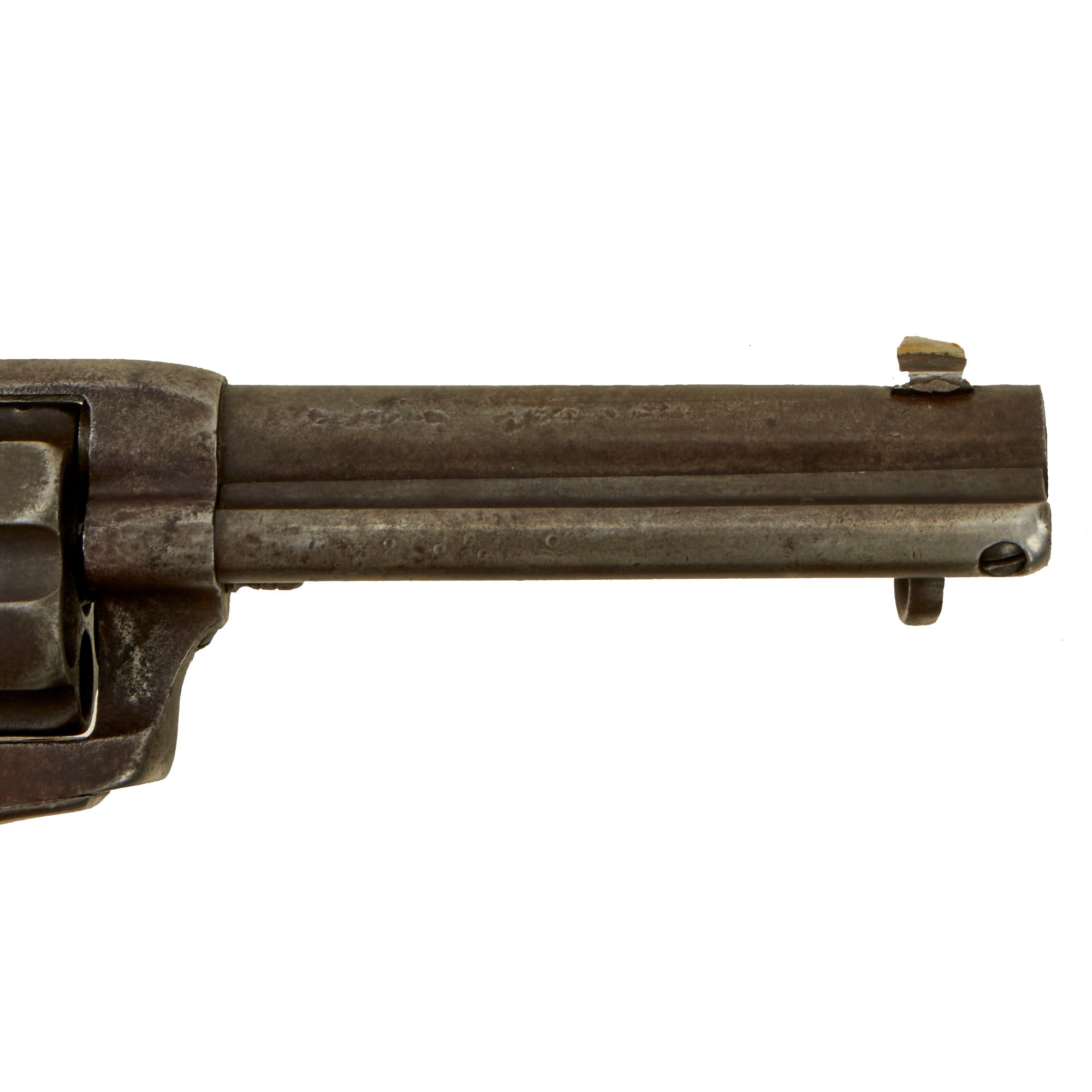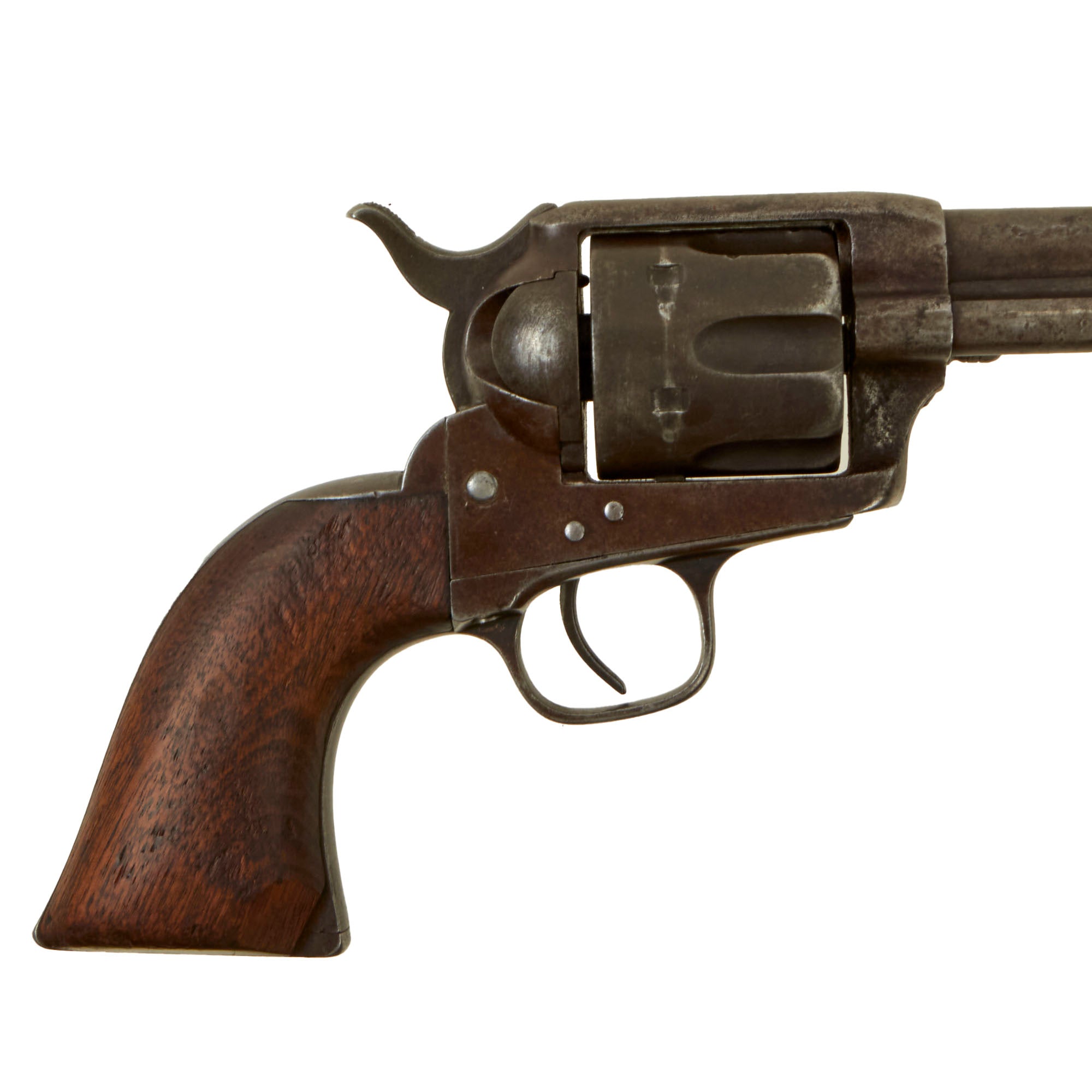 Original Item: Only One Available. This is every School boy's dream! A real Cowboy six gun! This great frontier-worn Colt SAA (Single Action Army) Revolver has a shortened "cowboy friendly" 4 ¾" barrel and lovely worn walnut grips. Original blued from the factory, it now shows a worn blued patina overall, with traces of past peppering in areas. This definitely looks to be an example that saw long use on the frontier, giving it an impossible to duplicate look!