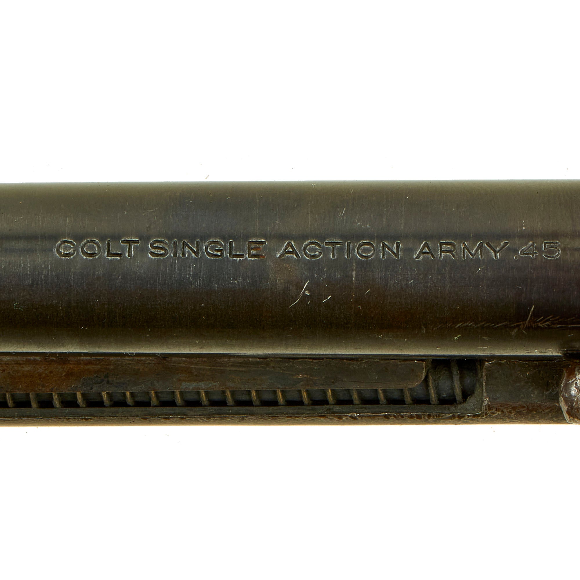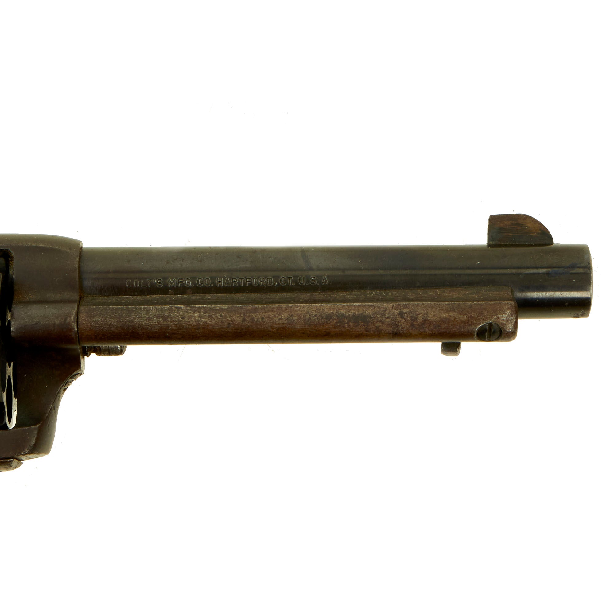 Original Item: Only One Available. This is every School boy's dream! A real Cowboy six gun! This fantastic Colt SAA (Single Action Army) Revolver has a "gunfighter friendly" factory replacement 5 1/2" barrel and lovely Colt hard rubber grips, bearing the iconic Colt "Prancing Pony". The cylinder was most likely worn or damaged, so it was also replaced when the barrel was, and both replaced items have a lovely blued finish. The rest of the metalwork shows a lovely aged plum patina.