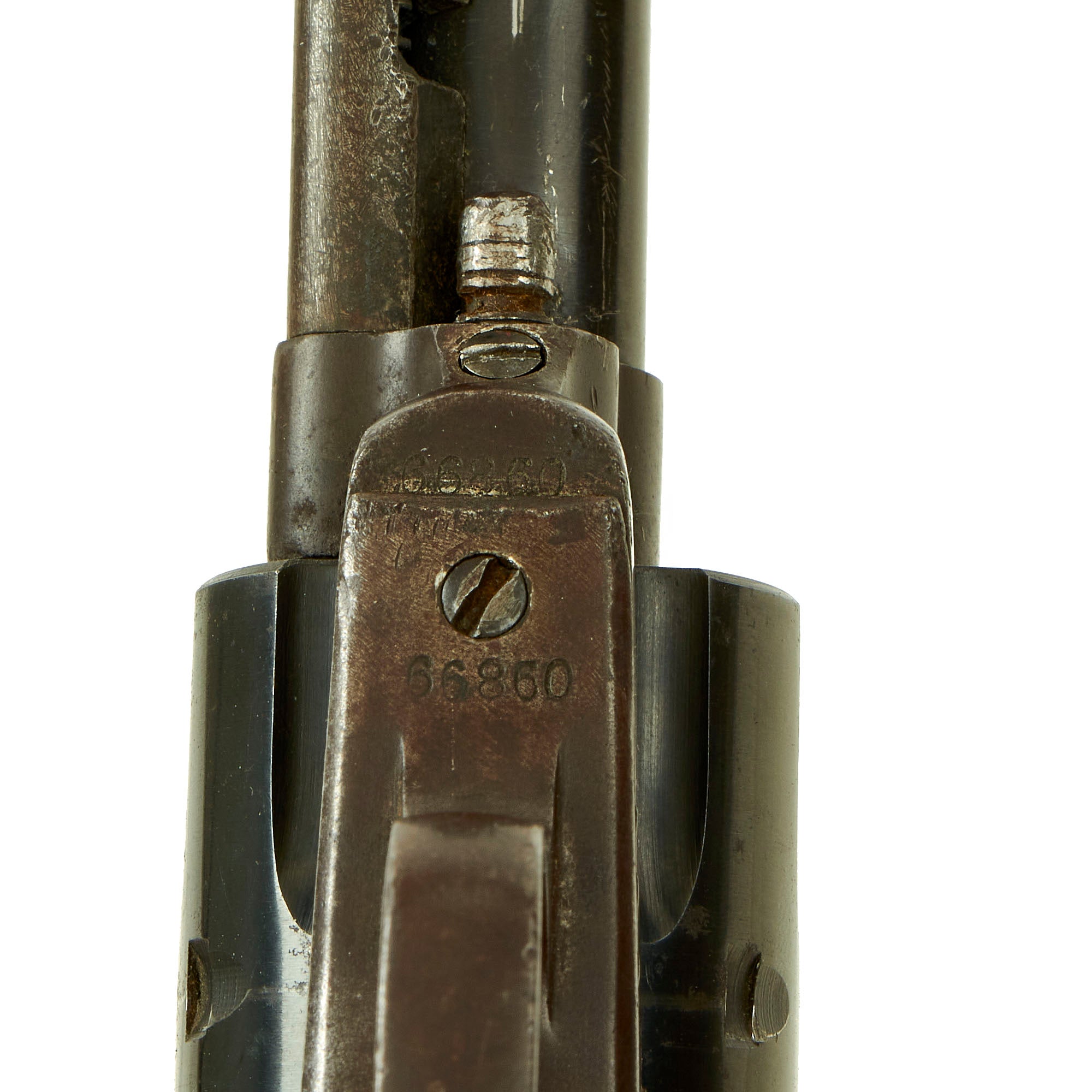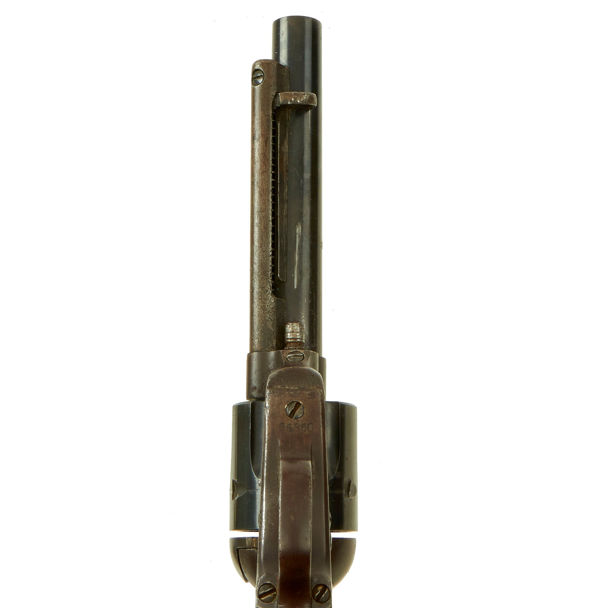 That is exactly what happened with this revolver, which really is a lovely example. The revolver's serial number is 66860, which dates production to 1881. It has the serial number on the frame, trigger guard, and grip frame, making this an "ALL MATCHING" example, except for the replaced barrel and cylinder. There is also assembly number 827 marked on the loading gate. It is in full working order and condition, with a fantastic finish and great grips, sure to delight any "Old West" Americana collector.