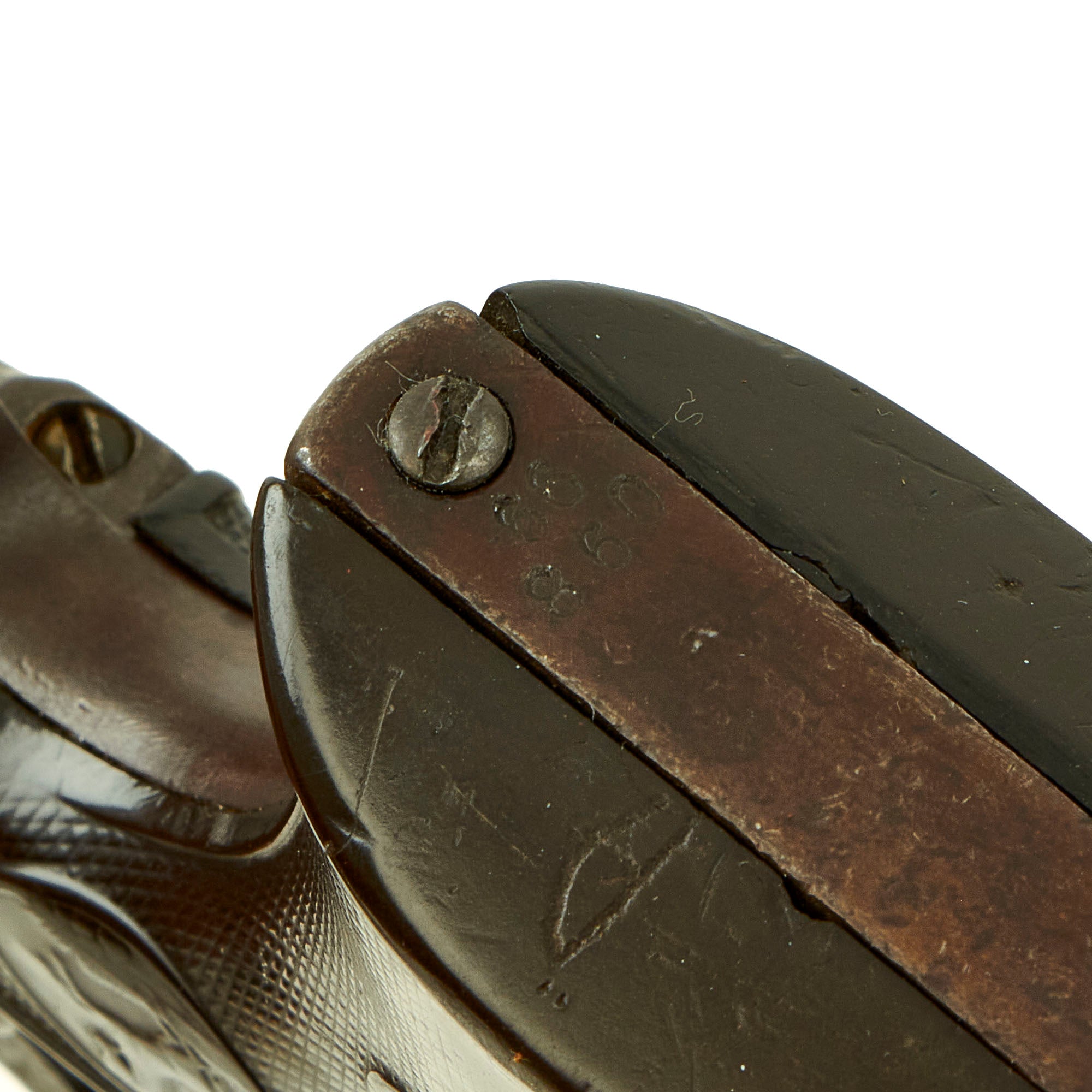 The revolver has a great look, with the replacement barrel and cylinder retaining their blued finish very well. The front sight was filed down a bit to make it less likely to catch during drawing, and also probably to more correctly match the first generation style. The frame and other parts have a lovely patina of age. The Colt hard rubber grips have a lovely color, with some chips at the bottom, and an area around the screw on the left side that was ground away a bit during servicing. It looks like the left grip may be a period replacement, as it is more of a black color, and shows less wear to the checkering to the right side, which is more of a dark brown color. The Colt "Prancing Pony" is still clear on both grips, with some wear on the right side. The revolver disassembles correctly, with a worn original cylinder arbor pin and replacement securing screw.