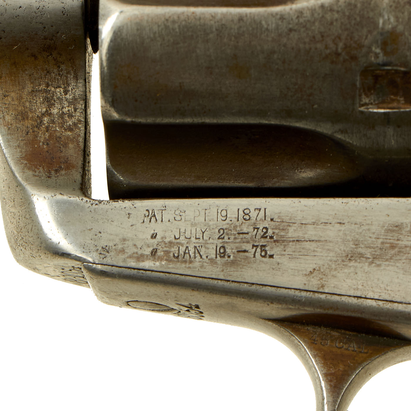 The left side of the frame has the Colt patent dates mostly legible, with just a bit of fading in the upper left corner: