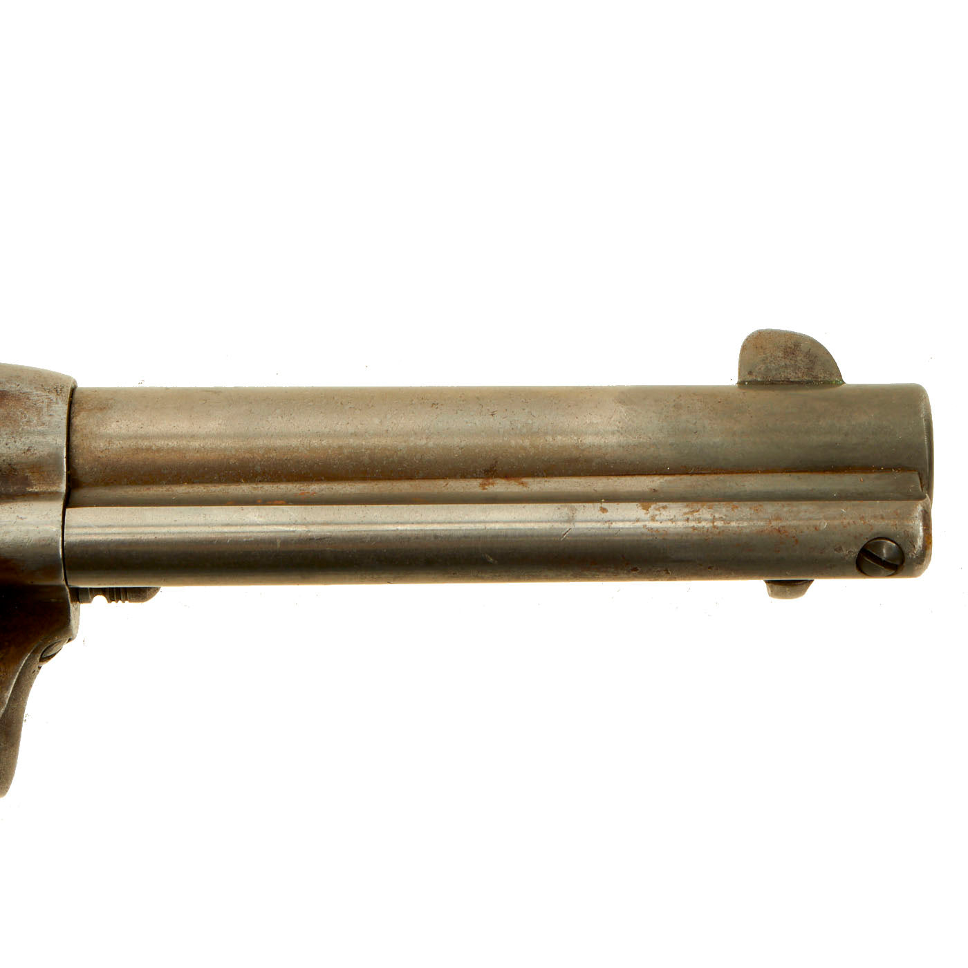 Mechanically, the action is smooth, with a strong cylinder lock up, and crisp dry fire. The action has all four clicks, and we did not notice any finicky behavior during cycling, as we often would on a revolver from this time period. The bore is in very good condition, with a partly bright finish. There are some areas of light oxidation, while the lands are crisp, so it looks like the revolver was only used a bit, but did not have the barrel properly cleaned, so areas oxidized. Still, a bore this good is a real rarity for any revolver from the age of black powder. The ejector door swings open easily, and the ejector itself works great. Overall this is a great pistol!