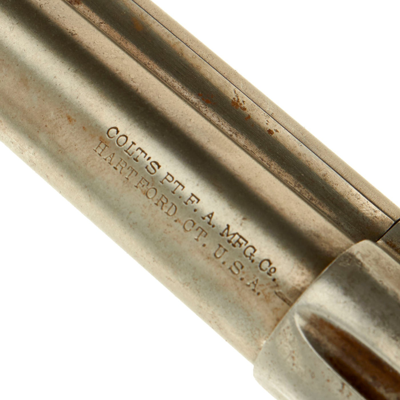 The original Colt double line address marking, correct for this barrel length, is still crisp and legible on the top of the barrel: