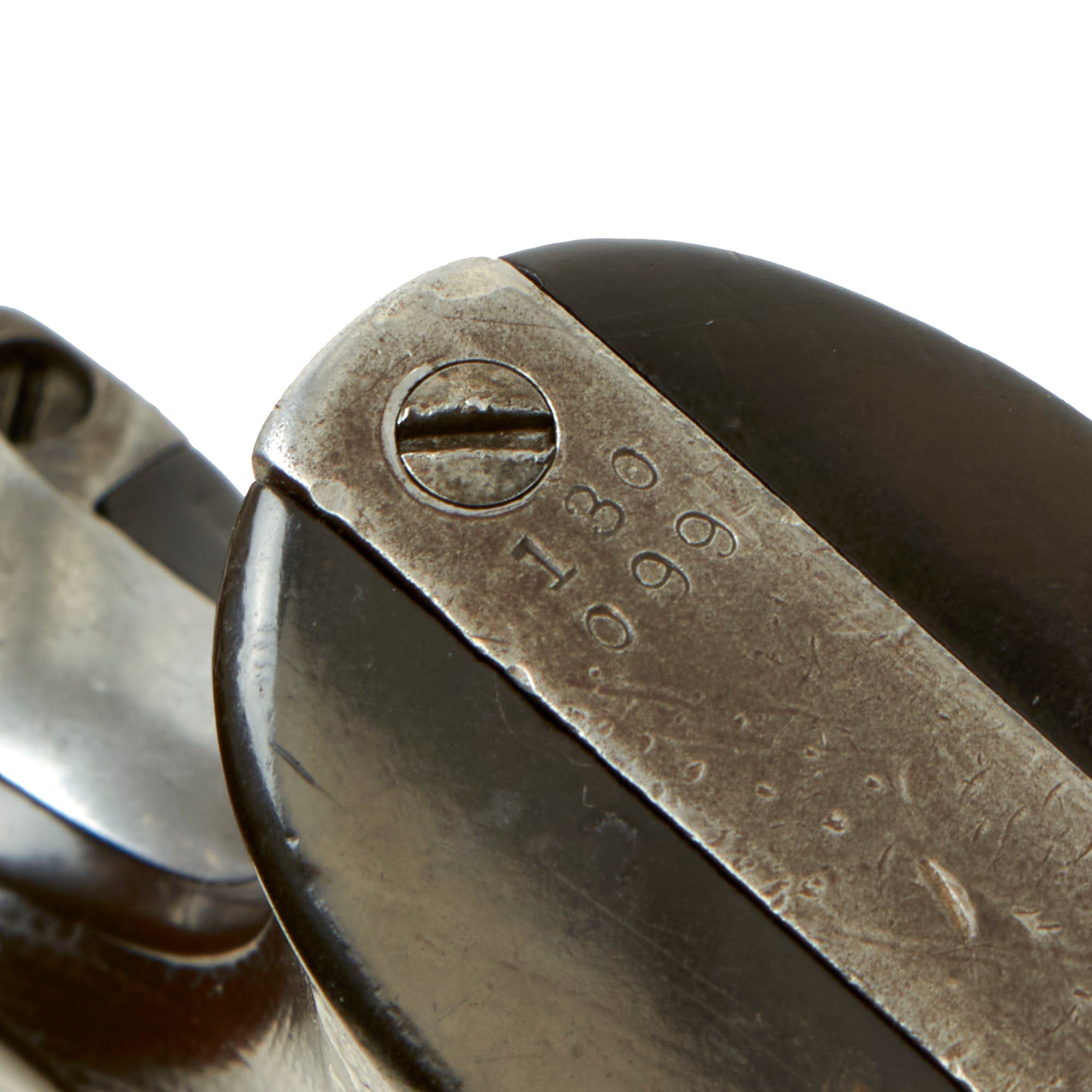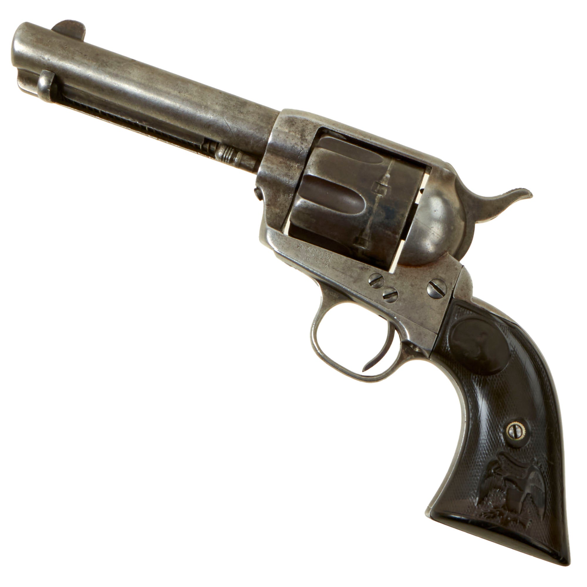 The revolver has the great worn look that only use in service can give. The original Colt hard rubber grips have a fantastic "broken-in" look, with the original checkering and logos still clearly visible, but worn. There are a few scratches and small gouges, and the usual wear around the bottom of the grips.