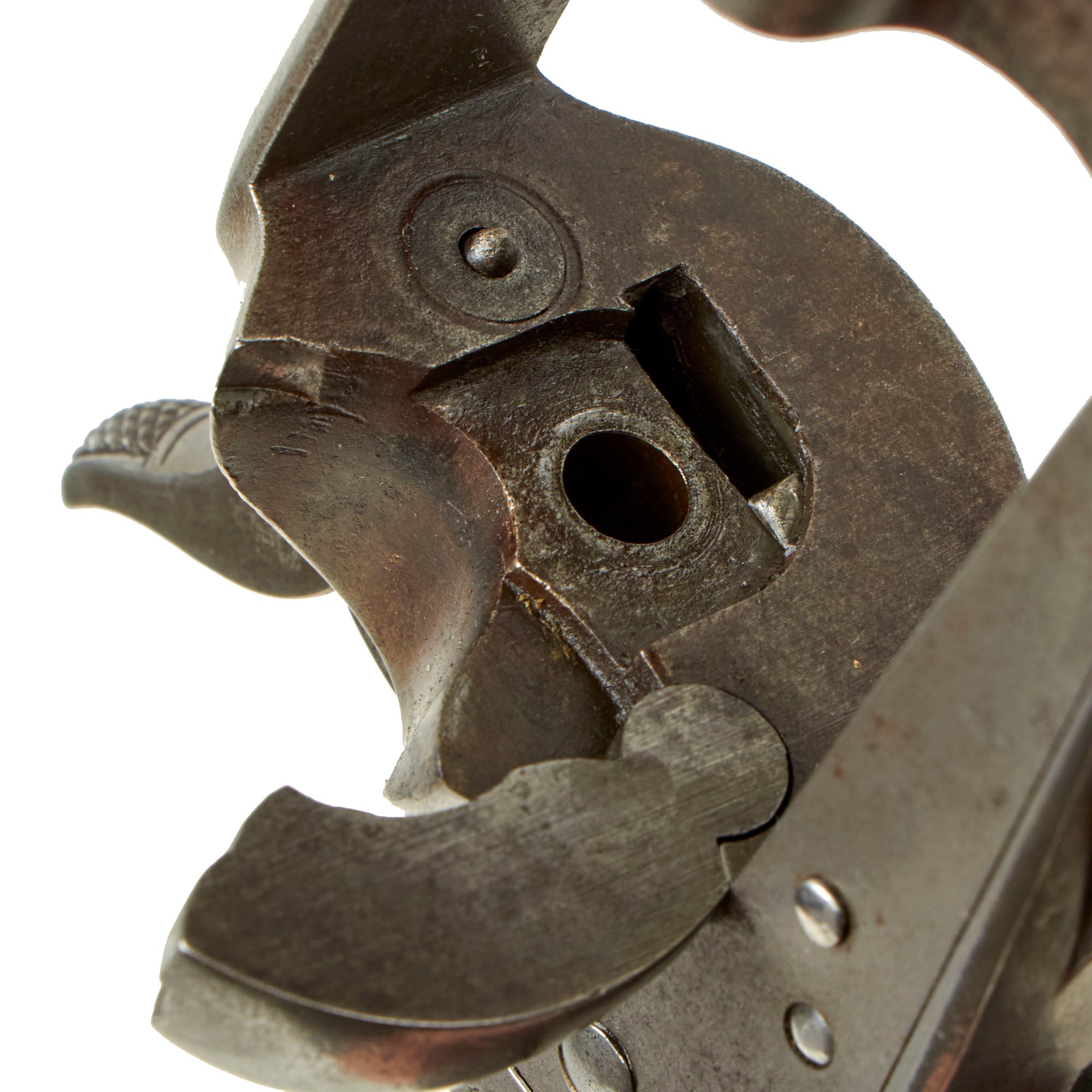 Mechanically, the revolver cycles well, with accurate indexing, a strong cylinder lockup, and a crisp dry fire. The hammer tumbler is a bit worn though, and it does not hold at the first "click" at all. The other three clicks are present, and the revolver has a functional loading position. The first "safety" click was never really secure to begin with, so this is only a minor deficiency. As with all revolvers of this age we recommend being very gentle with cycling it, so we do not recommend "fanning" or "fan firing". The bore is in very good condition, showing clear lands and grooves with a partly bright finish. There is some wear as well as fouling, but it's definitely better than many we see. The ejector door swings open easily, and the ejector itself works great. Overall this is a lovely "Frontier Worn" pistol.