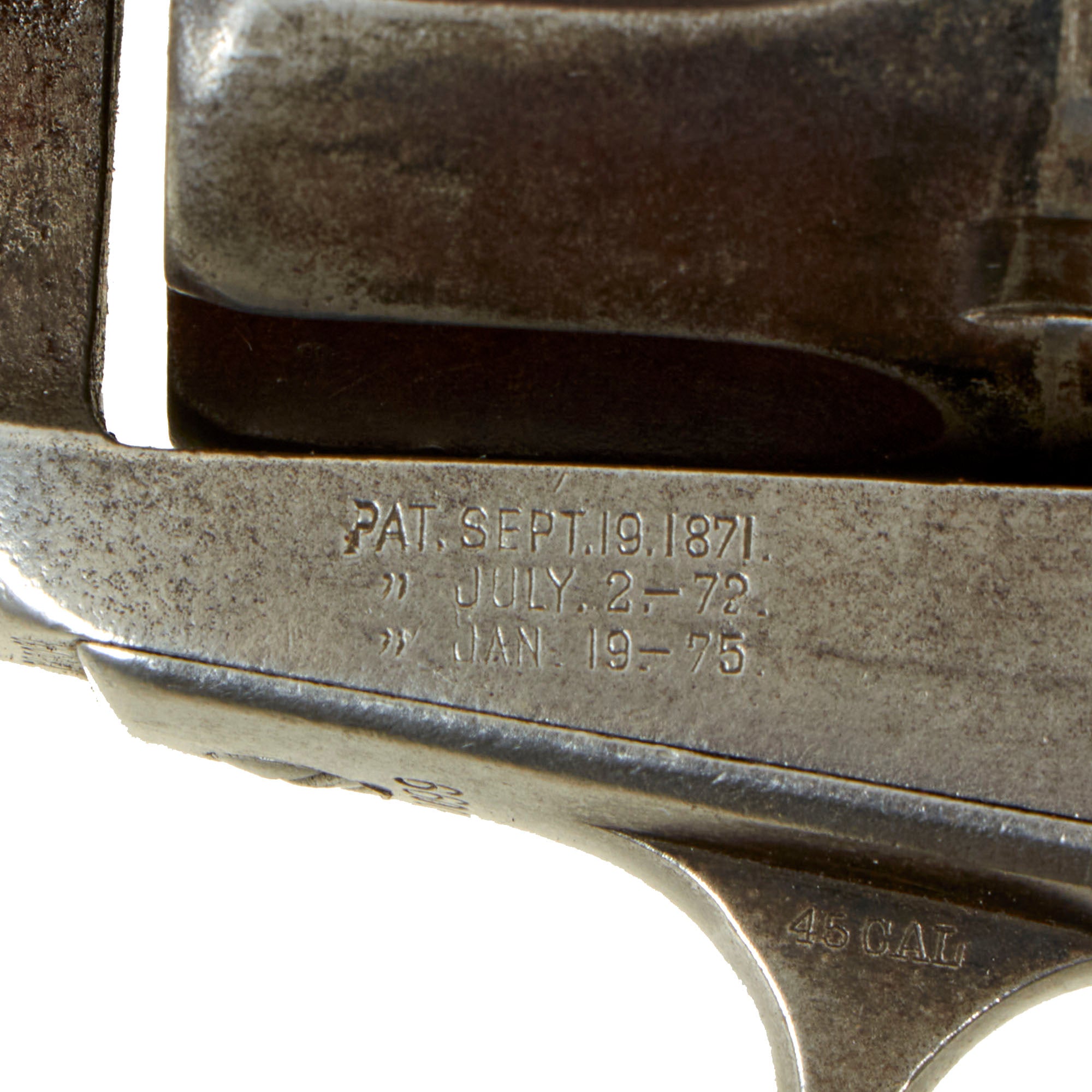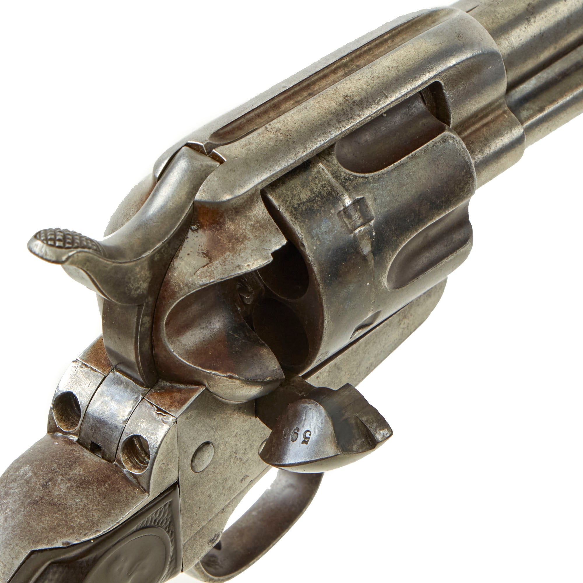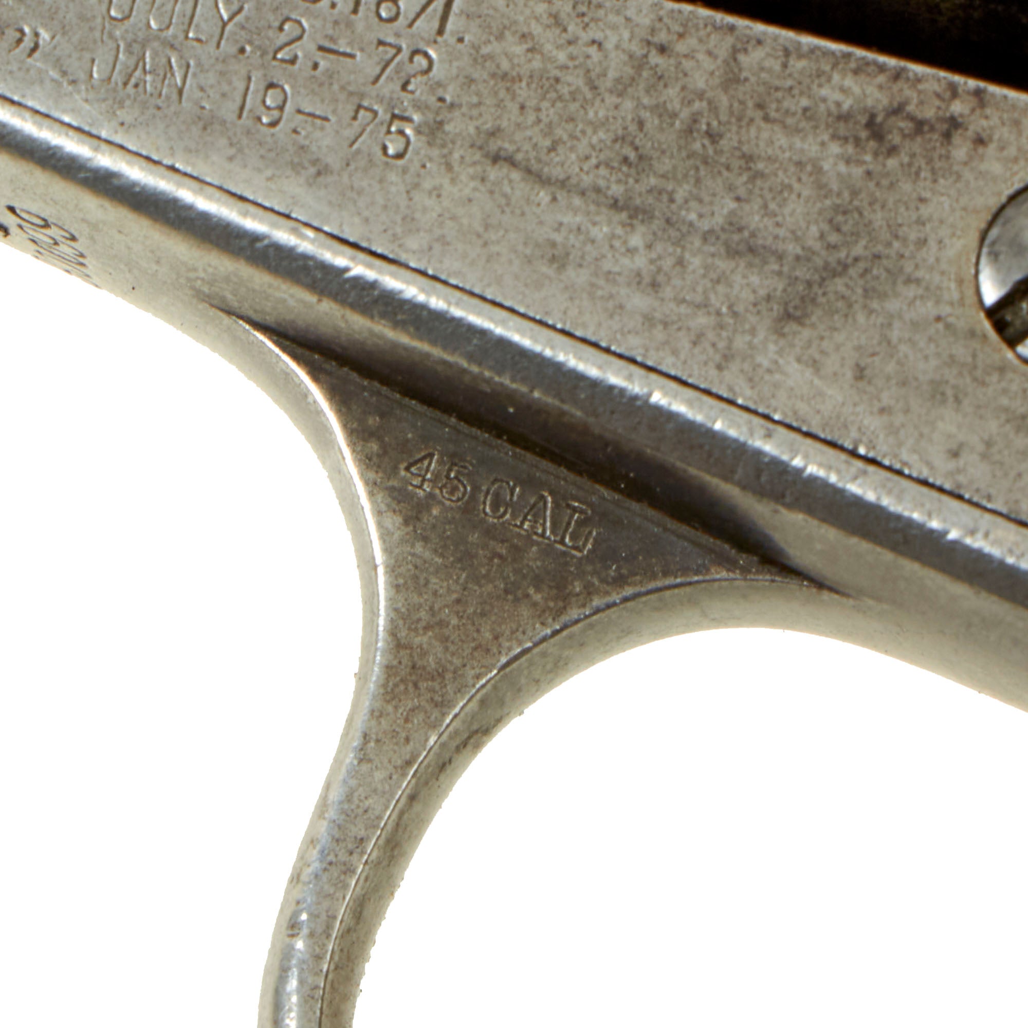 These are the early 2nd pattern markings, and this was made before the "Prancing Pony" logo began appearing on the frame. The markings are all relatively clear, so this revolver does not look to have been refurbished at any time, which would have worn down the markings during refinishing. The caliber marking 45 CAL is still present on the trigger guard, and we also have checked the cylinder and barrel with real cartridges to confirm. This revolver is definitely chambered for .45 Colt, also known as .45 "LONG" Colt, one of the most legendary handgun cartridges of the old west. When you hear people talk of a "Colt 45", this model gun is the reason why.