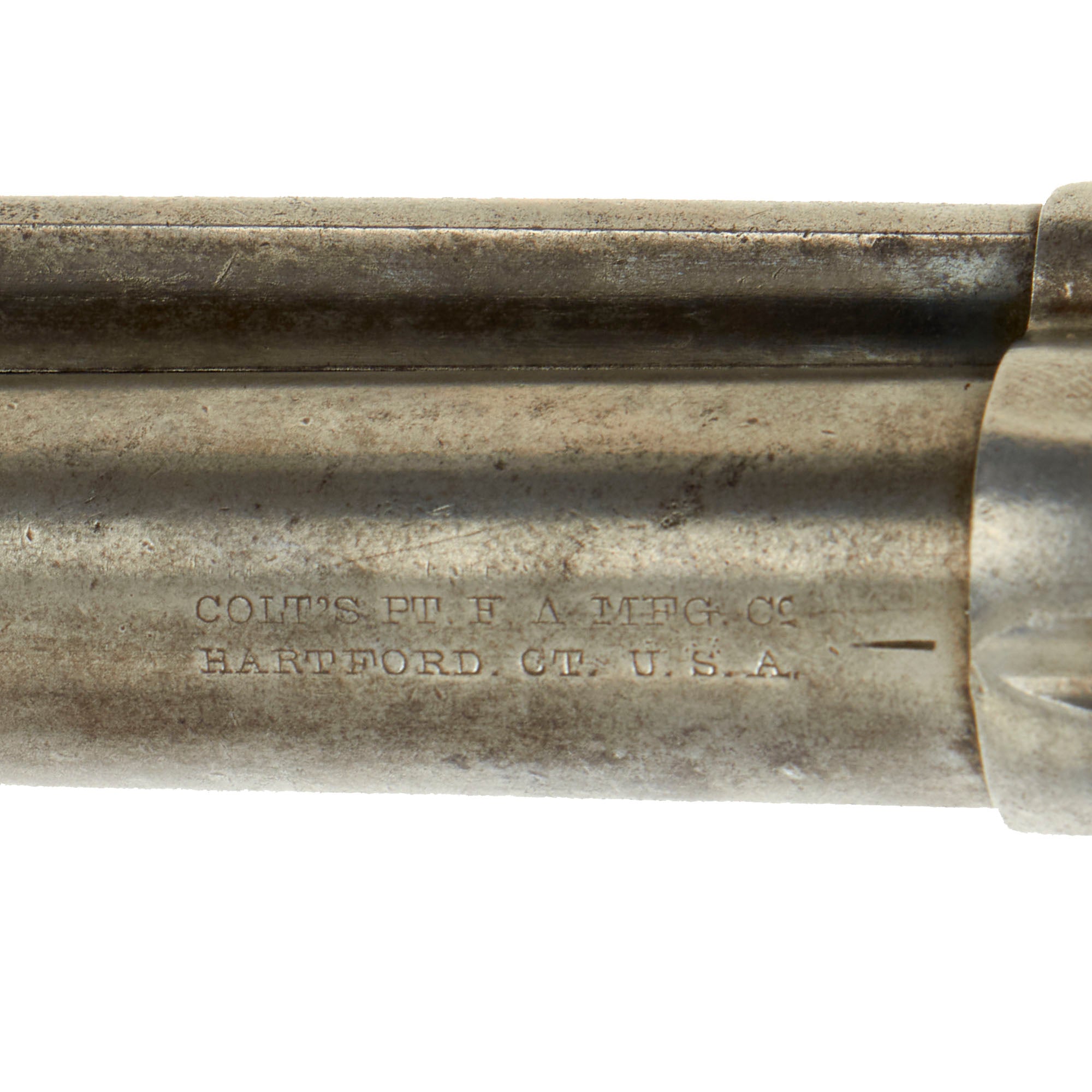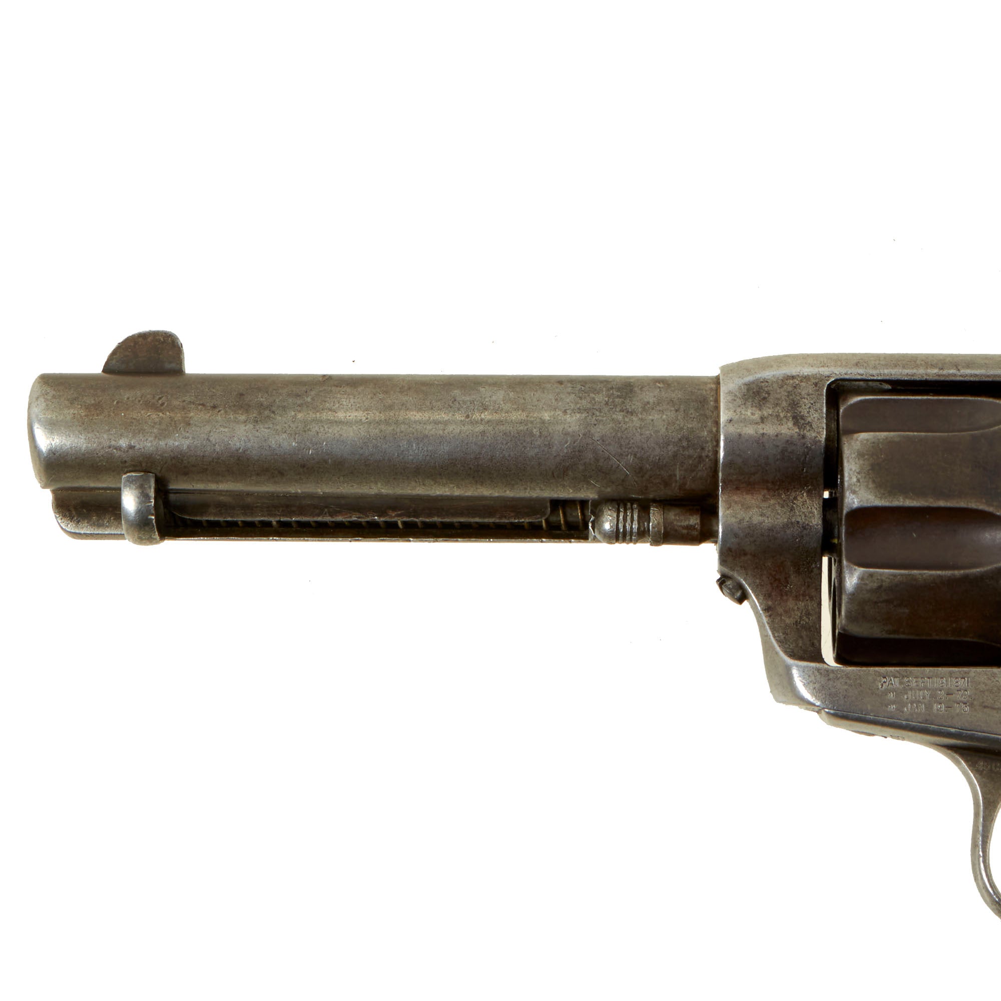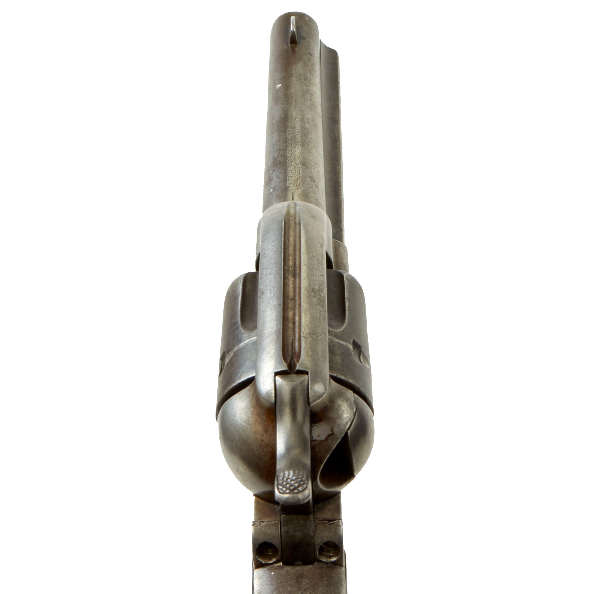 These are the early 2nd pattern markings, and this was made before the "Prancing Pony" logo began appearing on the frame. The markings are all relatively clear, so this revolver does not look to have been refurbished at any time, which would have worn down the markings during refinishing. The caliber marking 45 CAL is still present on the trigger guard, and we also have checked the cylinder and barrel with real cartridges to confirm. This revolver is definitely chambered for .45 Colt, also known as .45 "LONG" Colt, one of the most legendary handgun cartridges of the old west. When you hear people talk of a "Colt 45", this model gun is the reason why.
