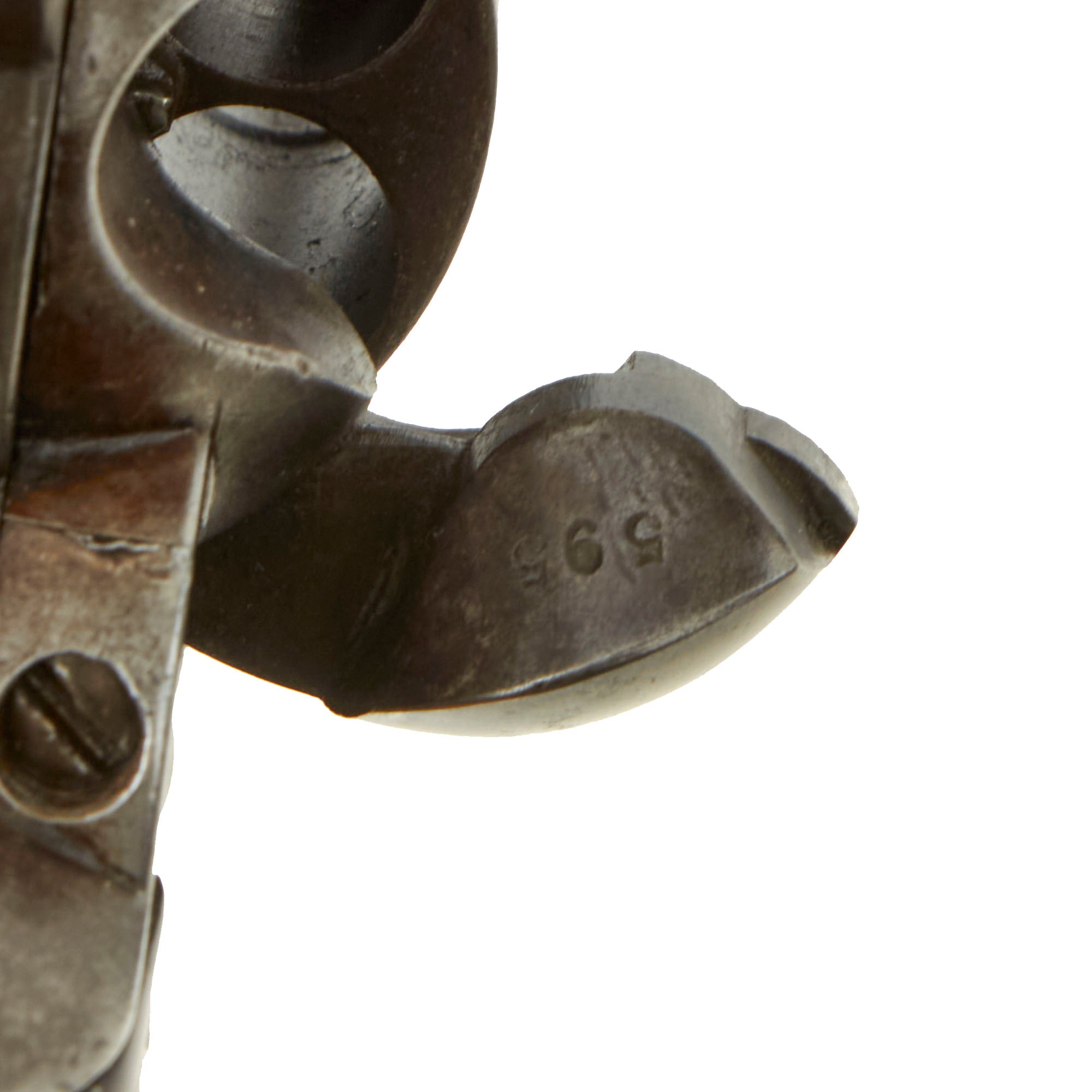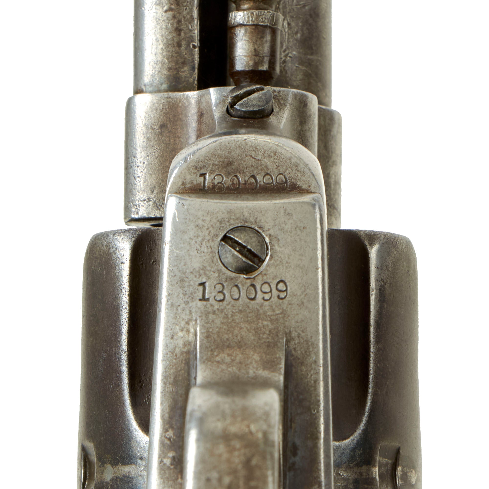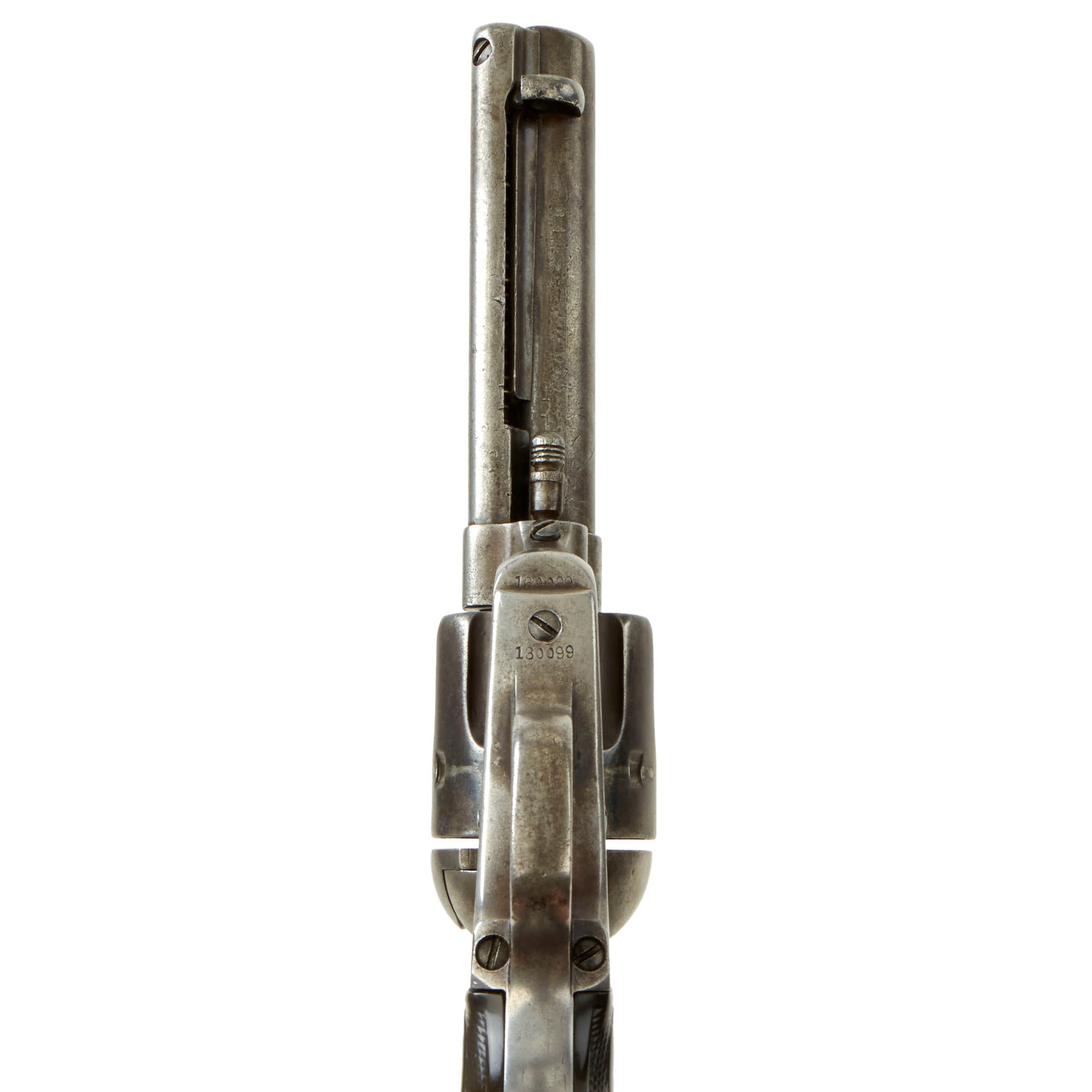 The revolver's serial number is 130099, which dates production to 1890. It has the serial number on the frame, trigger guard, and grip frame, making this a very nice "ALL MATCHING" example, without any parts swapped out over the years. This revolver was made after 1883, when Colt stopped marking the cylinders, which they did not do again until 1912. There is also assembly number 595 marked on the loading gate. It is in full working order and condition, with a great patinated look, sure to delight any "Old West" Americana collector.