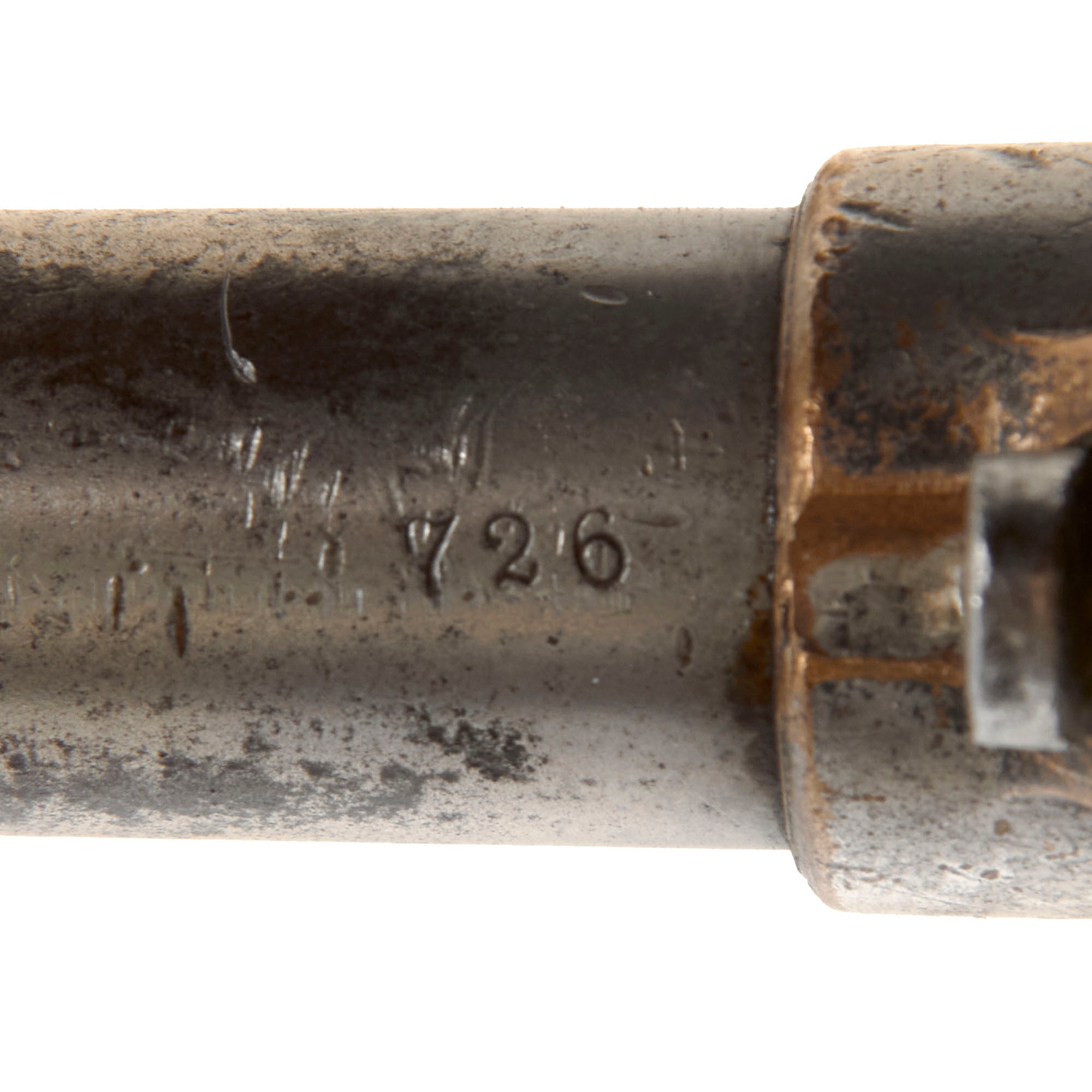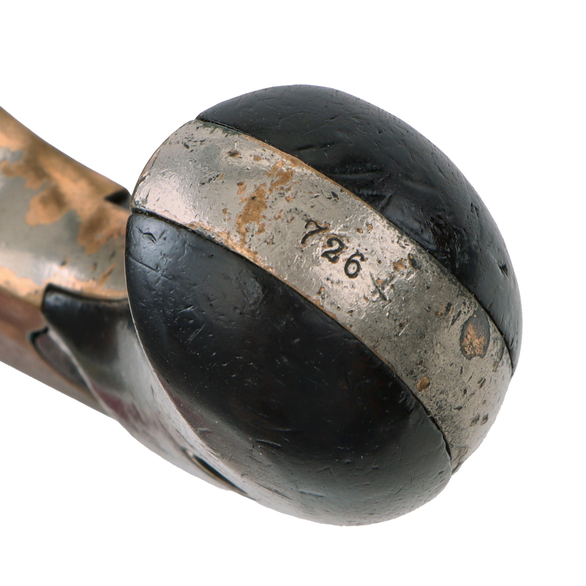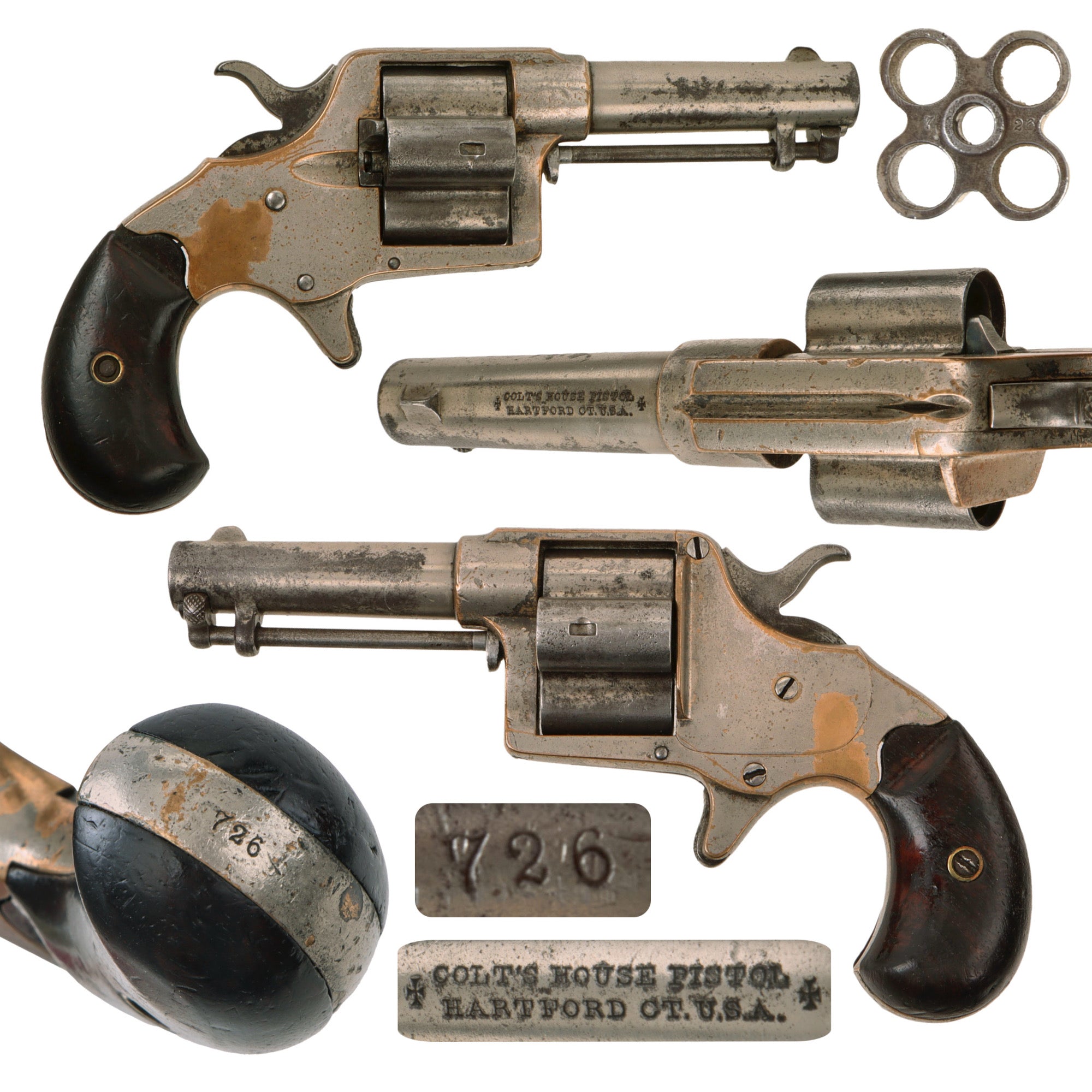 The revolver is stamped with serial number 726 on the bottom of the grip, the bottom of the barrel, the front of the cylinder, and written in pencil on the inside of the left grip scale. That makes this a great "ALL MATCHING" example, with no parts swapped out over the years! Colt records indicate this revolver was produced in 1871, the first year of production. The revolver still retains most of the original nickel plating on the brass frame, with areas of wear through on the sharp edges and on the sides of the action behind the trigger. The steel barrel and cylinder show less of the plating, which commonly wears away due to oxidation.