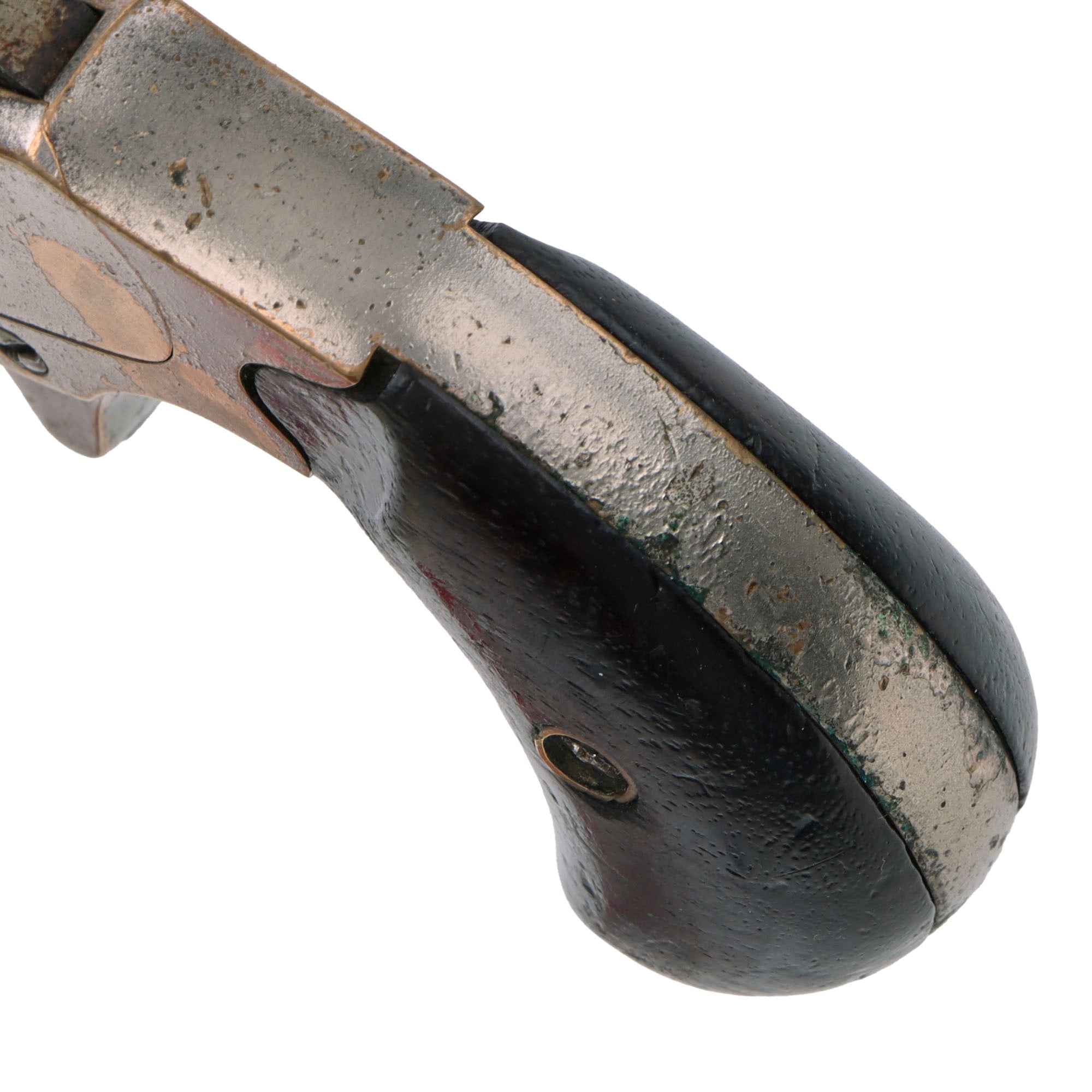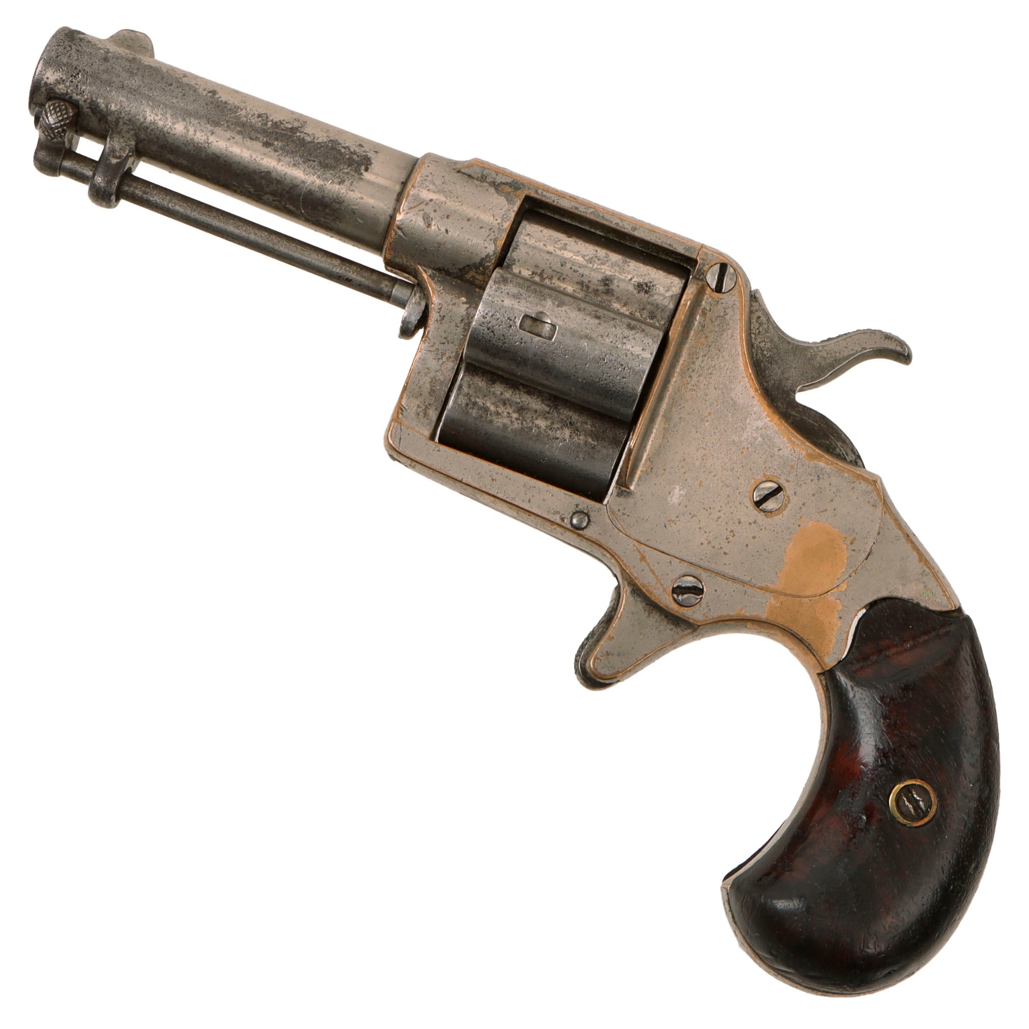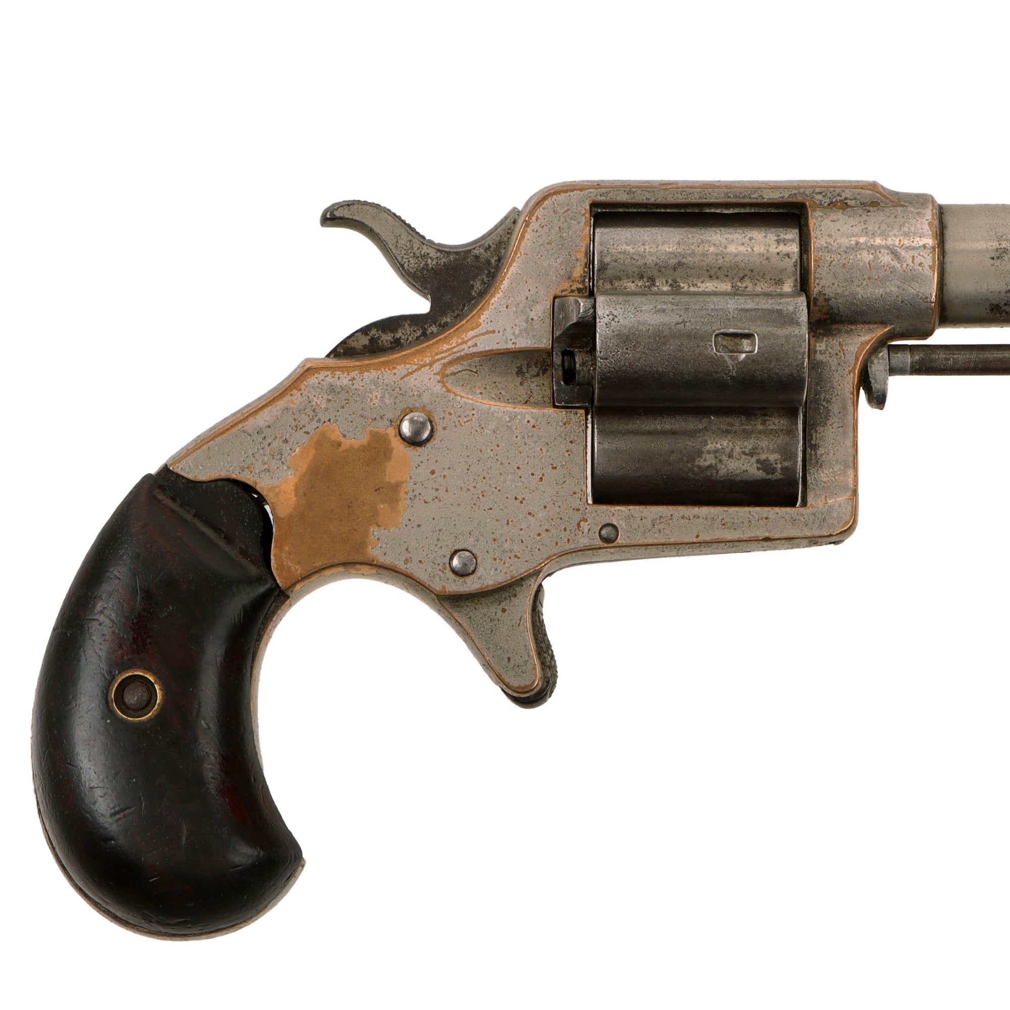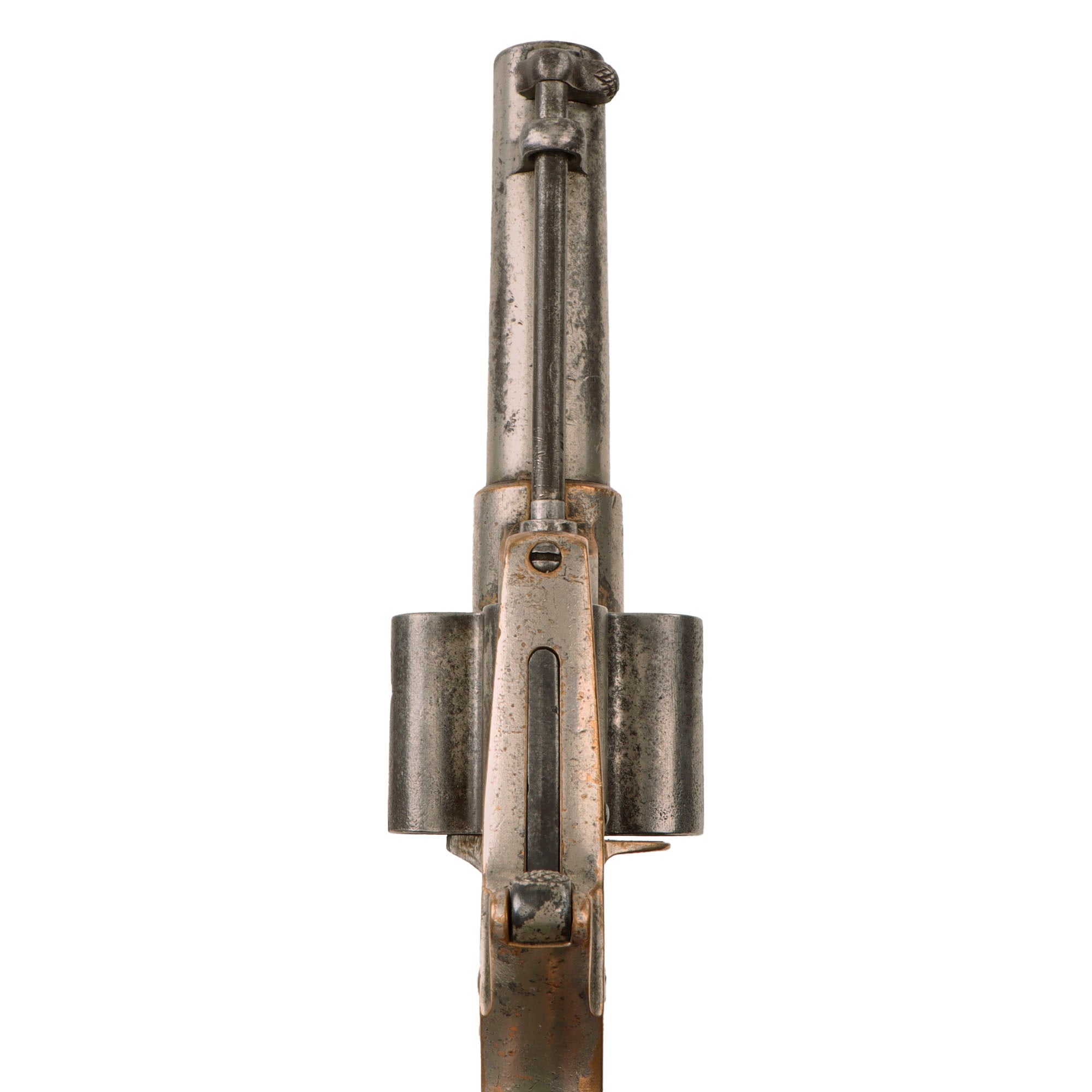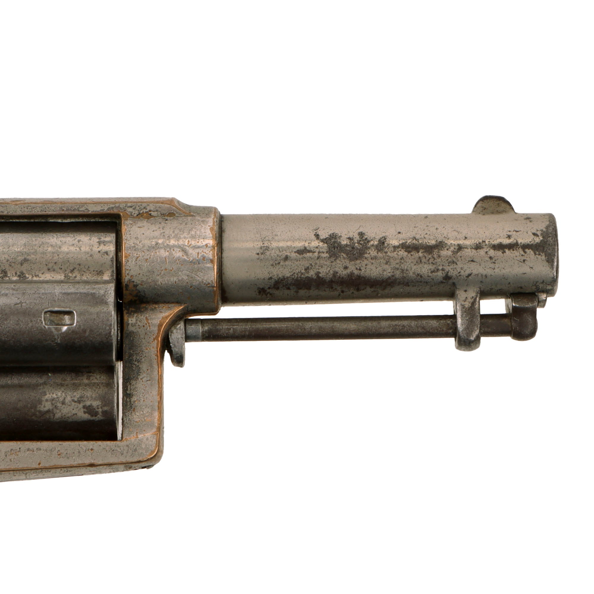 The revolver cycles well with a strong dry fire and good indexing, with a functional loading position. As with all revolvers of this age it can be finicky at times, so we recommend cycling it gently. The ejector rod is still present and functional. The bore shows clear rifling, with a partly bright finish, speckled over all with patches of oxidation and fouling. The walnut grips do show a bit of wear, but no repairs or major damage, and have a lovely color and grain.
