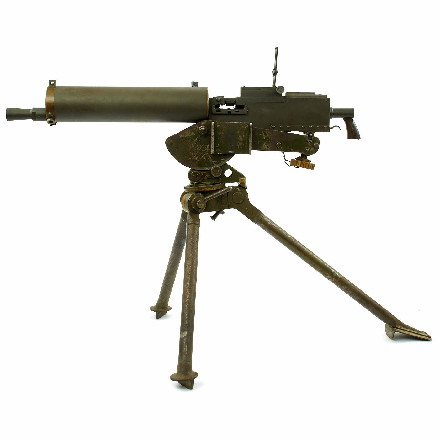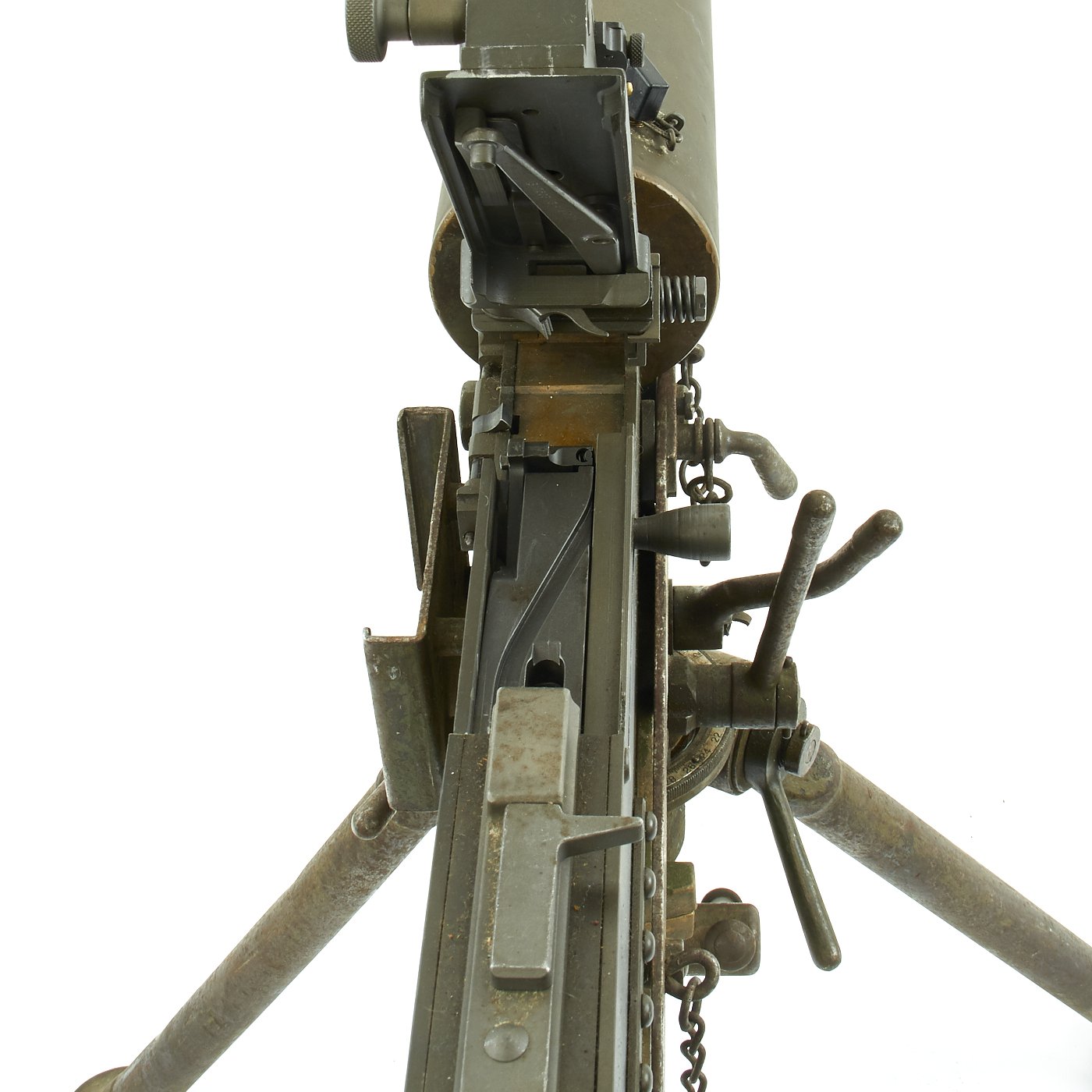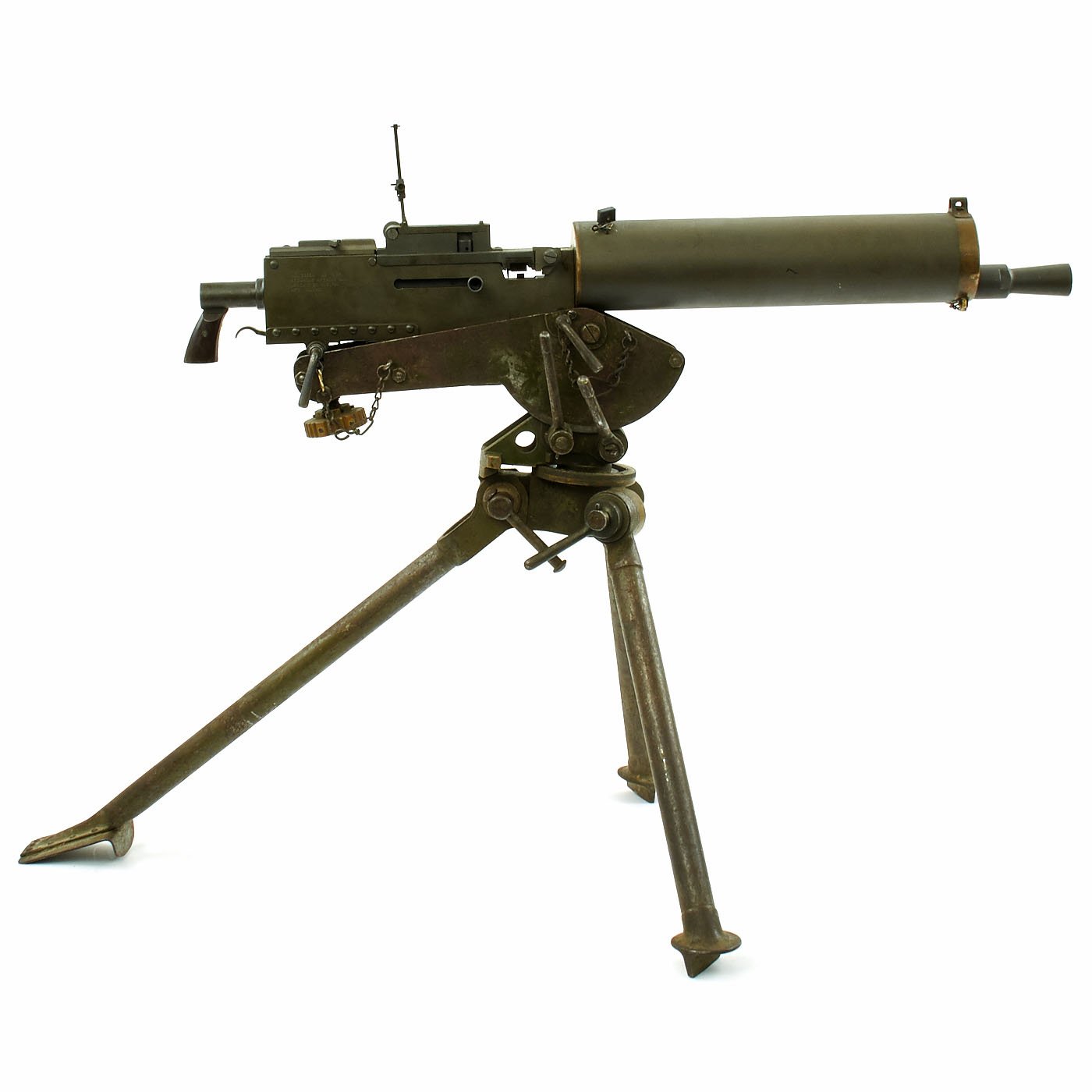 Original Items: Only One Available. Fantastic Colt Commercial Model 1928 Browning water cooled machine gun as re-manufactured on BATF approved non-firing dummy right side plate. All parts other than the right side plate and altered bolt are original issue parts. Also included is an original Colt 1928 contract tripod with fully functional locks, azimuth, legs and mounting pins. In the 40 years that IMA has been in business, this is the most complete, finest condition, original .30 caliber 1928 Browning Display Machine we have ever offered.