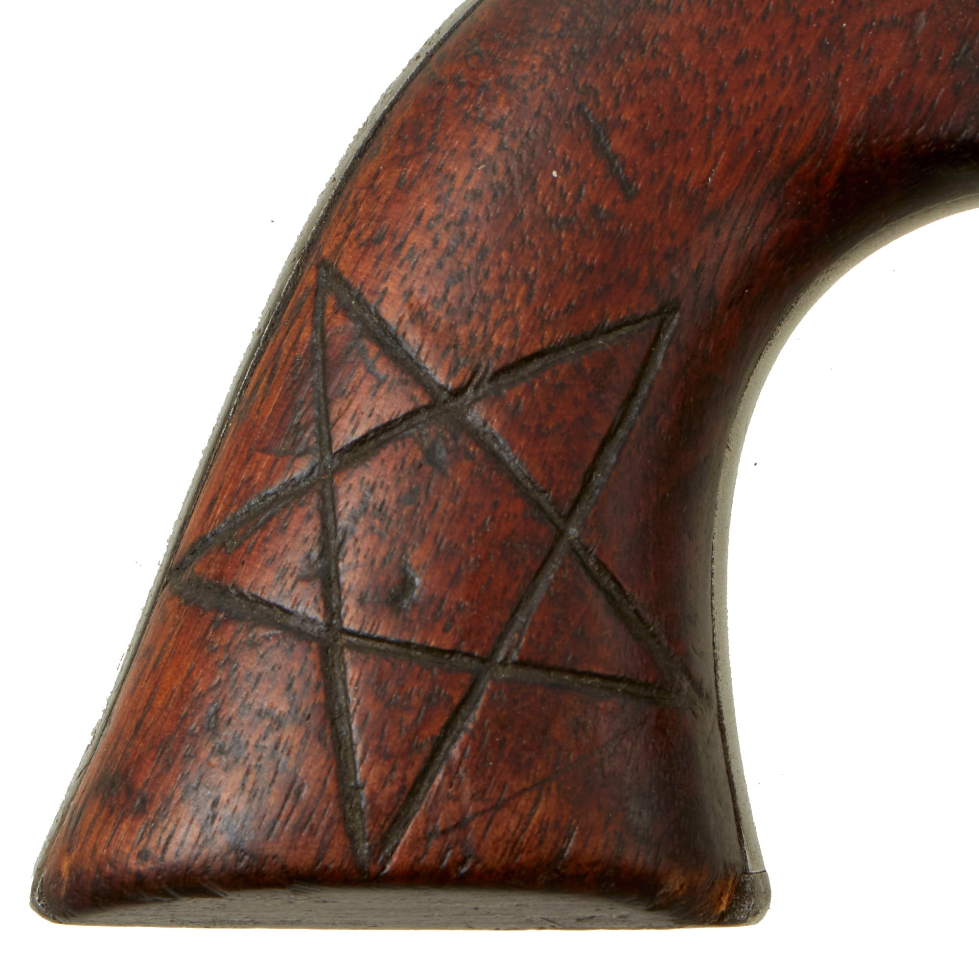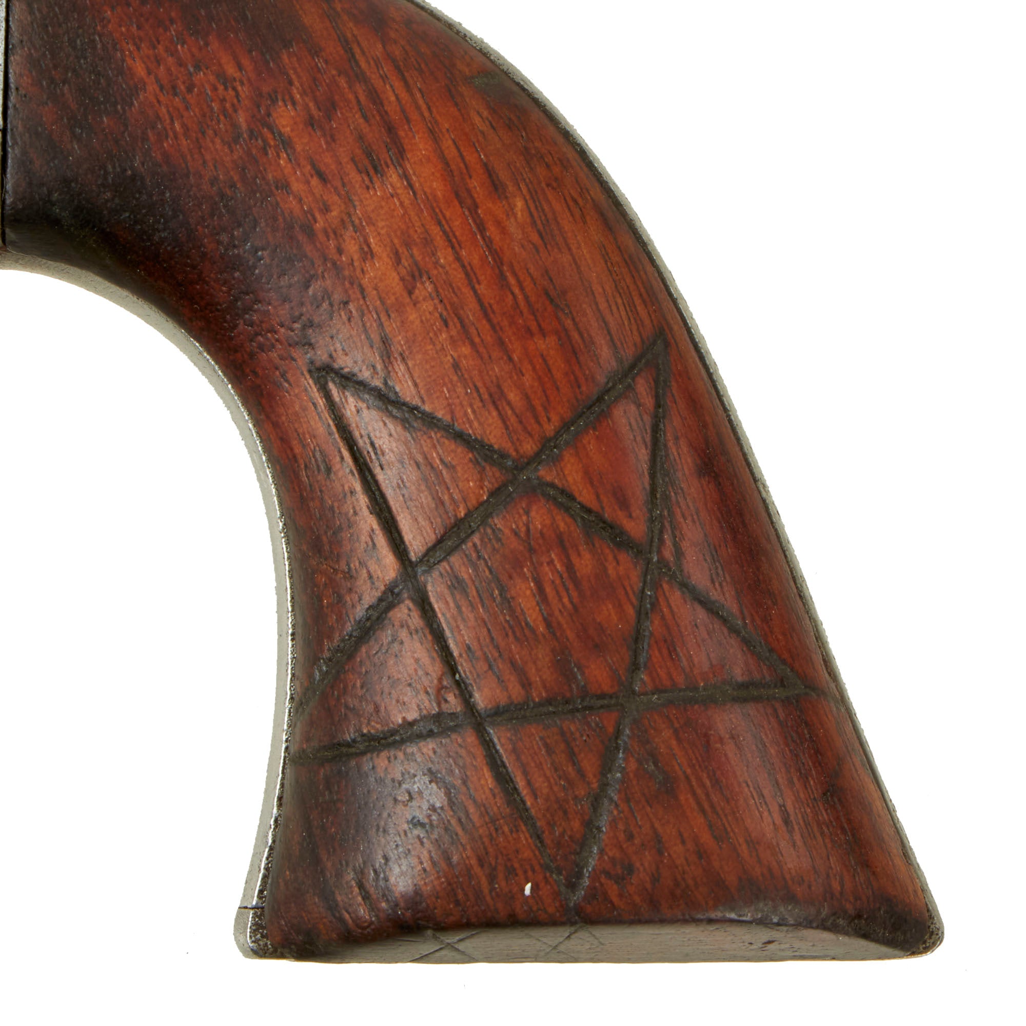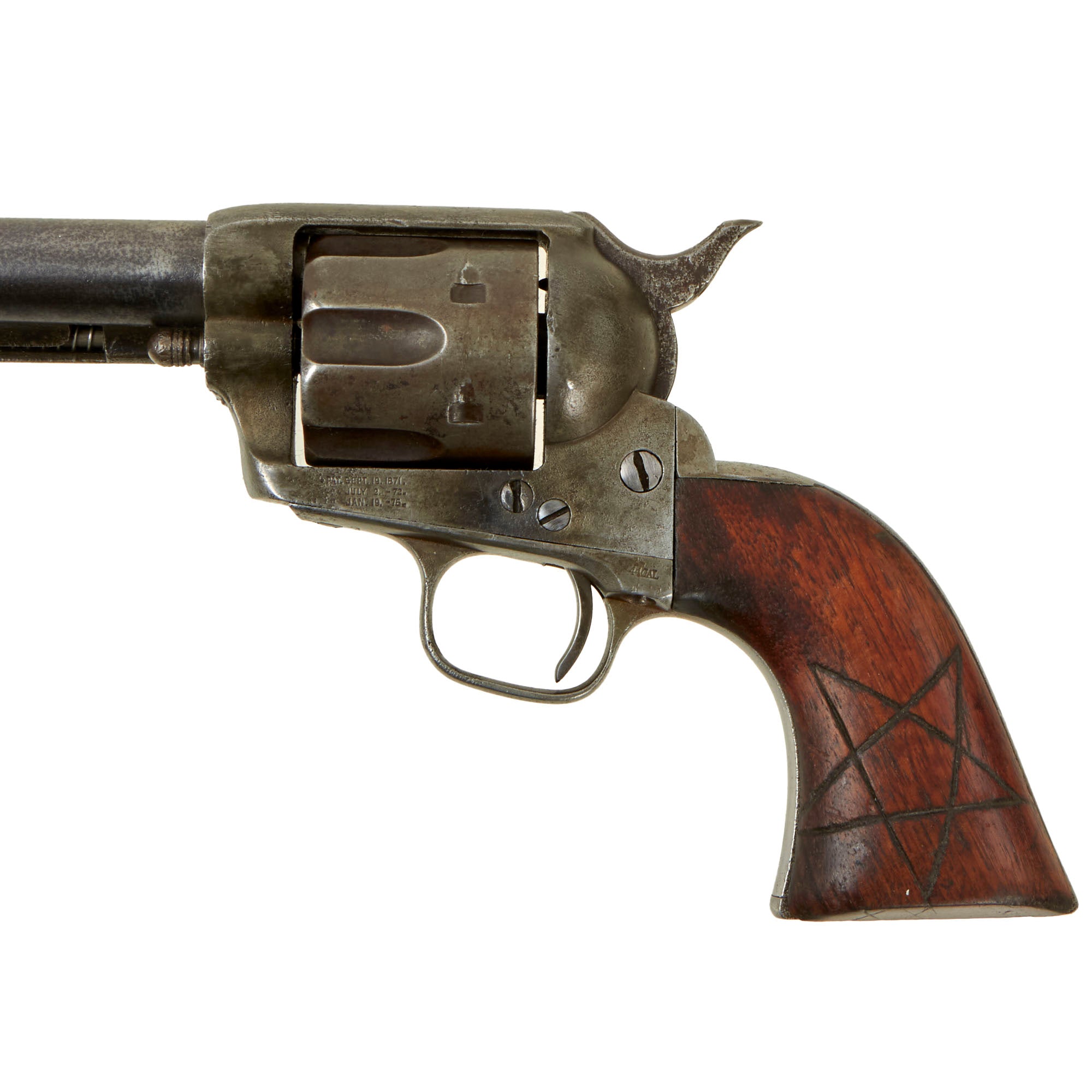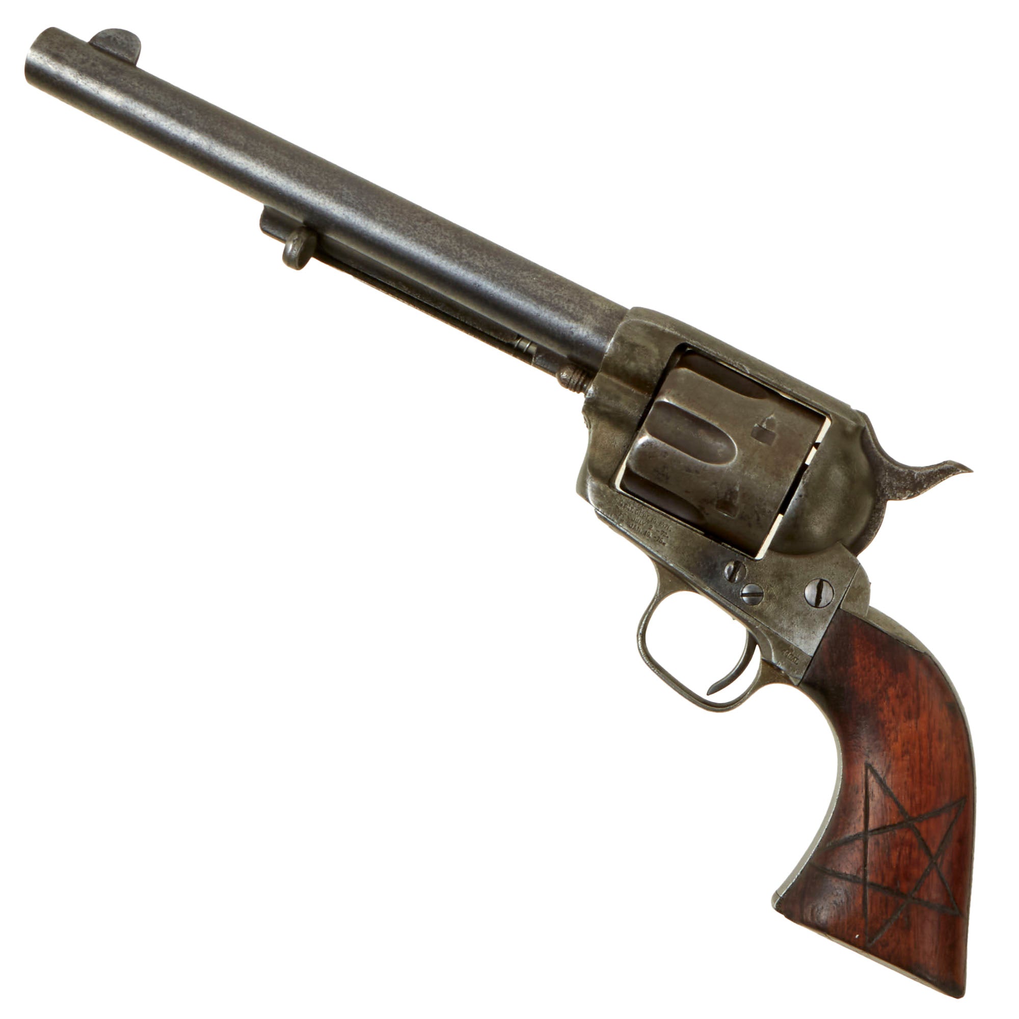 Original Items: Only One Set Available. This is it! Every young "Old West" fans dream: A real Colt Cowboy Six-shooter! This lovely Colt Frontier Six Shooter SAA (Single Action Army) Revolver has a full length 7 1/2" barrel with a great bore, showing a lovely worn gray patina on the metalwork, with some areas of light pitting. It has a lovely walnut grip, customized with 5 pointed stars on each side long ago, which still have a lovely color. This definitely looks to be an example that saw long use on the frontier, giving it an impossible to duplicate look!