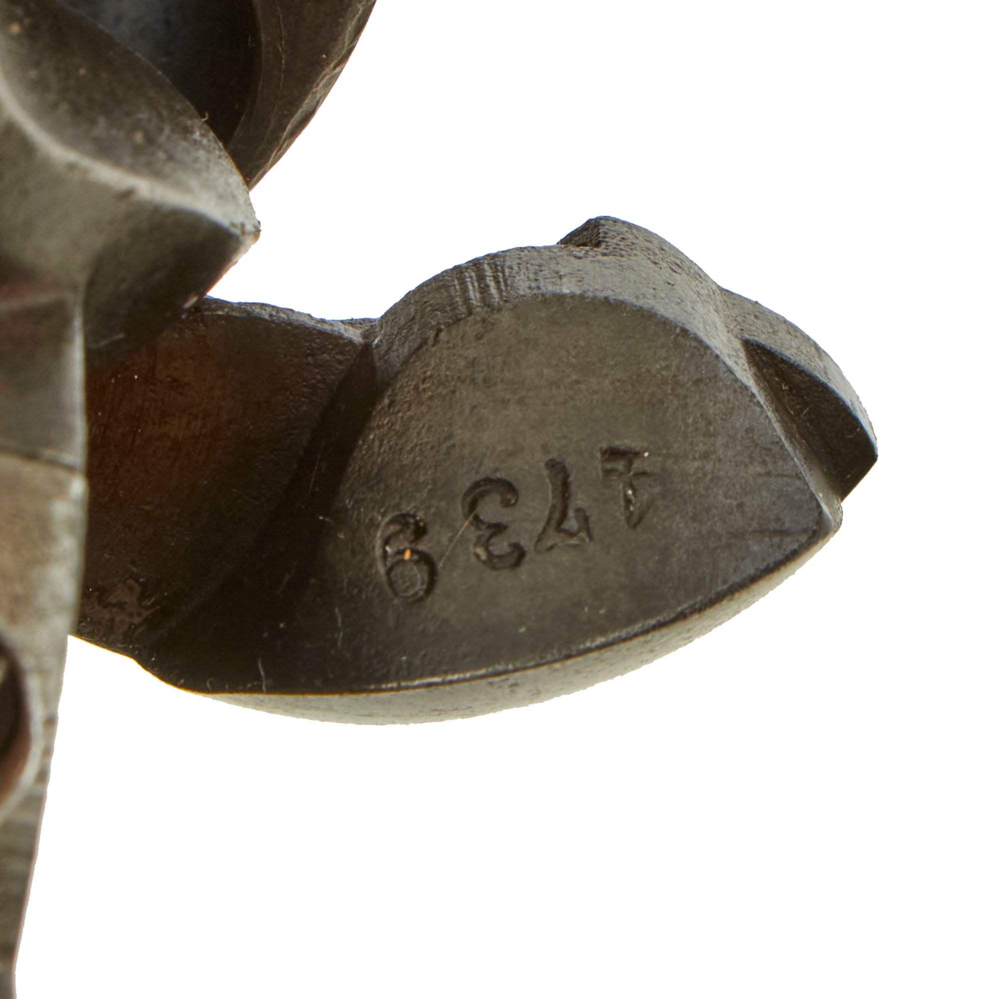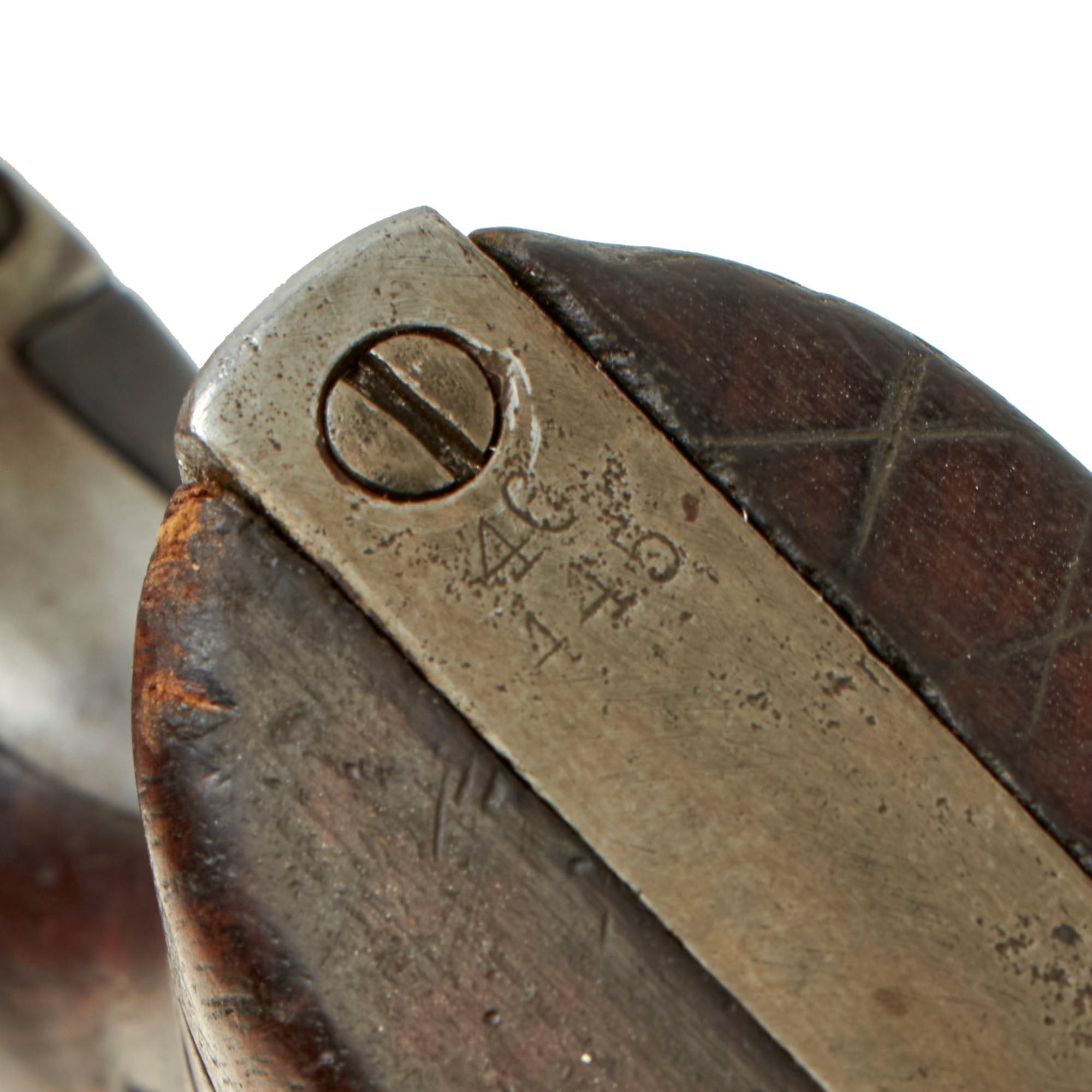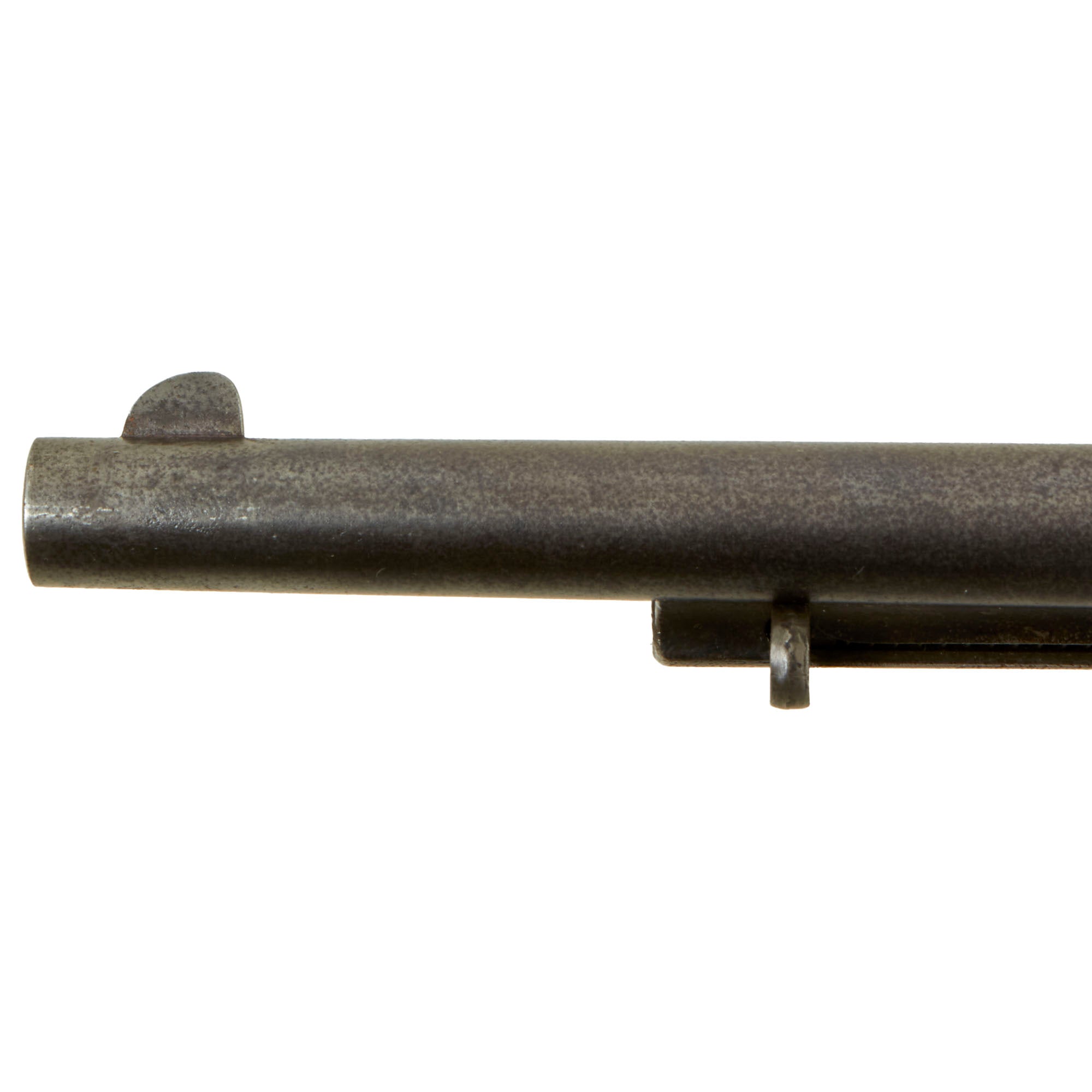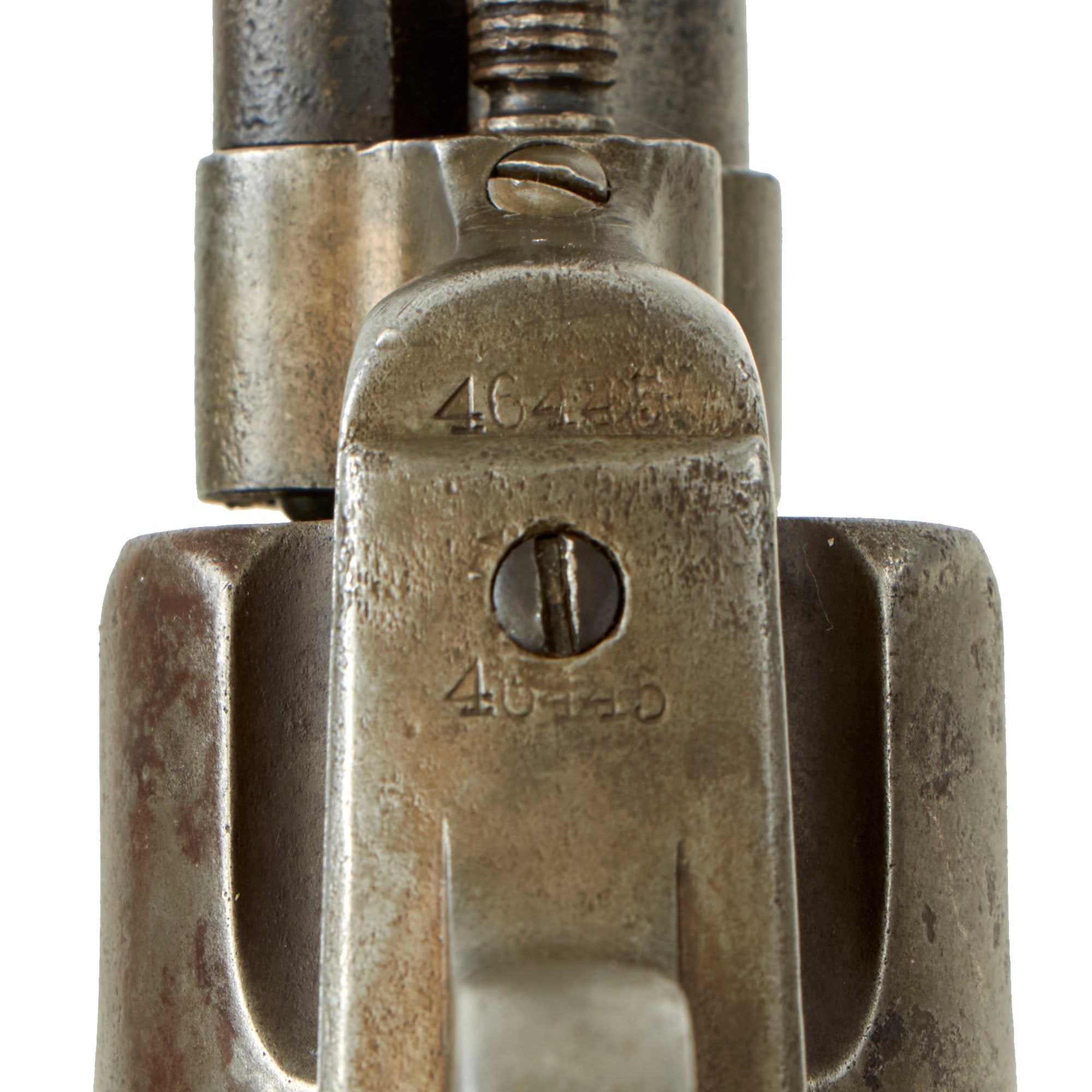 The bore is in truly excellent condition, showing a bright finish with crisp lands and grooves. There is very little sign of use, which leads us to believe that it was possibly replaced at some point, as it definitely was not sleeved. The cylinder chambers do appear to have been partially sleeved from the rear, and are in great shape. The ejector door swings open easily, and the ejector does work, however it is definitely a replacement that is too long. This makes it very difficult to take out the cylinder when the ejector is installed, as it does not retract all the way into the housing. Overall this is a great pistol with loads of patina and history.