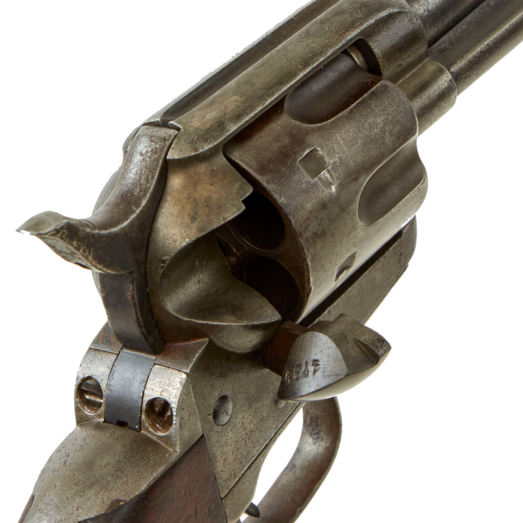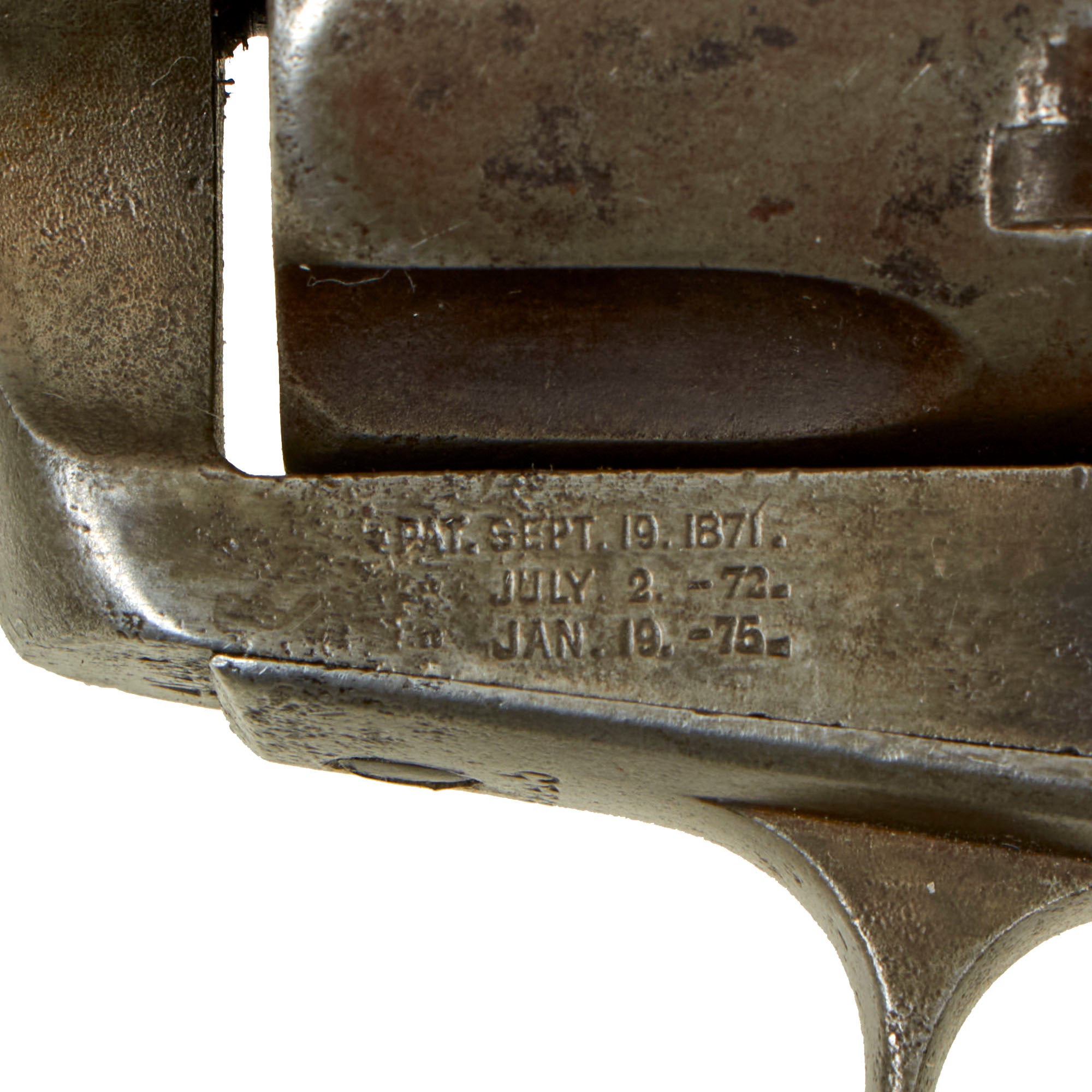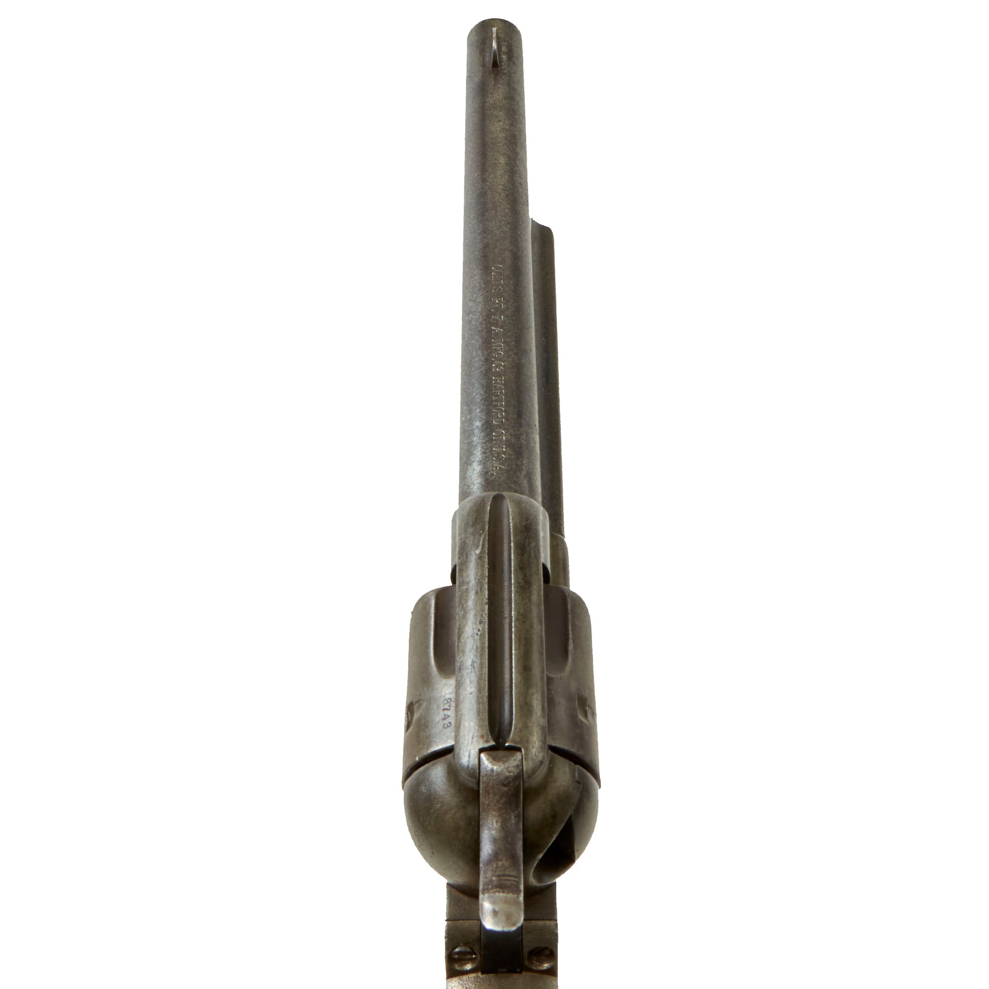 The revolver's serial number is 46445, which dates production to 1878. It has the serial number on the frame, trigger guard, and grip frame. The serial number on the cylinder is however 8743, so this is a non-matching period replacement, made during or before 1883, when colt would stop marking these until 1912. That makes this a very nice "Mostly Matching" example, with a swapped cylinder, and possibly a period replaced barrel. There is also assembly number 4739 marked on the loading gate. It is in full working order and condition, with a great well patinated look, sure to delight any "Old West" Americana collector.