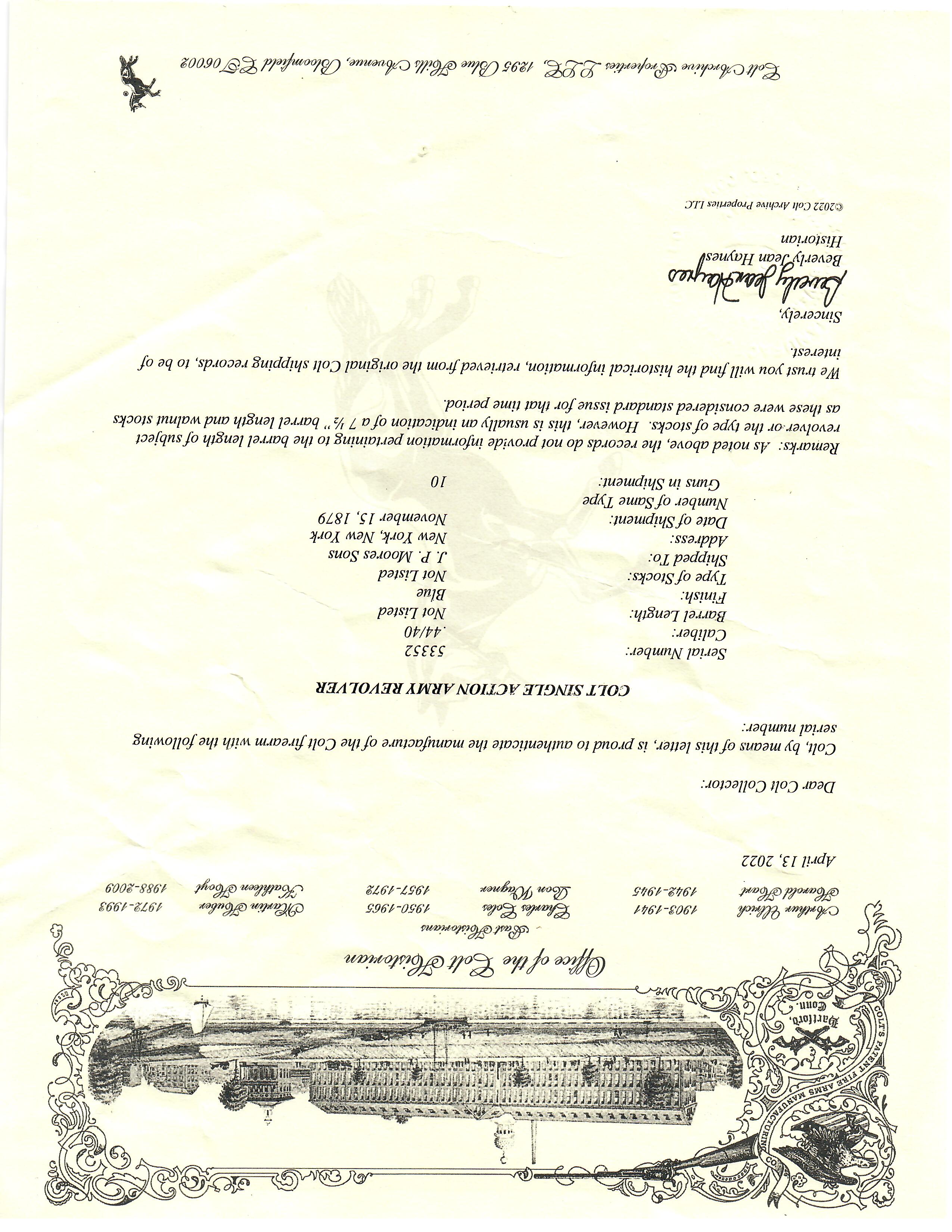 The revolver came to us with an original Colt Factory letter from the office of the Colt Historian Beverly Jean Haynes. It is dated April 13, 2022, and indicates it is a COLT SINGLE ACTION ARMY REVOLVER in .44/40 caliber, also known as a Frontier Six Shooter. The gun was made with a Blue finish, and there is no listing for barrel length, which usually indicates the full length 7 1/2". There is no listing for the stocks, which usually indicates rubber, so the original grips on this revolver may have been swapped out. The gun was shipped on November 15, 1879 as part of a shipment of 10 similar guns to J. P. Moores Sons in New York, New York. This firm was a major distributor of Colt firearms in New York City, and was in business from 1859 until 1888 when the business was sold to Schoverling, Daly & Gales.