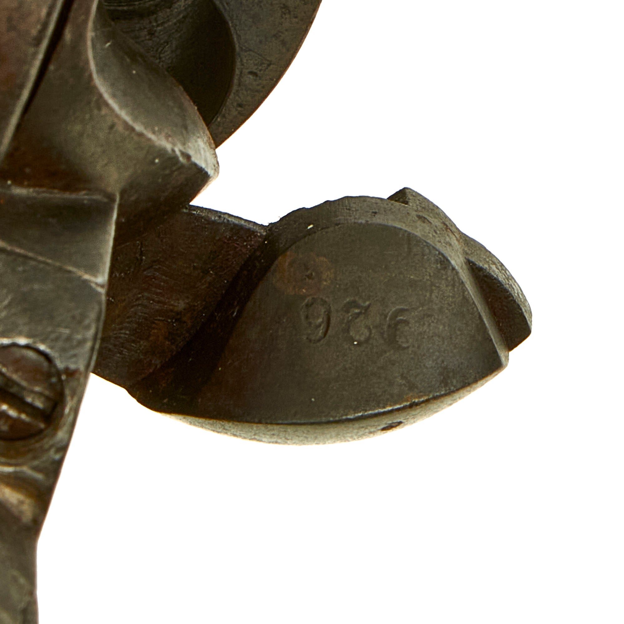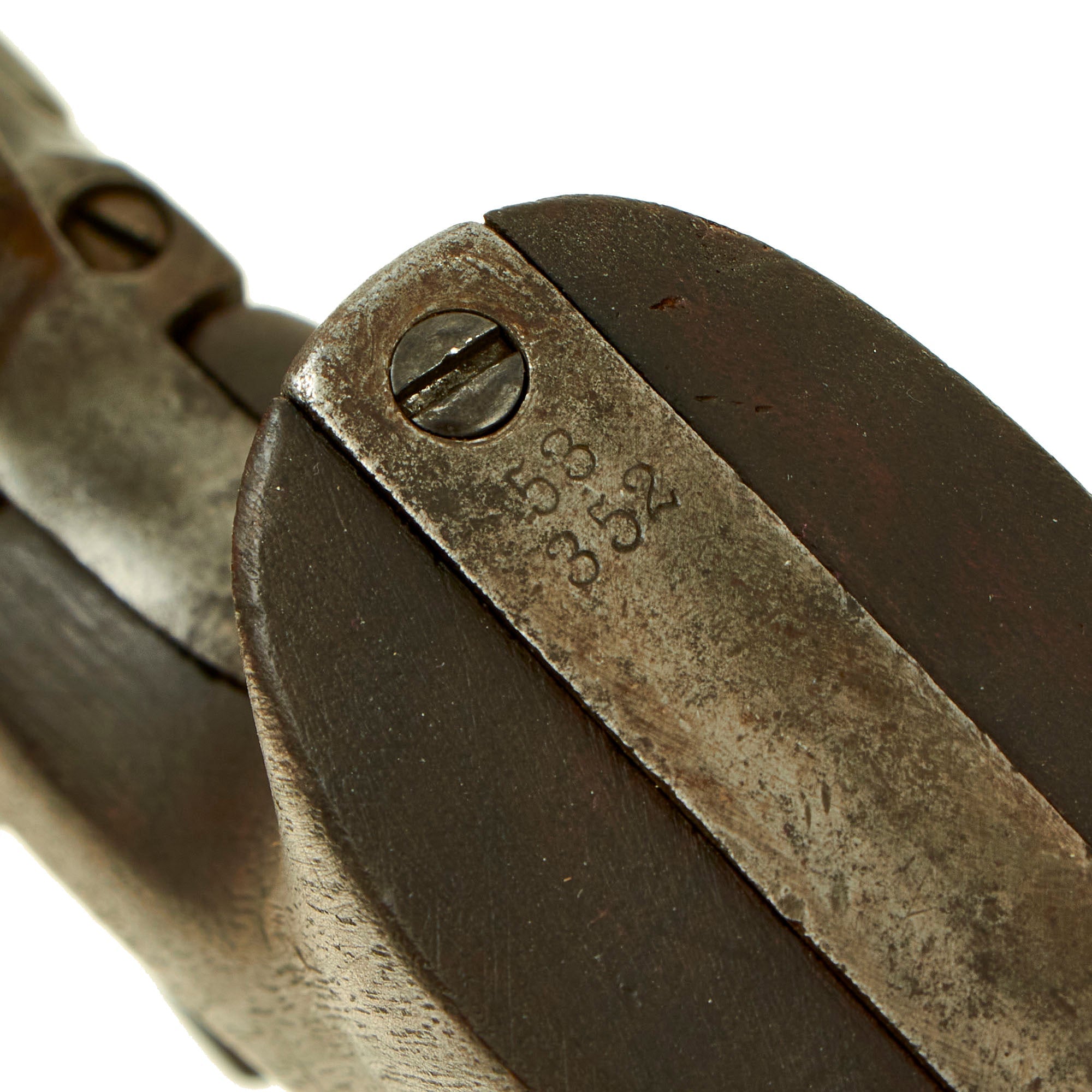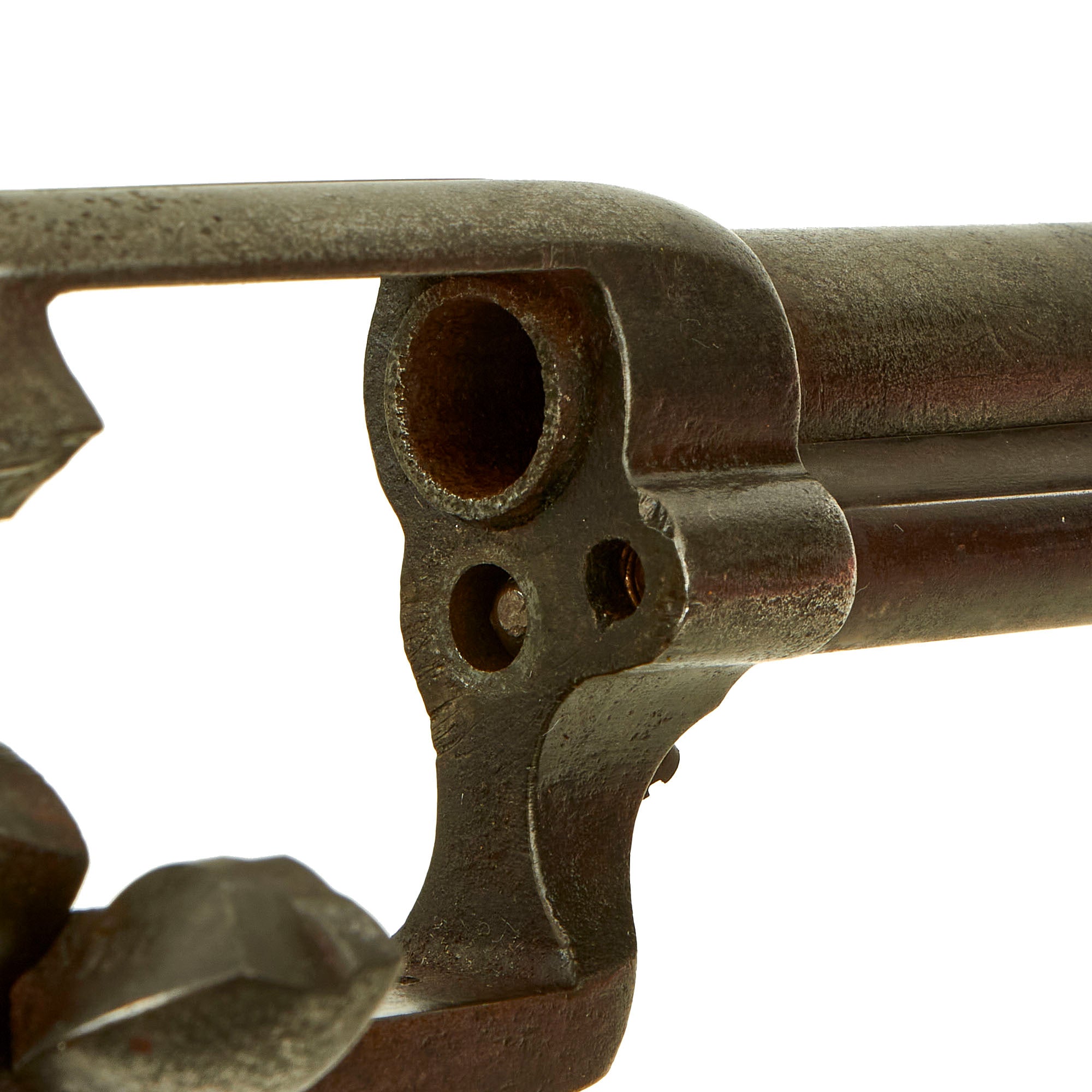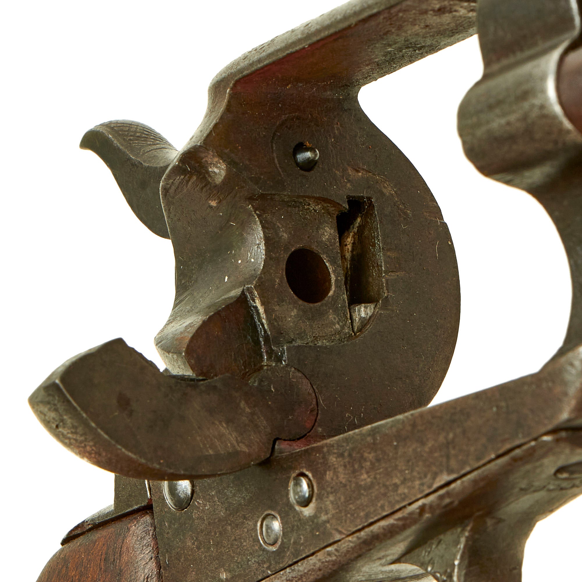 Mechanically, the action is smooth, with a good cylinder lock up, and strong mainspring. The action has all four clicks, with a working loading position. There is definitely some slop in the action though, due to wear on the stops on the cylinder, so at full cock the cylinder can be moved back and forth more than normal. As with all revolvers of this age we recommend being very gentle with cycling it, so we do not recommend "fanning" or "fan firing". The bore is in good condition, and does show rifling, however there is also a lot of past fouling and cleaned away oxidation. This is definitely a revolver that saw extensive use on the frontier. The ejector door swings open easily, and the ejector itself works great. Overall this is a great pistol with loads of patina and history.