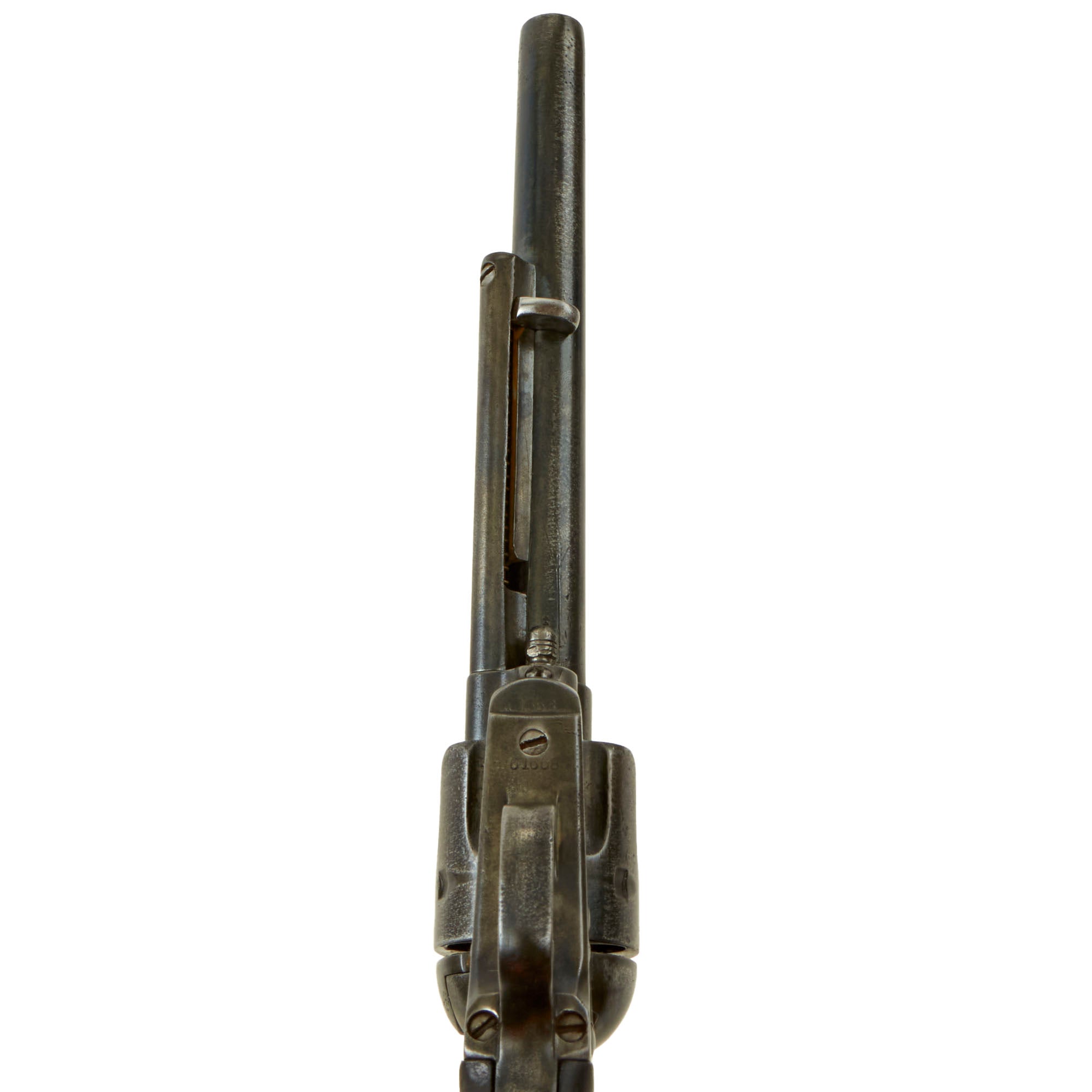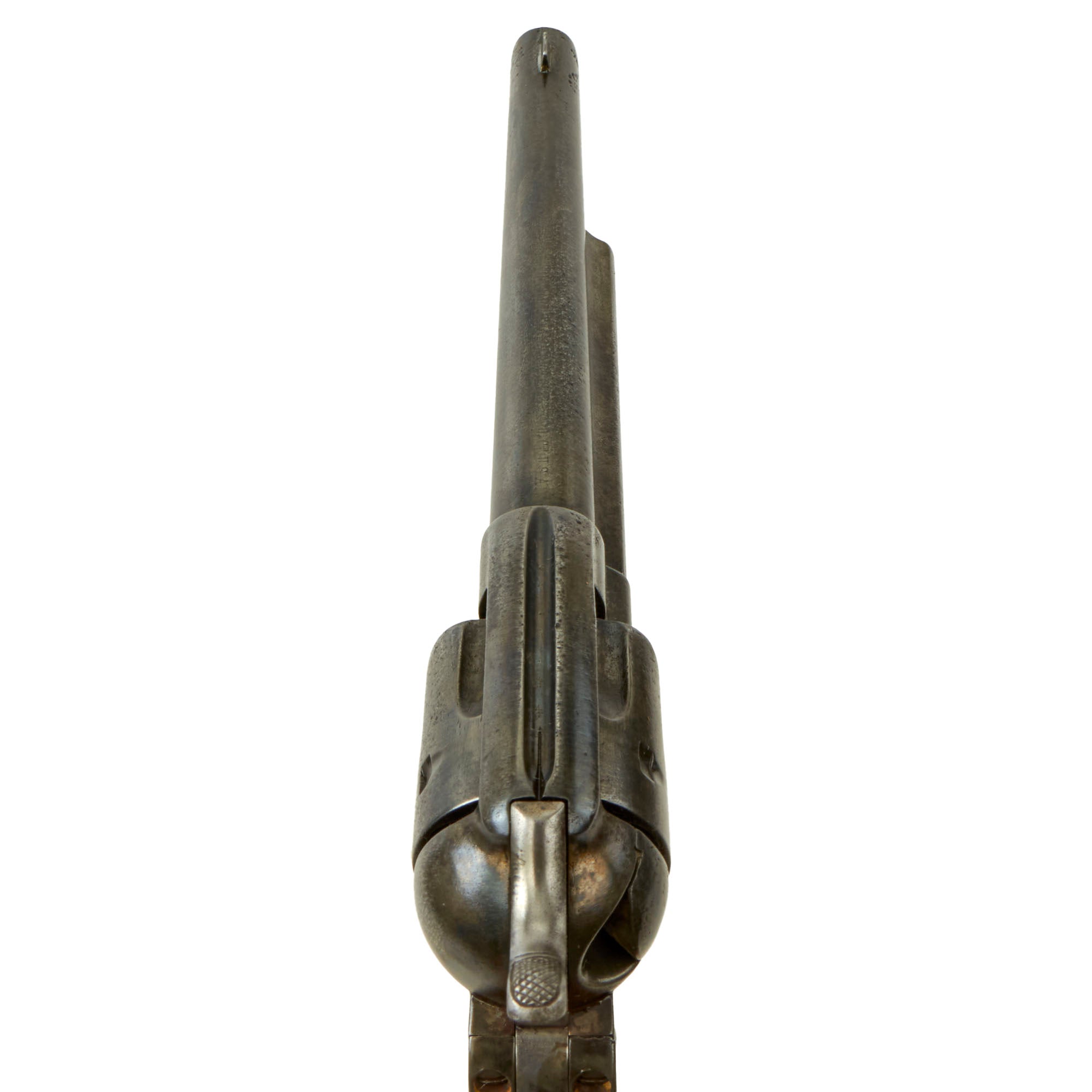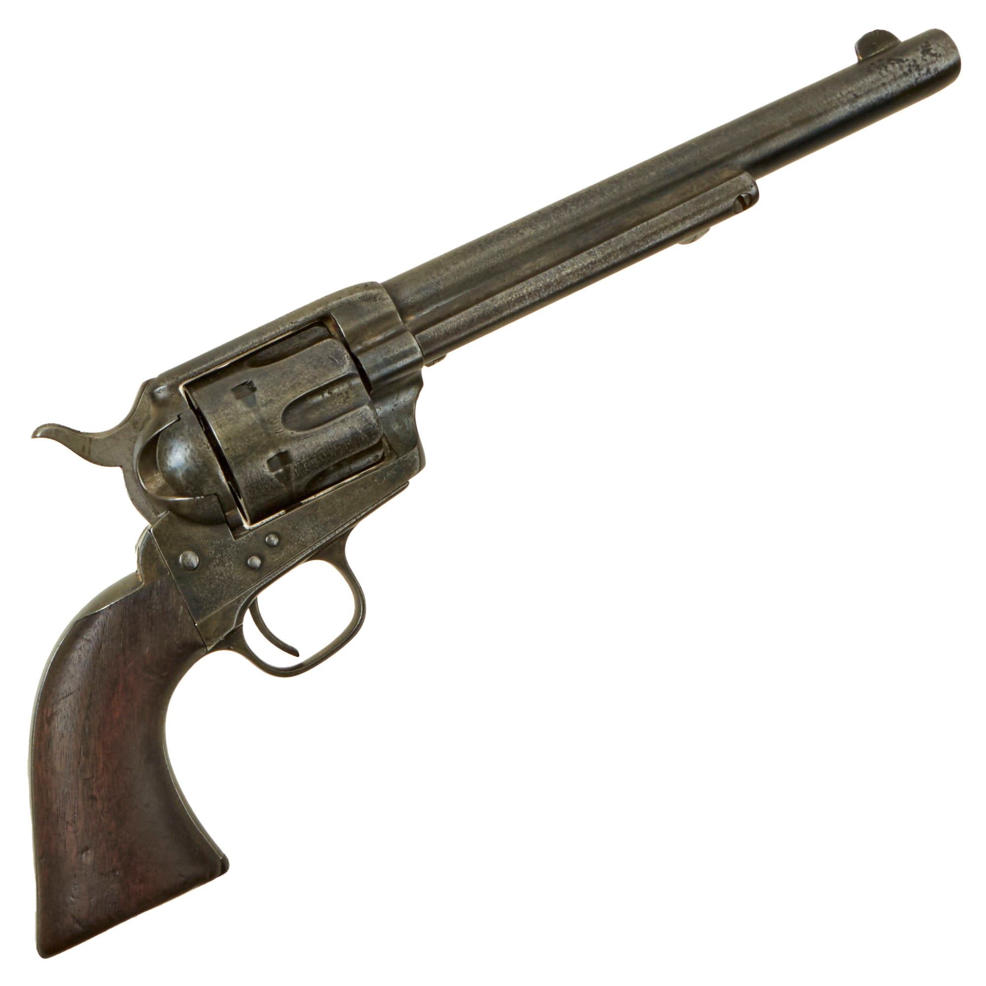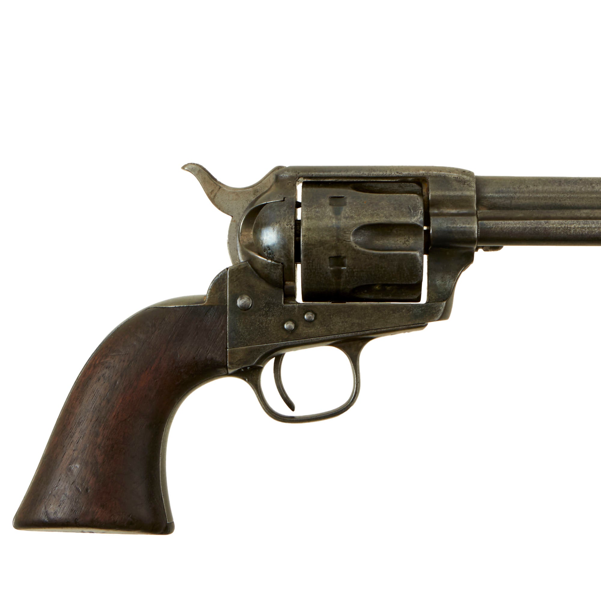 As this revolver was manufactured in 1880, it originally would have had an etched panel that read "Colt Frontier Six Shooter", as the serial number range for such marked revolvers was between 45000 and 65000. Unfortunately wear has completely removed this marking. Revolvers like this were marketed to the civilian frontier market, as the U.S. Cavalry issued the identical model finished in blue with U.S. marked rubber grips.