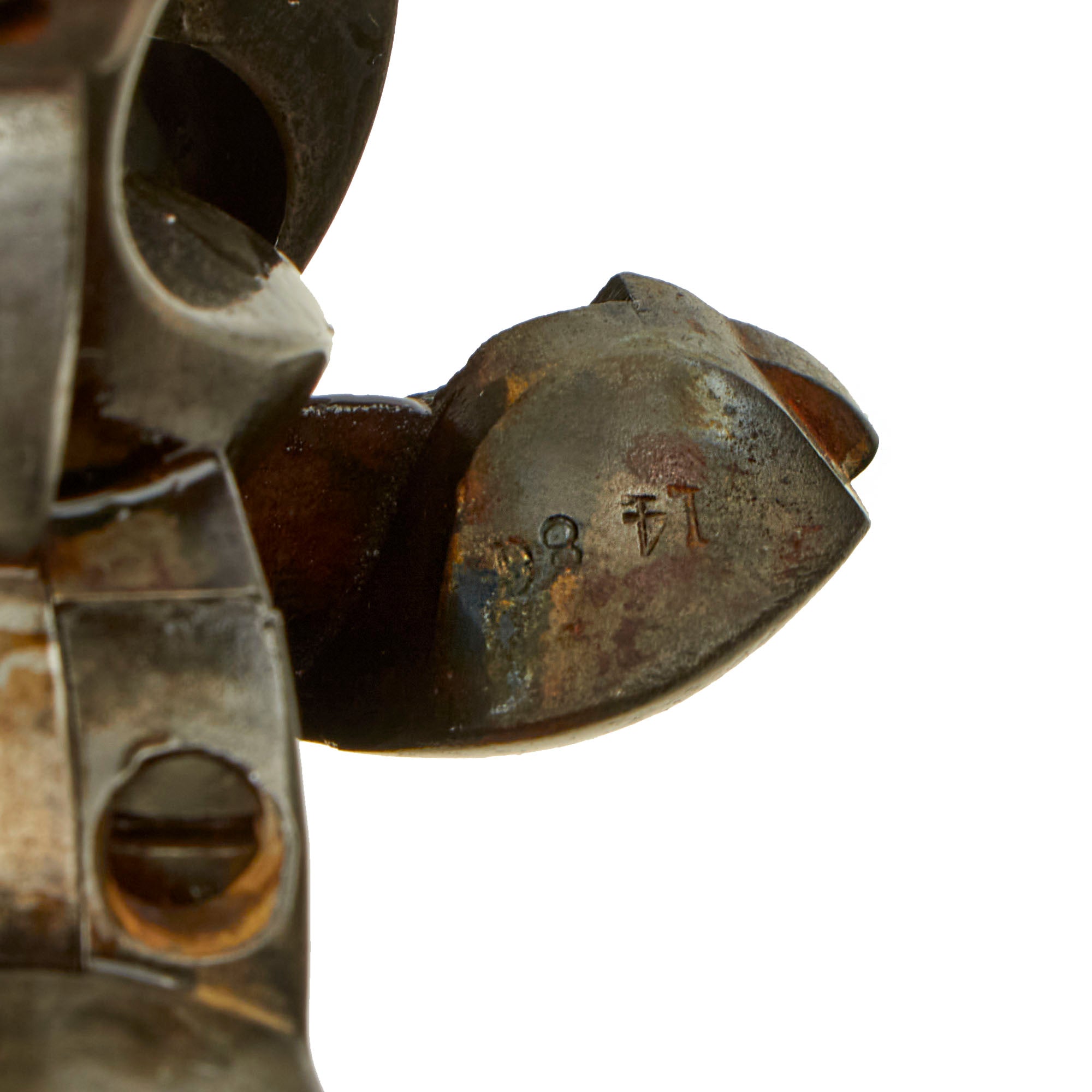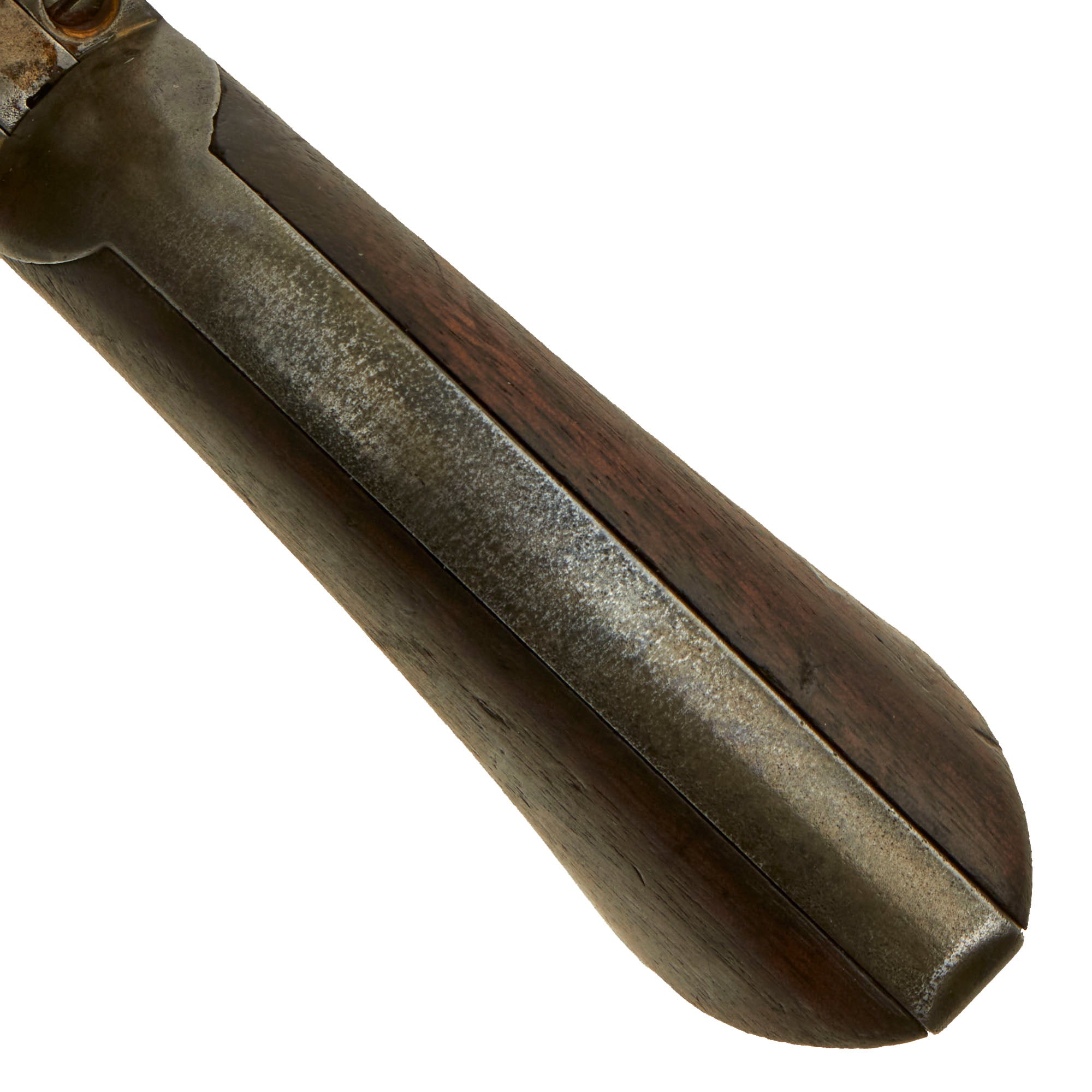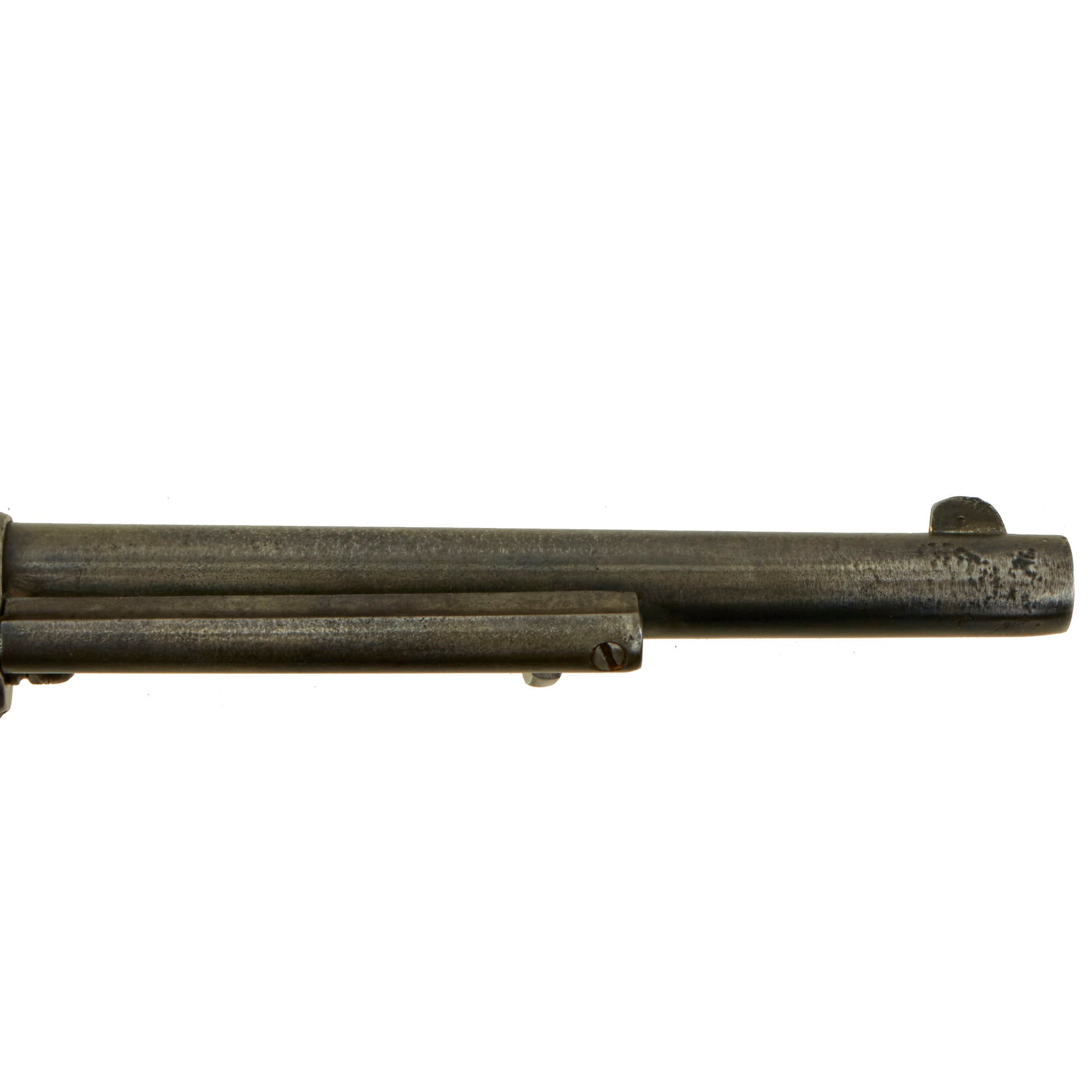Mechanically, the action is smooth, with a good cylinder lock up, and a strong mainspring. The action has all four clicks with a working loading position, and cycles correctly, with just a bit of wobble in the cylinder when locked. As with all revolvers of this age we recommend being very gentle with cycling it, so we do not recommend "fanning" or "fan firing". The bore is in very good condition, still showing clear rifling and a partly bright finish. There is definitely wear and past fouling and oxidation, but overall it's definitely in very good shape for a frontier used black powder revolver. The ejector door swings open easily, and the ejector itself works well, though it can be a bit difficult to move at times. Overall this is a great pistol with loads of patina and history.