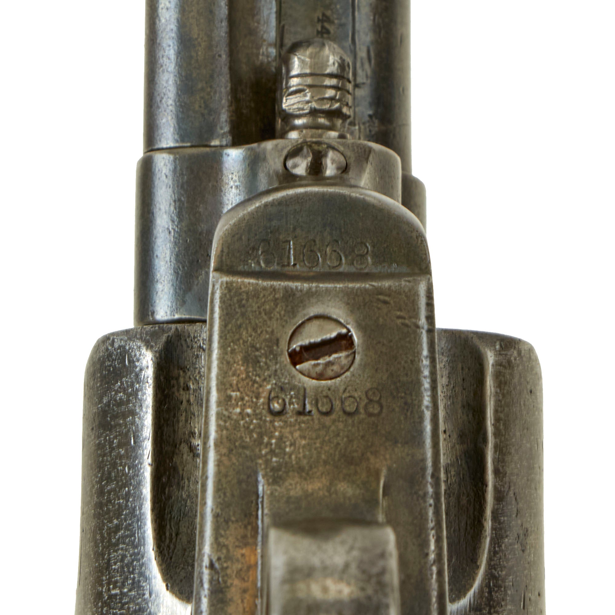 This very nice Colt Frontier Six Shooter SAA (Single Action Army) Revolver has a full length 7 ½" barrel, with a lovely worn gray patina on the metalwork and walnut grip. This definitely looks to be an example that saw long use on the frontier, giving it an impossible to duplicate look! The revolver's serial number is 61668, which dates production to 1880. It has the serial number on the frame, trigger guard, grip frame, and even 1668 on the barrel under the ejector. The serial number on the cylinder has unfortunately been worn away, but it definitely looks to be original to the revolver. That makes this a very nice "Mostly Matching" example, and we do not believe any parts have been swapped out over the years. In 1883, Colt would stop marking the cylinders until 1912, mostly due to how often they wore away. There is also assembly number 1486 marked on the loading gate. It is in full working order and condition, with a great well patinated look, sure to delight any "Old West" Americana collector.