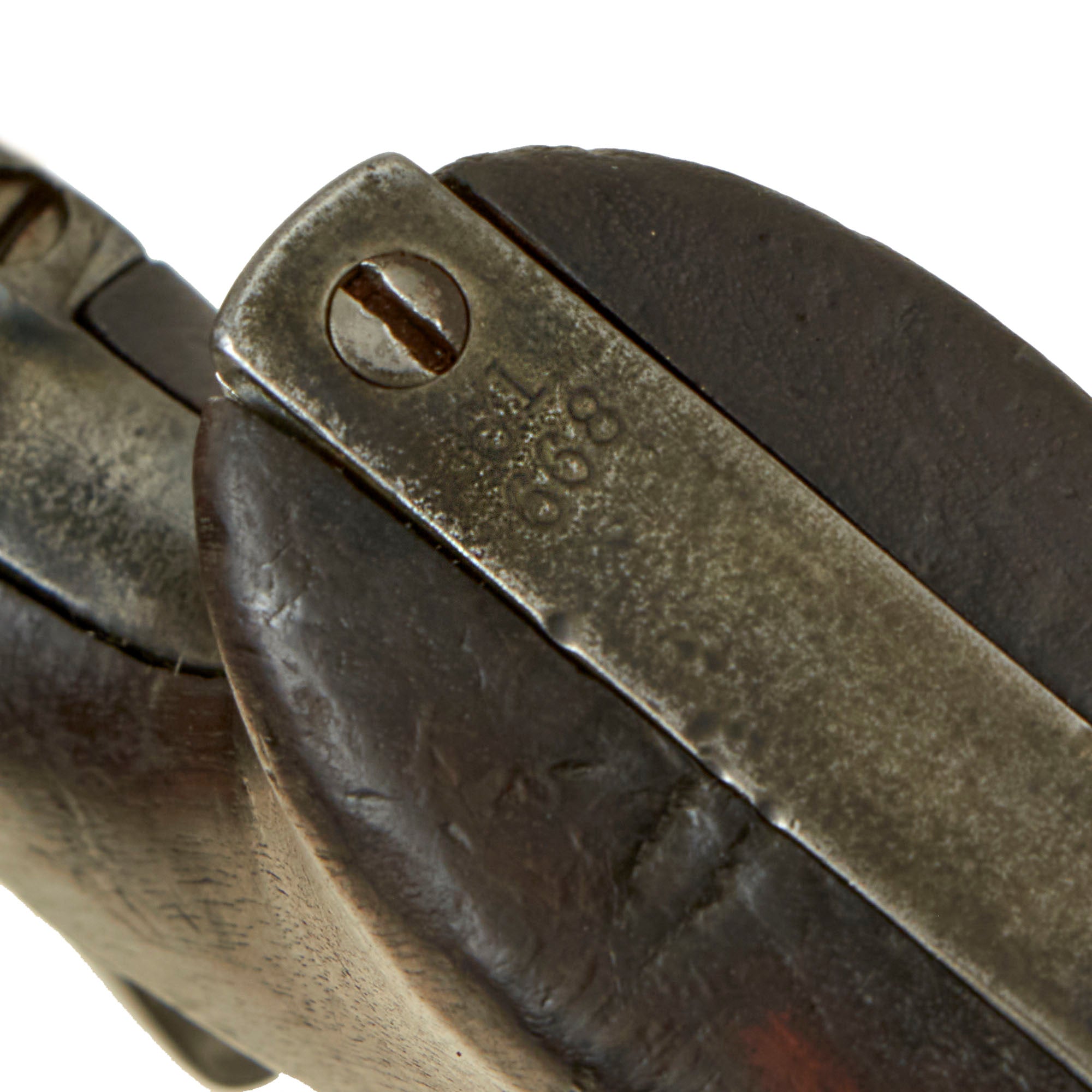 The revolver presents beautifully, and really has the look of a sidearm that was "really there" in the old west. The gray patina is lovely, showing much use, servicing, and cleaning during its life. There is just a bit of past peppering in areas, but no major oxidation or scale rust. The walnut grip has a lovely dark color, and is still firmly inside the frame. It does not show any major damage, just the usual wear around the bottom.