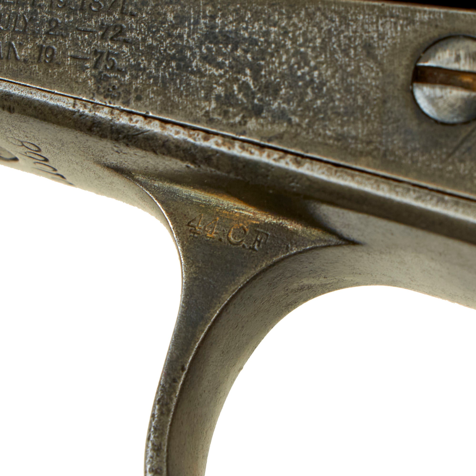 The trigger guard is clearly stamped 44.CF. on the side, indicating the .44-40 WCF caliber, and there is also a 44 on the bottom of the barrel in front of the base pin. The "Frontier Six Shooter" model was almost identical to the .45 "Long Colt" chambered Single Action Army model, except that it was designed for Winchester .44-40 ammunition, also called .44 W.C.F., which was and is a popular "cowboy" ammunition. While some may question why colt made guns chambered for a competitor's cartridge, having a repeating rifle and revolver that took the same ammunition was a big selling point. We have checked the cylinder with a real cartridge and confirmed the caliber.