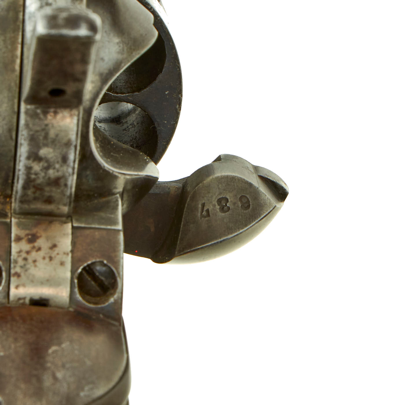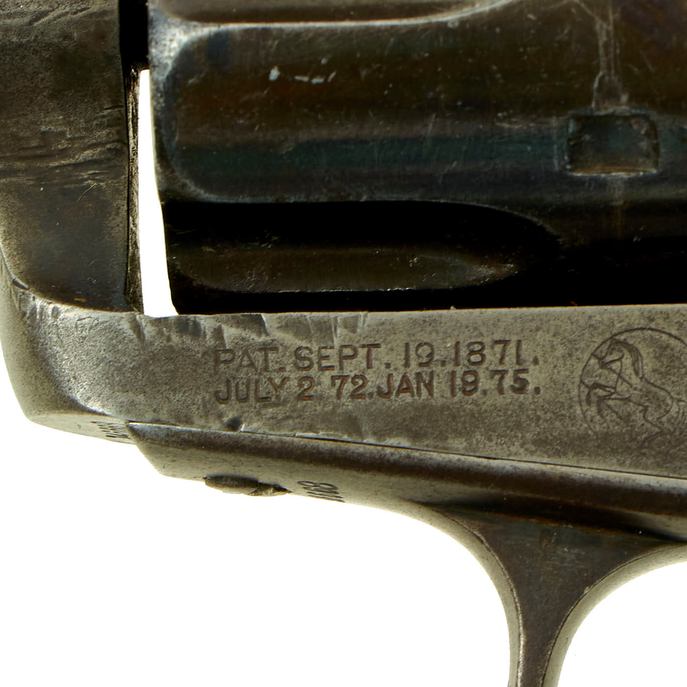 The revolver is in very nice "frontier used" condition, sure to delight any Americana Collector. The original blued finish has faded to a lovely gray patina over most of the gun, except for the replaced barrel, which still shows much blued finish, though it looks like it was refinished prior to fitting on the gun, which made the markings faint in areas. The hard rubber Colt grips show the "prancing pony" logo clearly, with lots of the original checkering still present. The surface has faded to brown in many areas, a process that takes decades to achieve. It is in full working Order and Condition, showing a gorgeous patina of age.