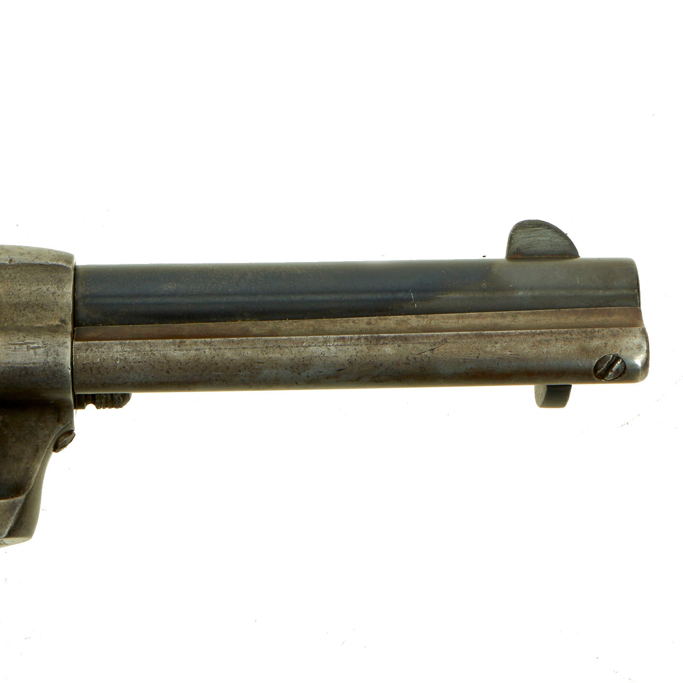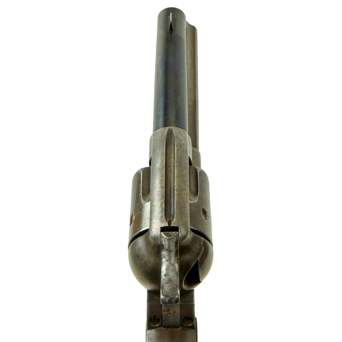 As indicated in the letter, this revolver shipped with a 7 1/2" barrel, not a 4 3/4" barrel, and close examination of the muzzle crown and markings shows us that the current barrel is a period replacement. The original barrel may have been damaged or became excessively worn, or possibly the owner wanted an original "shark fin" front sight and not a replaced one.