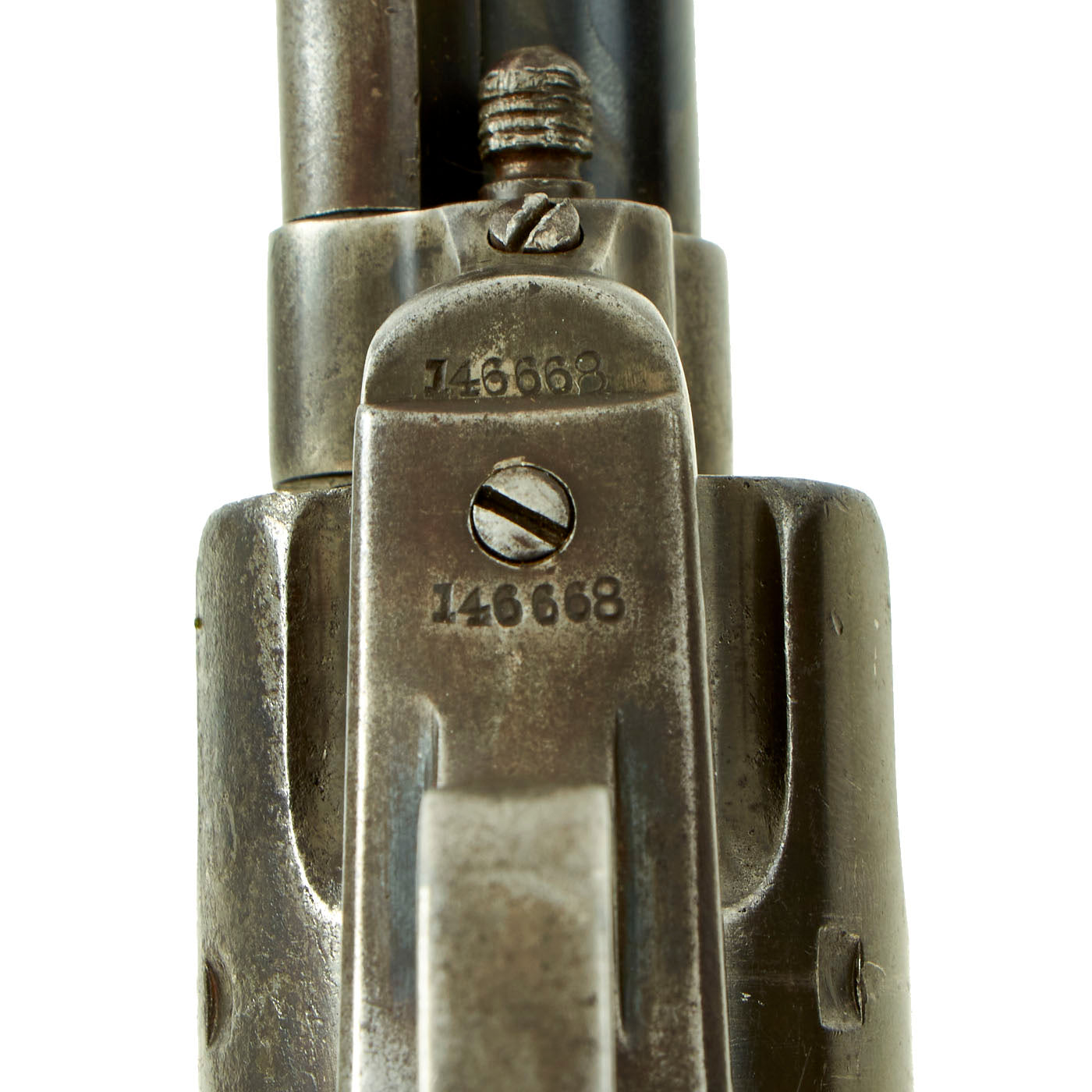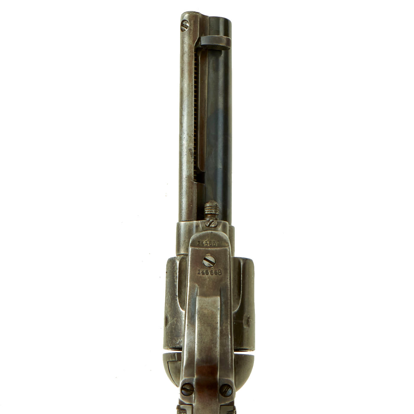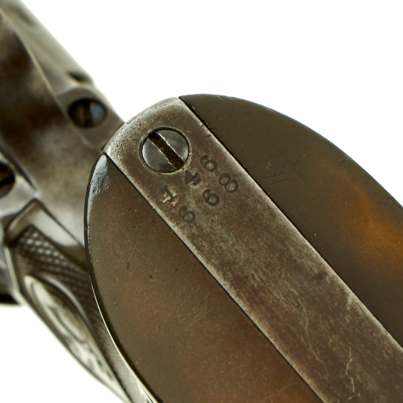 Original Items: Only One Set Available. This is it! Every young "Old West" fans dream: A real Colt Cowboy Six-shooter! This very nice Colt Frontier Six Shooter SAA (Single Action Army) Revolver has a "Gunfighter Length" 4 3/4" barrel, and very nice original Colt logo hard rubber grips! The revolver's serial number is 146668, which is MATCHING on the frame, trigger guard, and grip frame, with assembly number 637 on the loading gate. As this revolver was made after 1883, the cylinder on this example was never marked with a serial number.