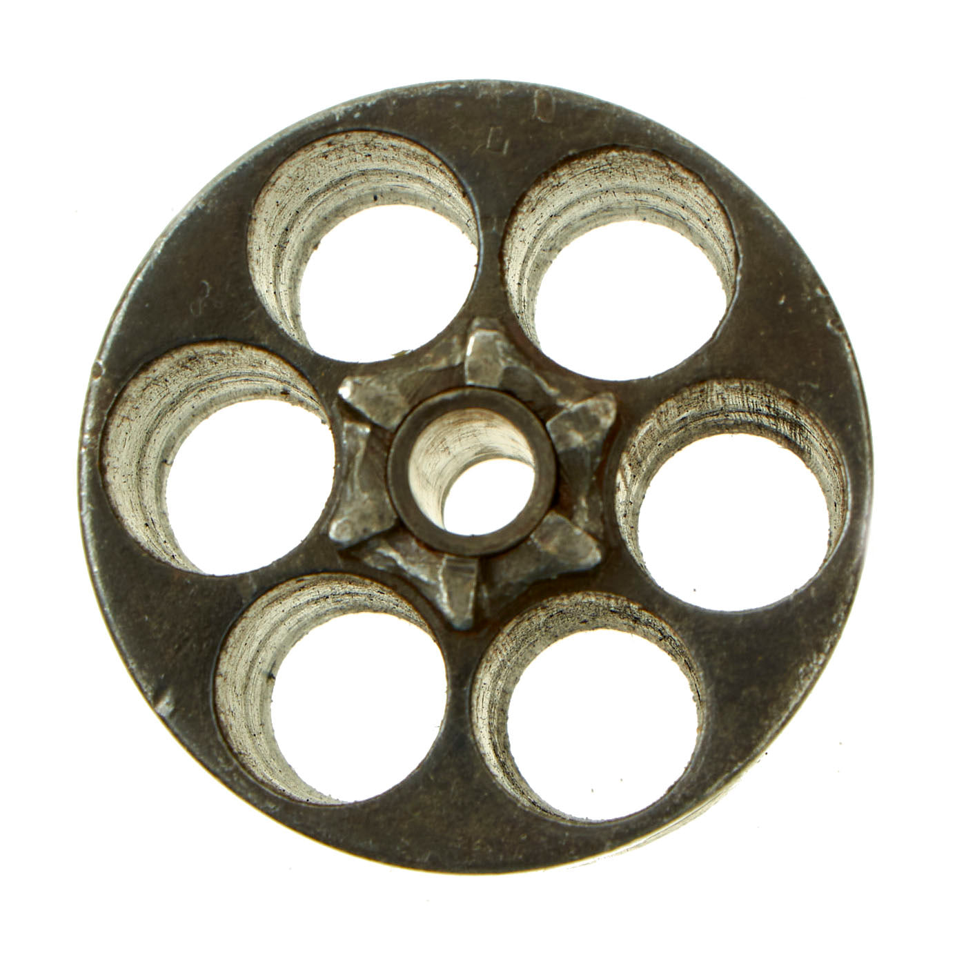 Mechanically, the action is smooth, with a good cylinder lock up, and crisp dry fire. The cylinder base pin slides out easily, allowing the cylinder to be removed for cleaning and inspection. The action has all four clicks with a functional loading position, and we have not noticed any of the usual finicky behavior of old revolvers. Really a great action on this example. The ejector door swings open easily, and the ejector itself works flawlessly. The bore is in very good condition, with clear lands and grooves and a mostly bright finish. There is some oxidation closer to the muzzle, so this barrel is definitely not brand new.
